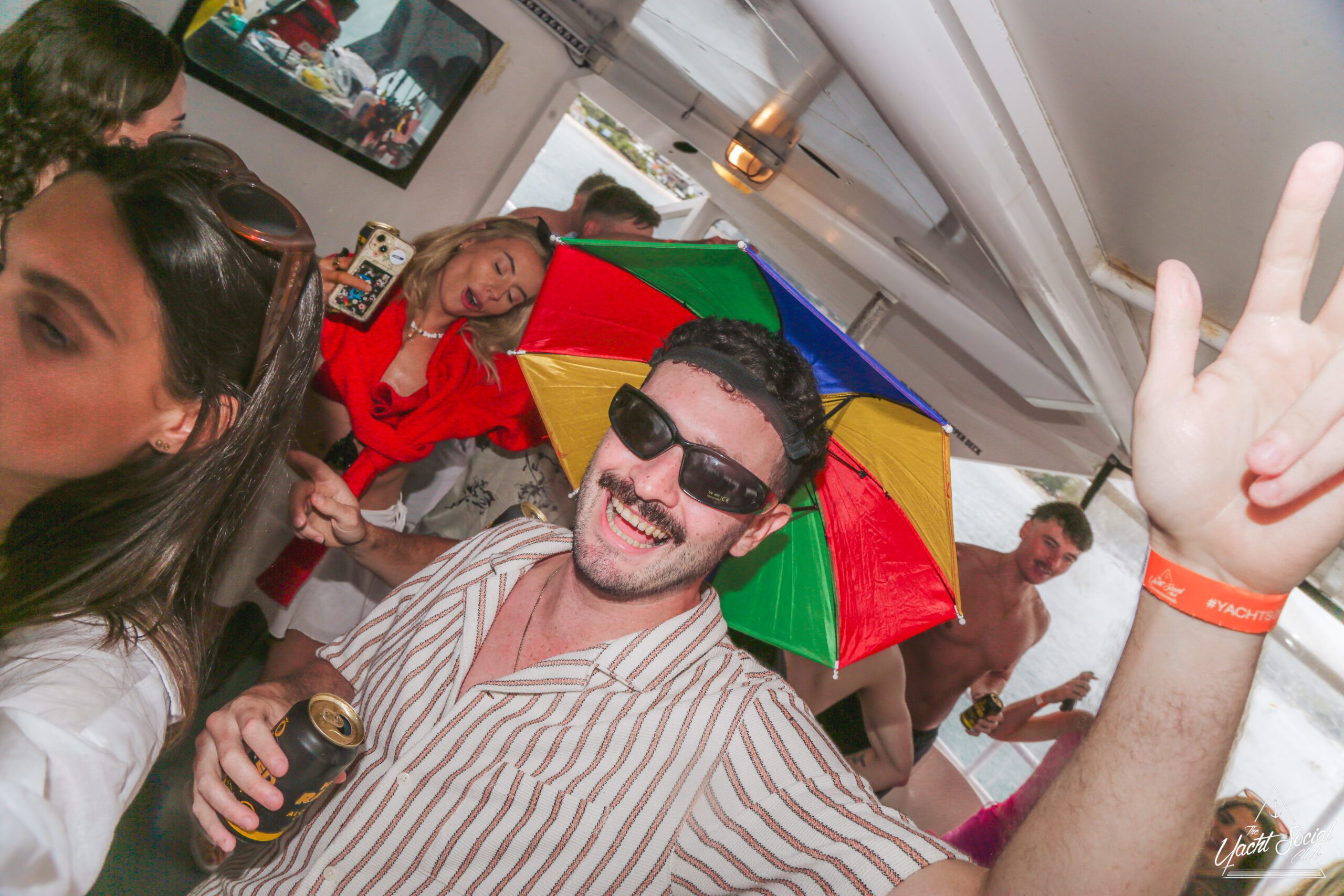 A group of people in swimsuits enjoy a boat party on the water; a man in the center wears a rainbow umbrella hat, holds drinks, and smiles with arms raised. Others chat, eat, and wear sunglasses and hats.