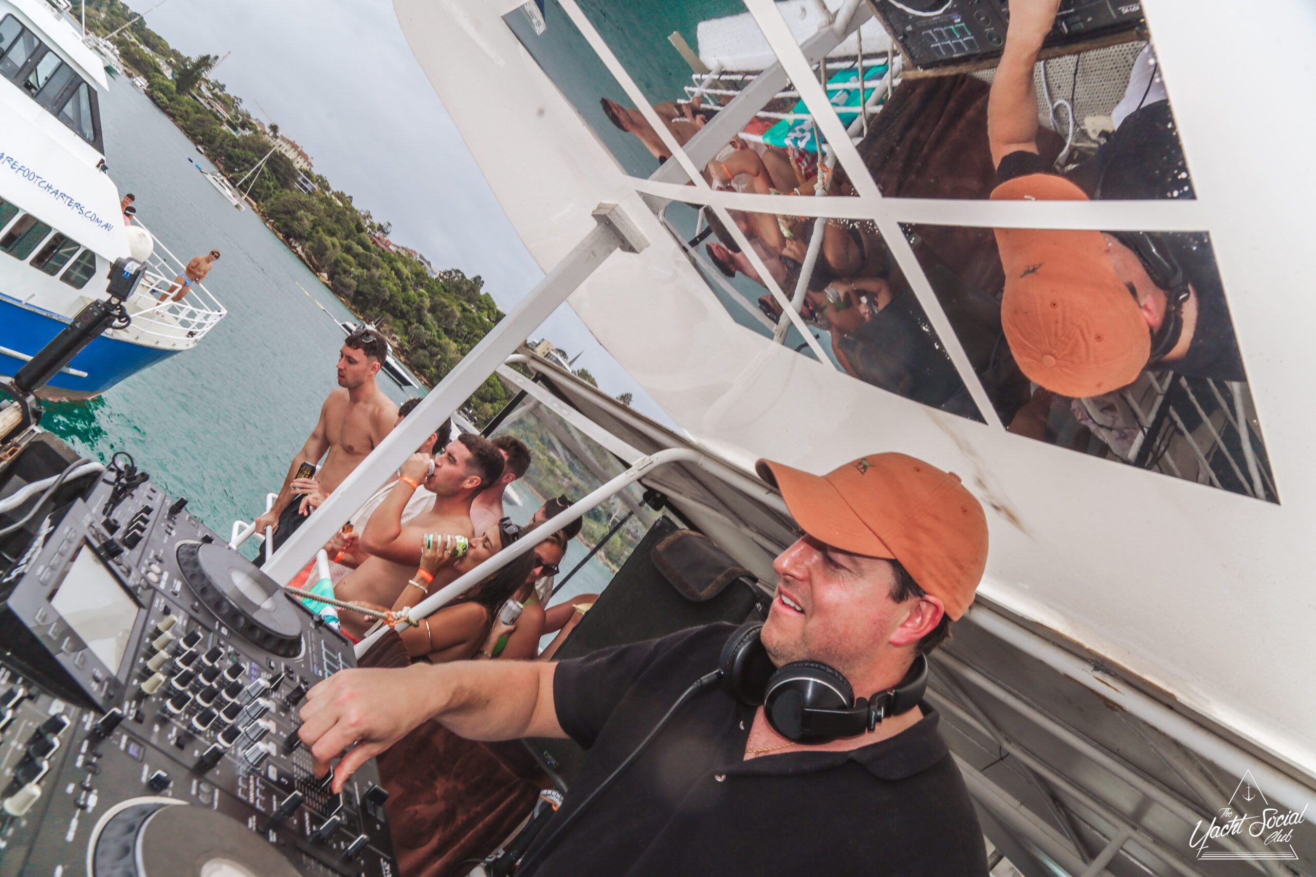 A DJ in a brown cap and black shirt plays music on a boat, with headphones around his neck and people dancing in swimsuits behind him. The scene is reflected in the boat's ceiling. Water and another boat are visible nearby.