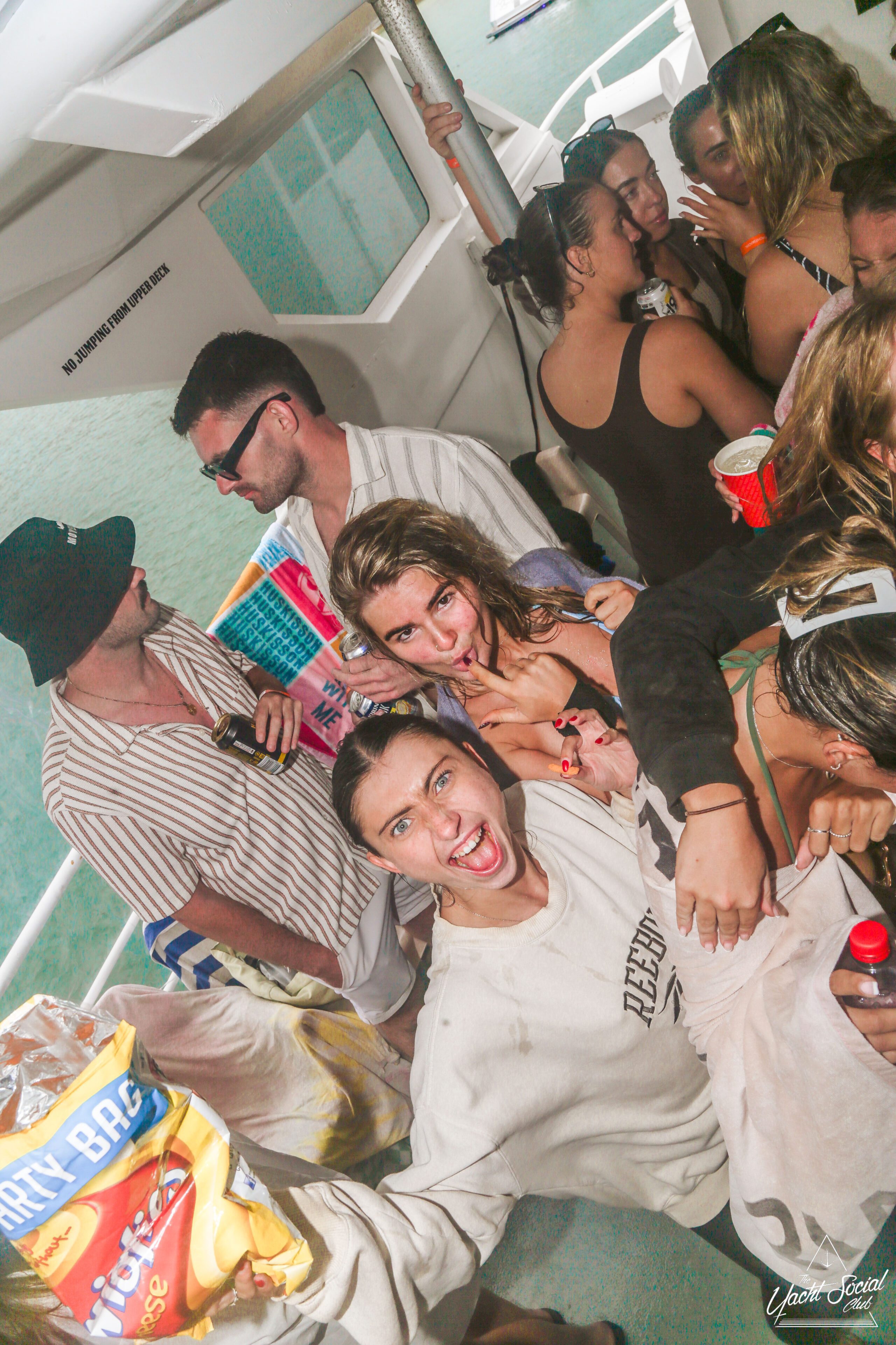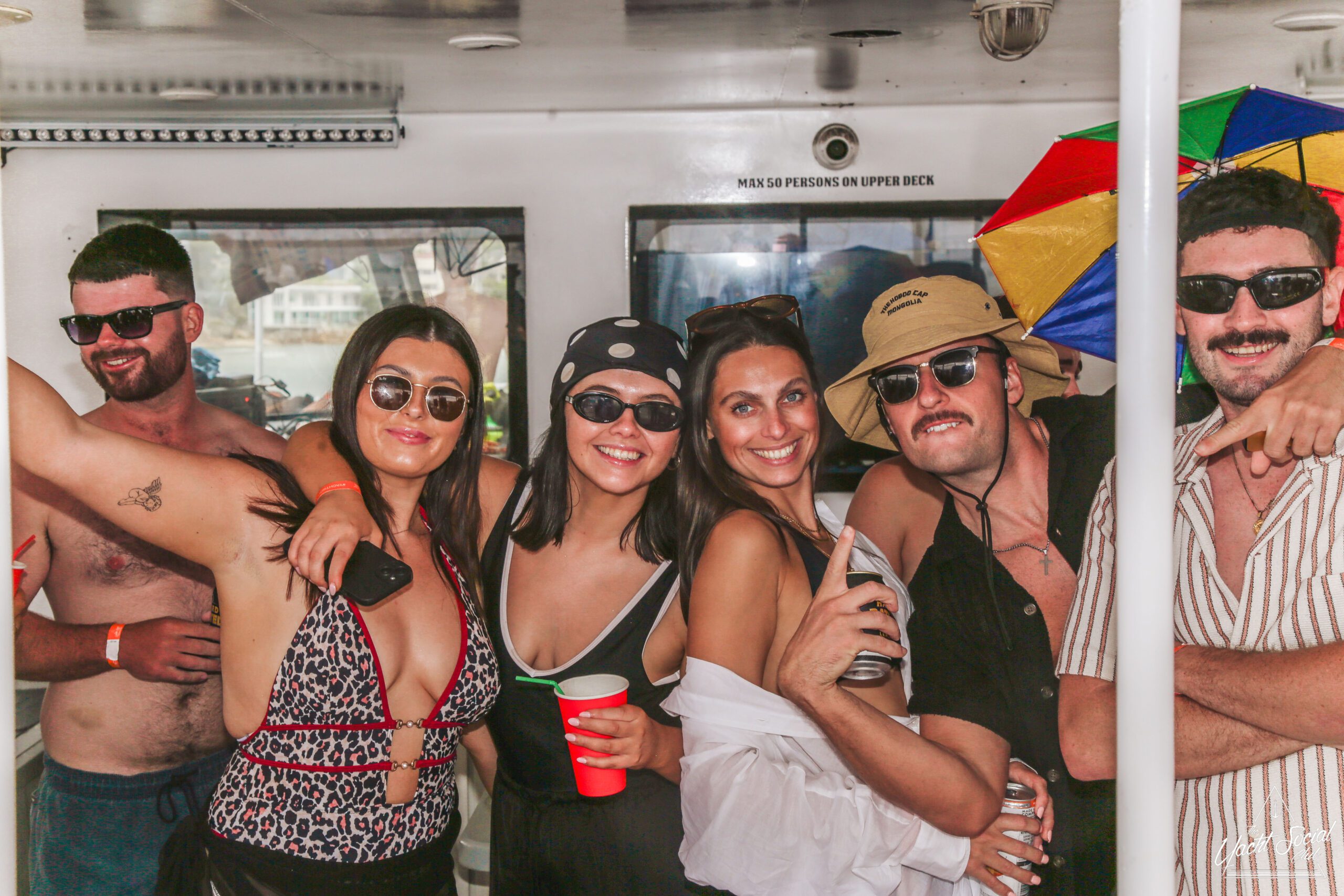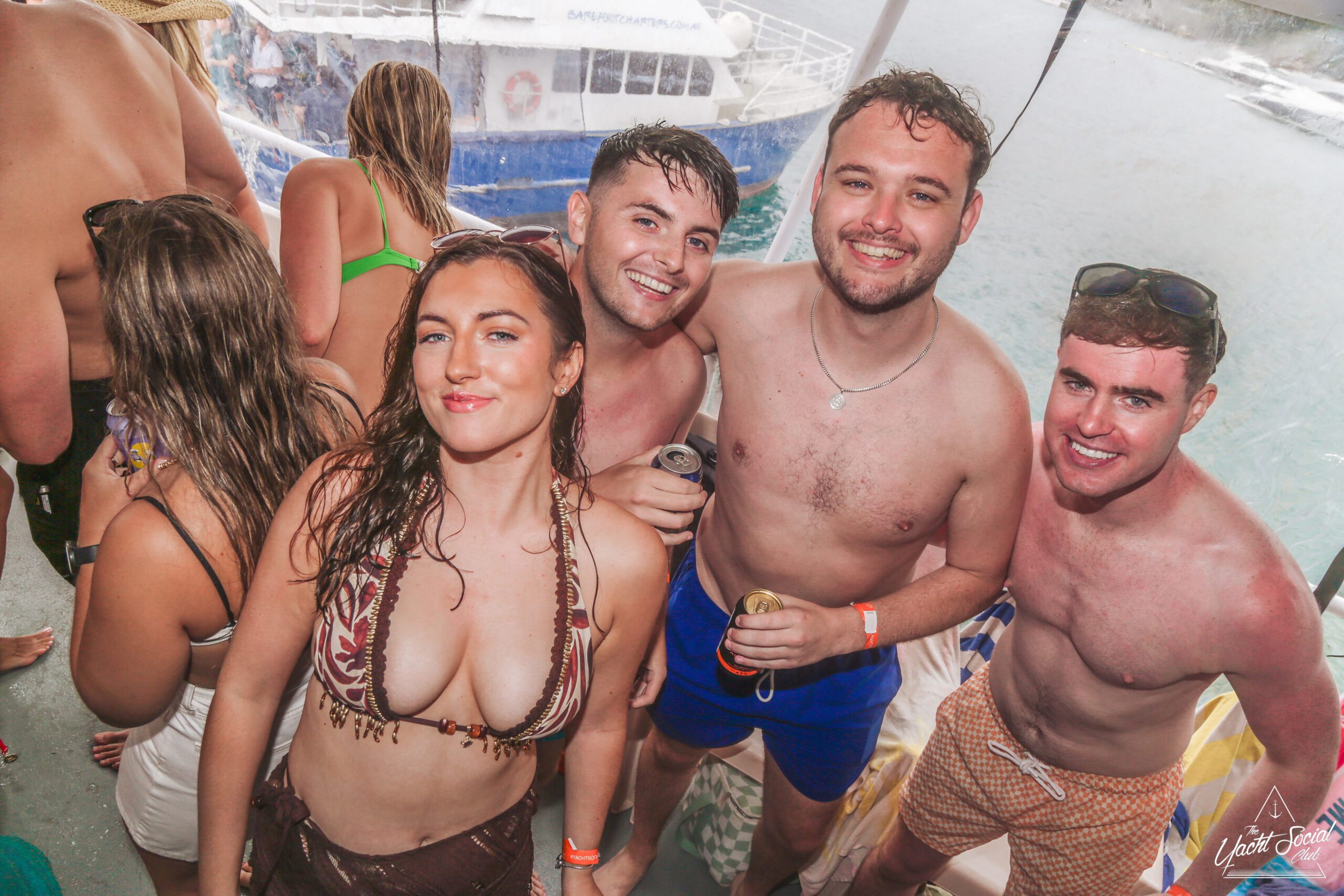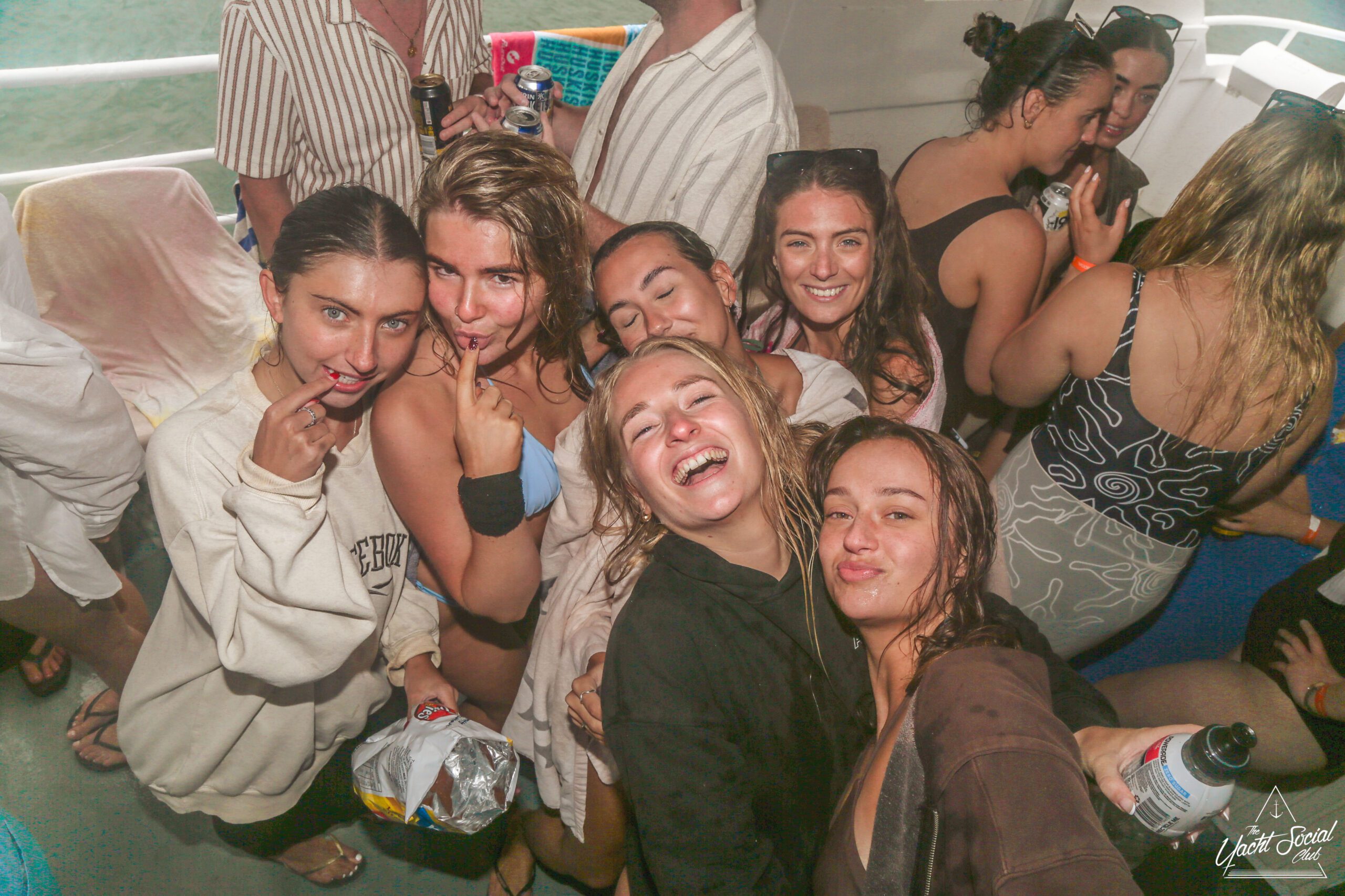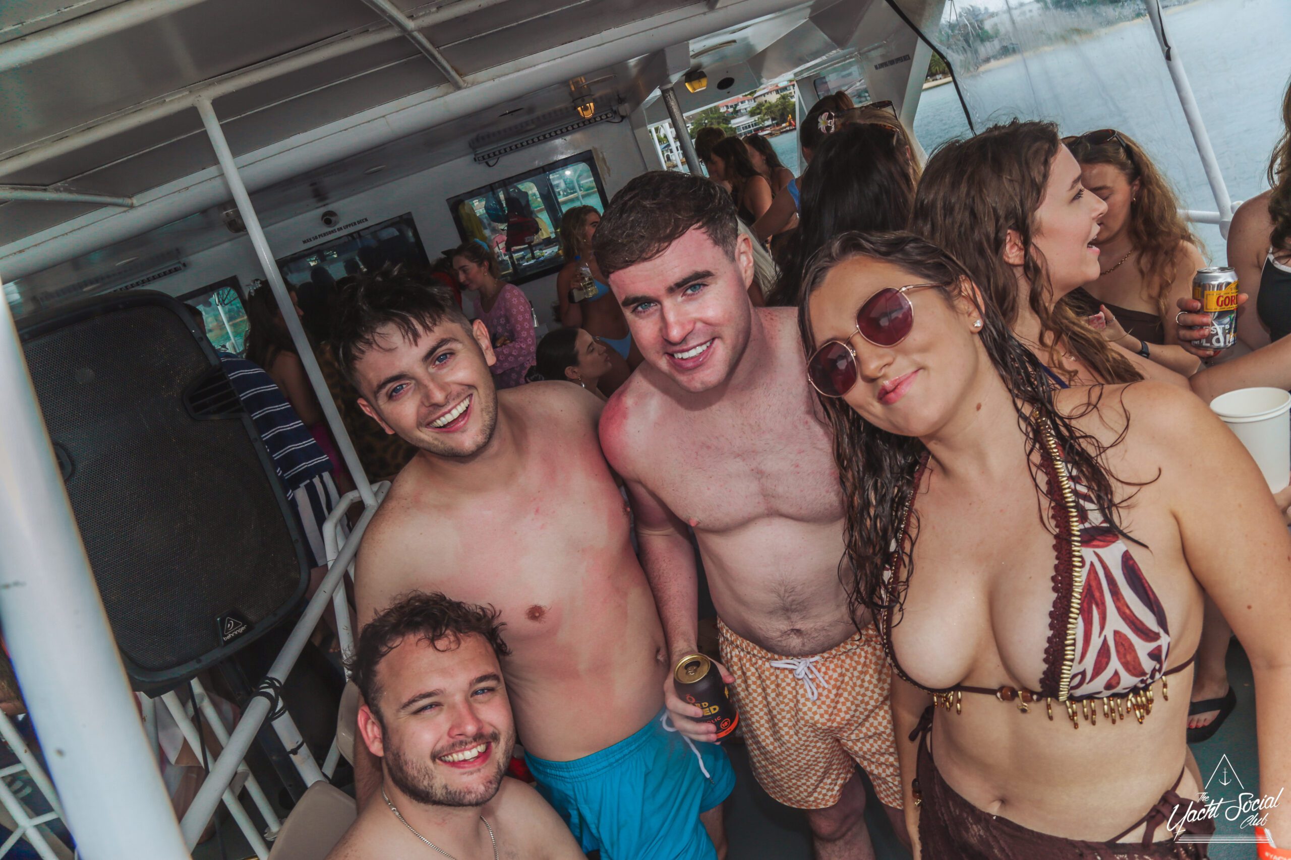 A group of young adults in swimsuits smile and pose together on a crowded boat party, surrounded by others enjoying drinks and socializing.