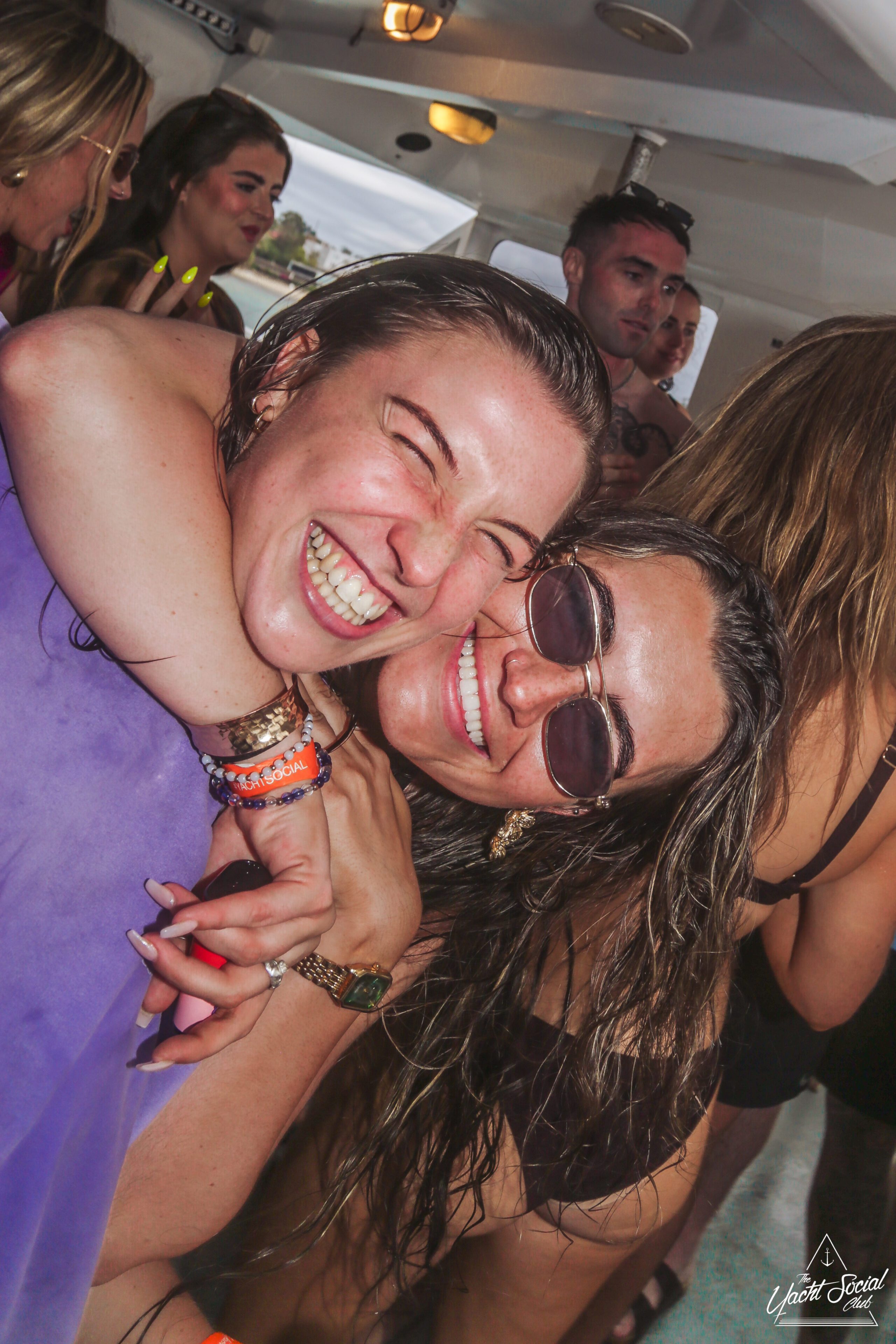 Two women in swimsuits laugh and pose together on a boat, holding drinks with a body of water and a boat in the background. People and bags are visible around them, creating a lively and joyful atmosphere.