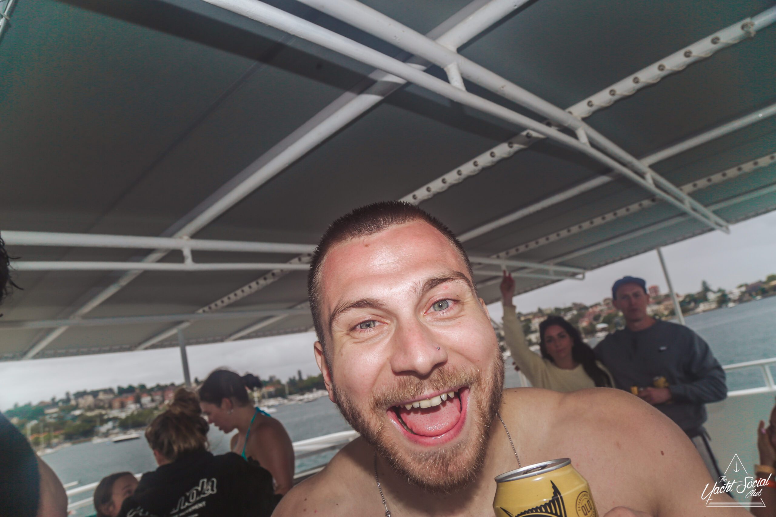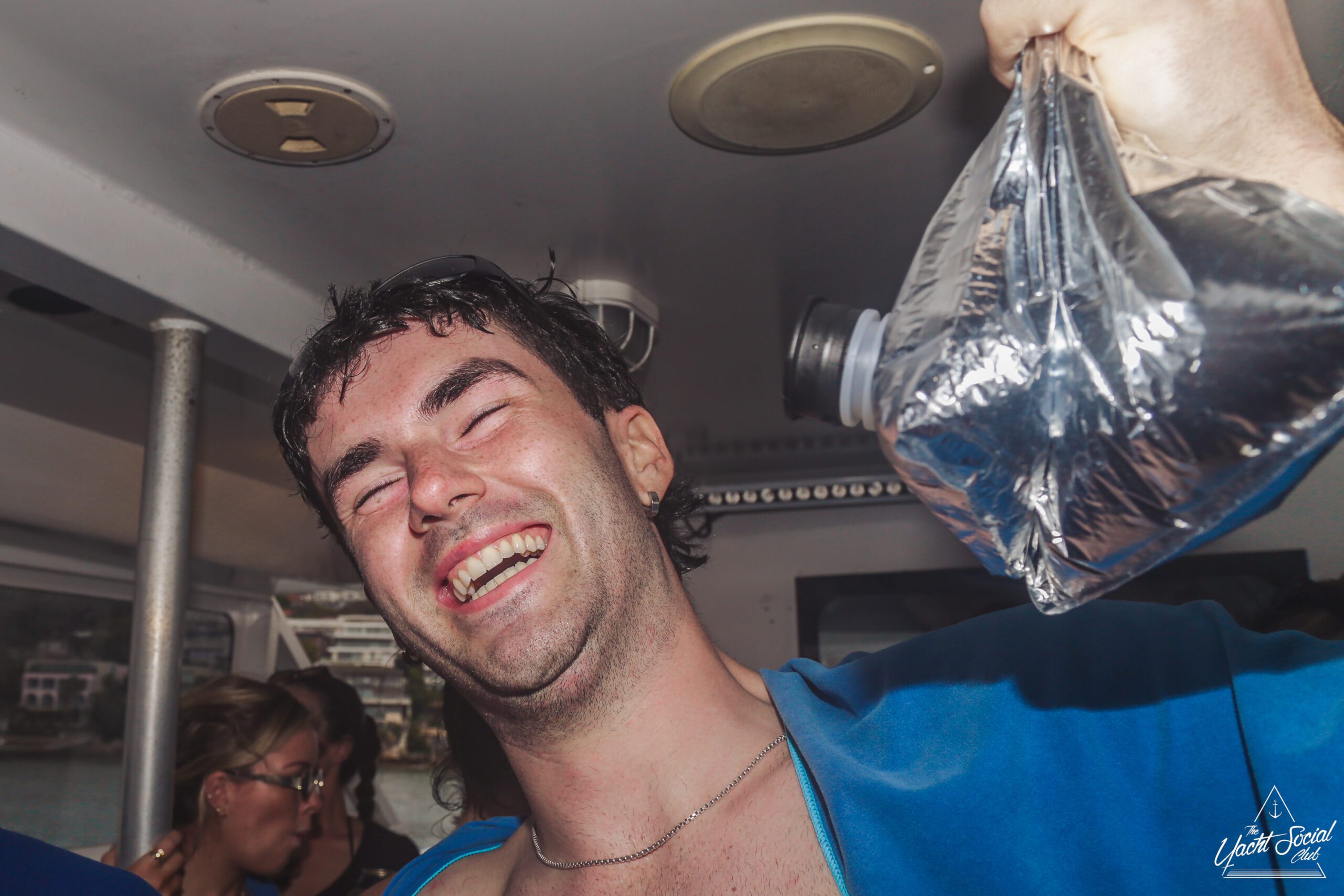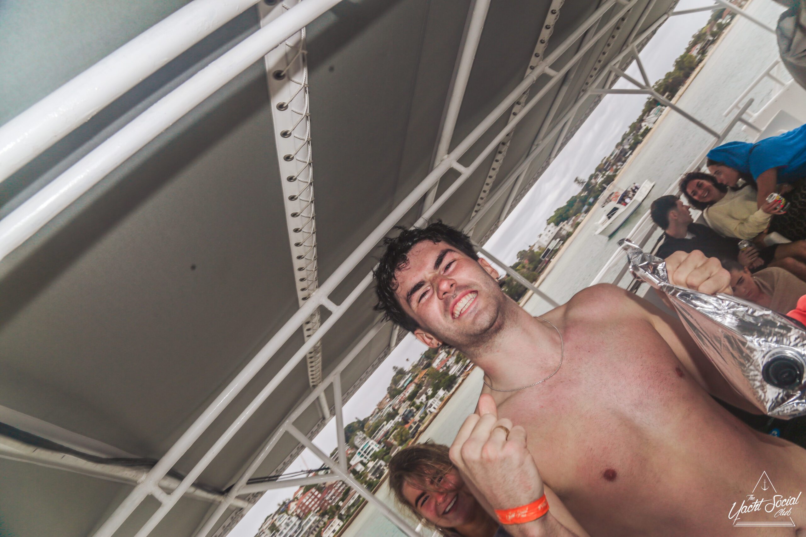 A smiling, shirtless man holding a can poses in the foreground on a boat with people and water visible in the background under a covered deck. The mood is lively and festive.