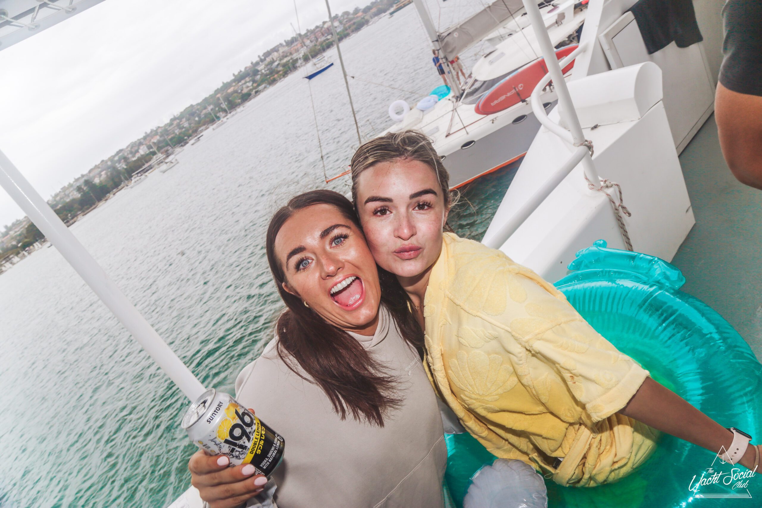 Two young women smile and pose on a boat. One wears a beige top and holds a can, while the other wears yellow and sits on a blue pool float. Water and other boats are visible in the background.