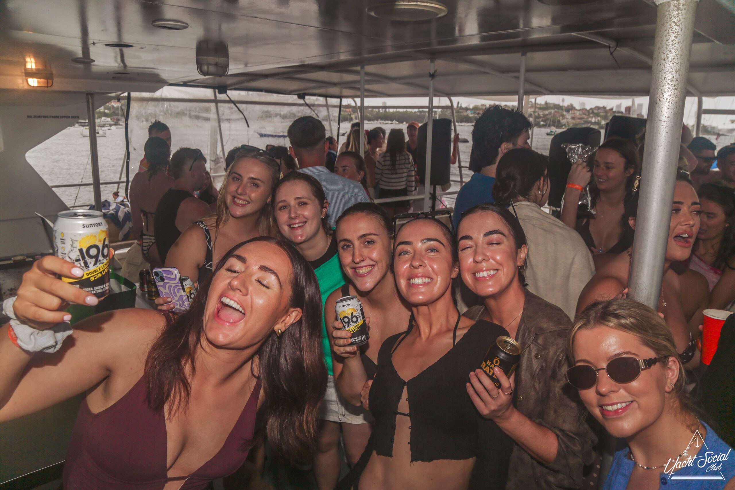 A group of young women smile and pose for a selfie while holding drinks at a crowded boat party. Other people are in the background, and water and buildings are visible through the windows.