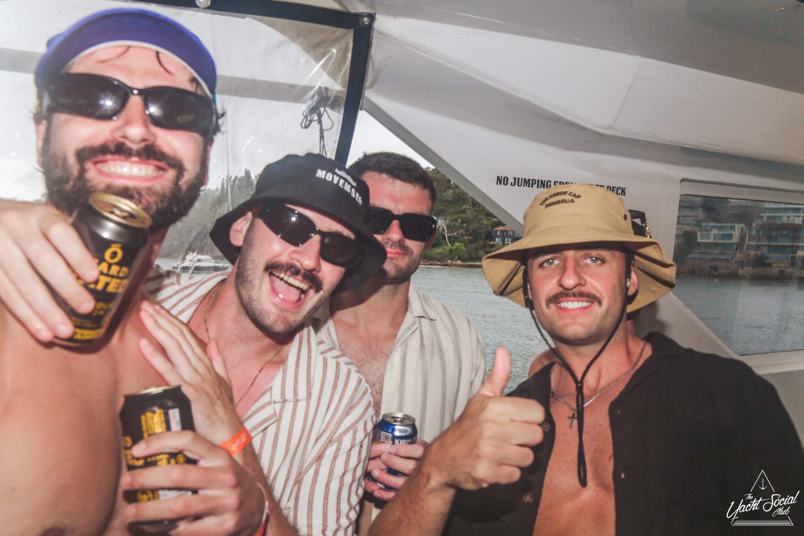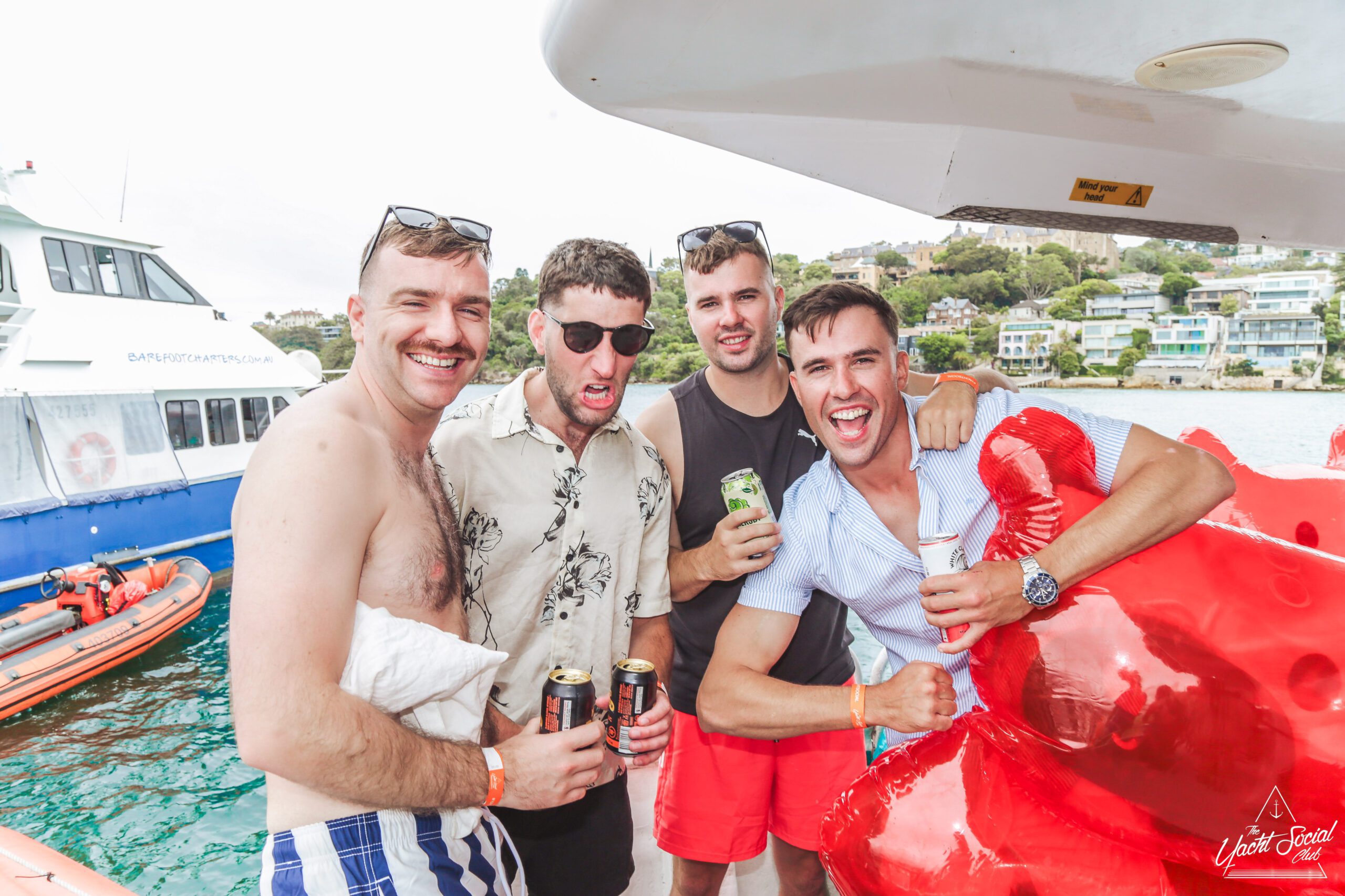 Four young men smile and pose together on a boat, holding drinks. The background shows water, a white ferry, and houses on a hill. One man holds an inflatable red float. The mood is fun and relaxed.