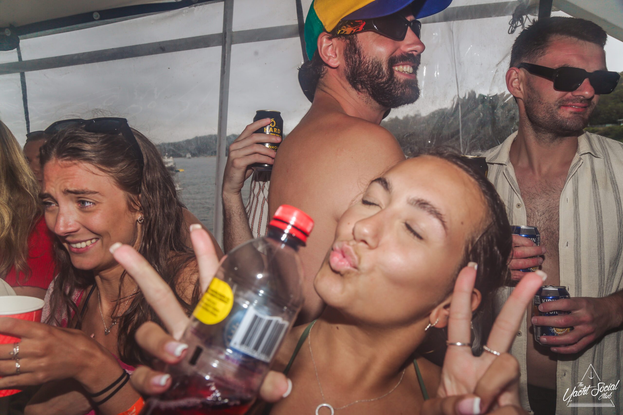 A group of young adults at a lively outdoor party; a woman in the foreground poses with a peace sign and kissing face, while others smile and hold drinks. The setting appears to be a boat or near water.