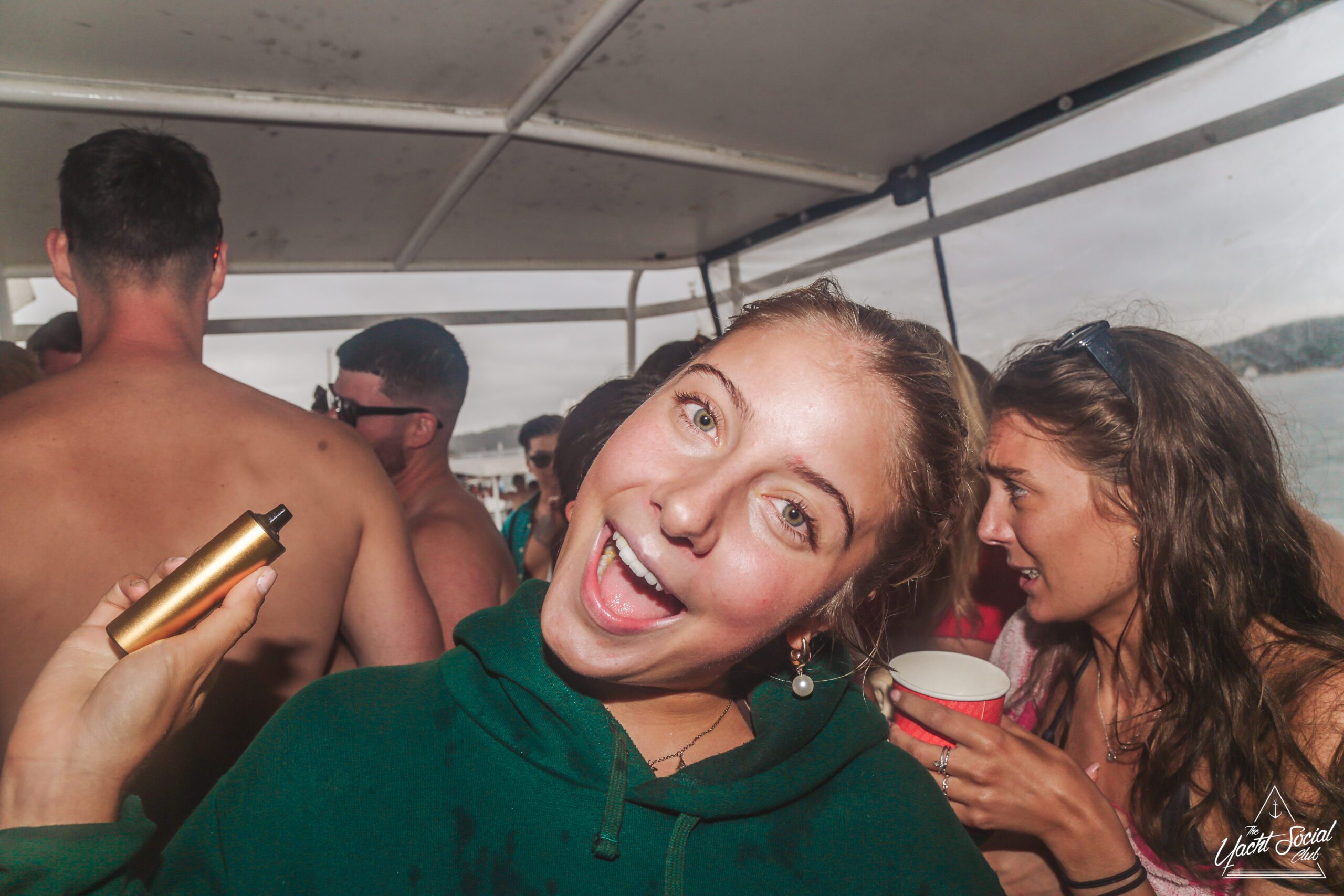 A smiling young woman in a green hoodie poses with a vape on a crowded boat, surrounded by people enjoying a party; some hold drinks, and the background shows water and a cloudy sky.