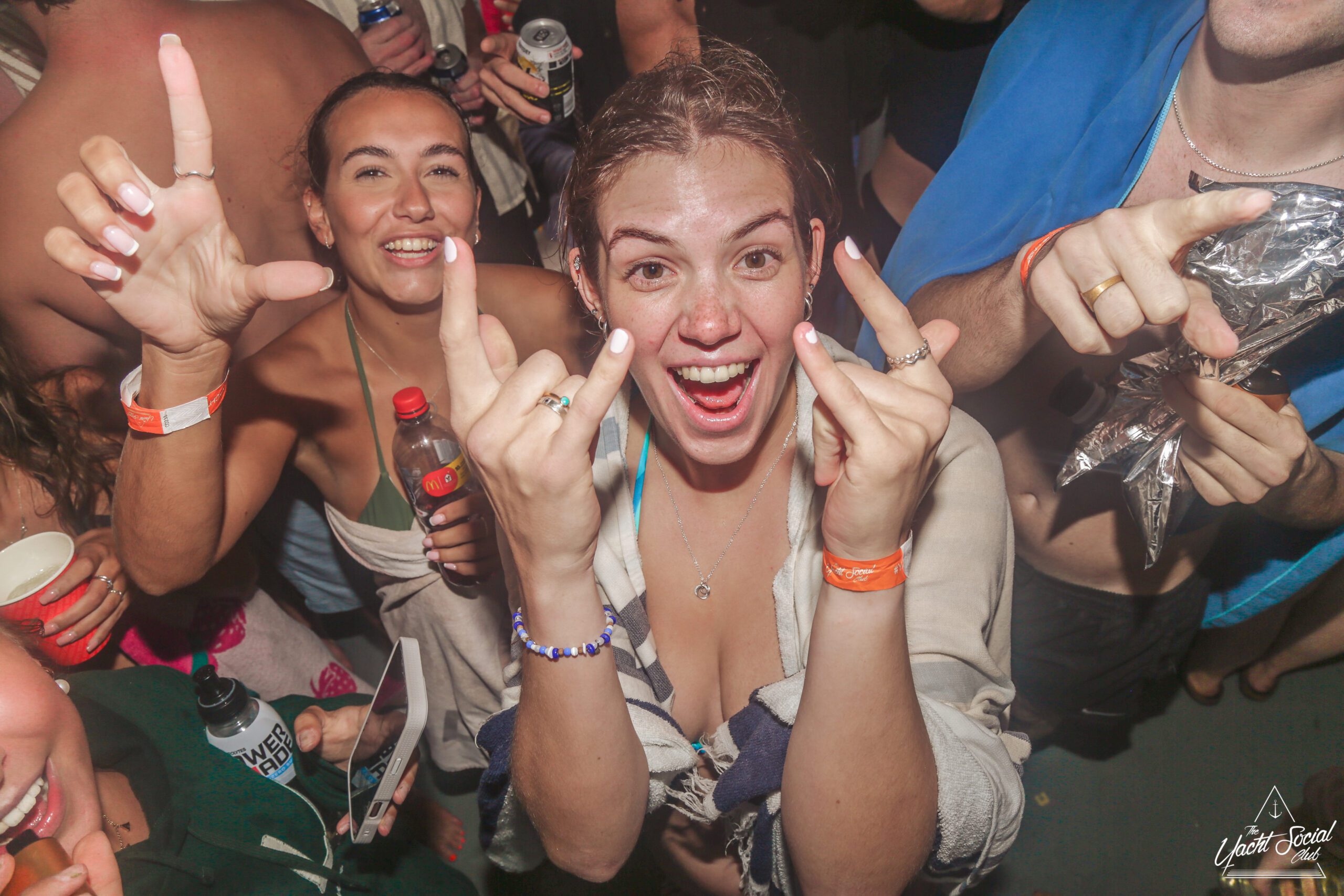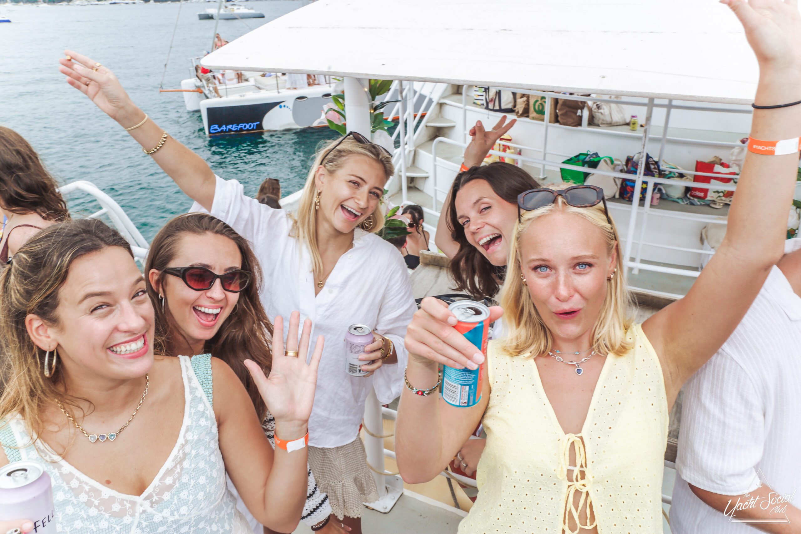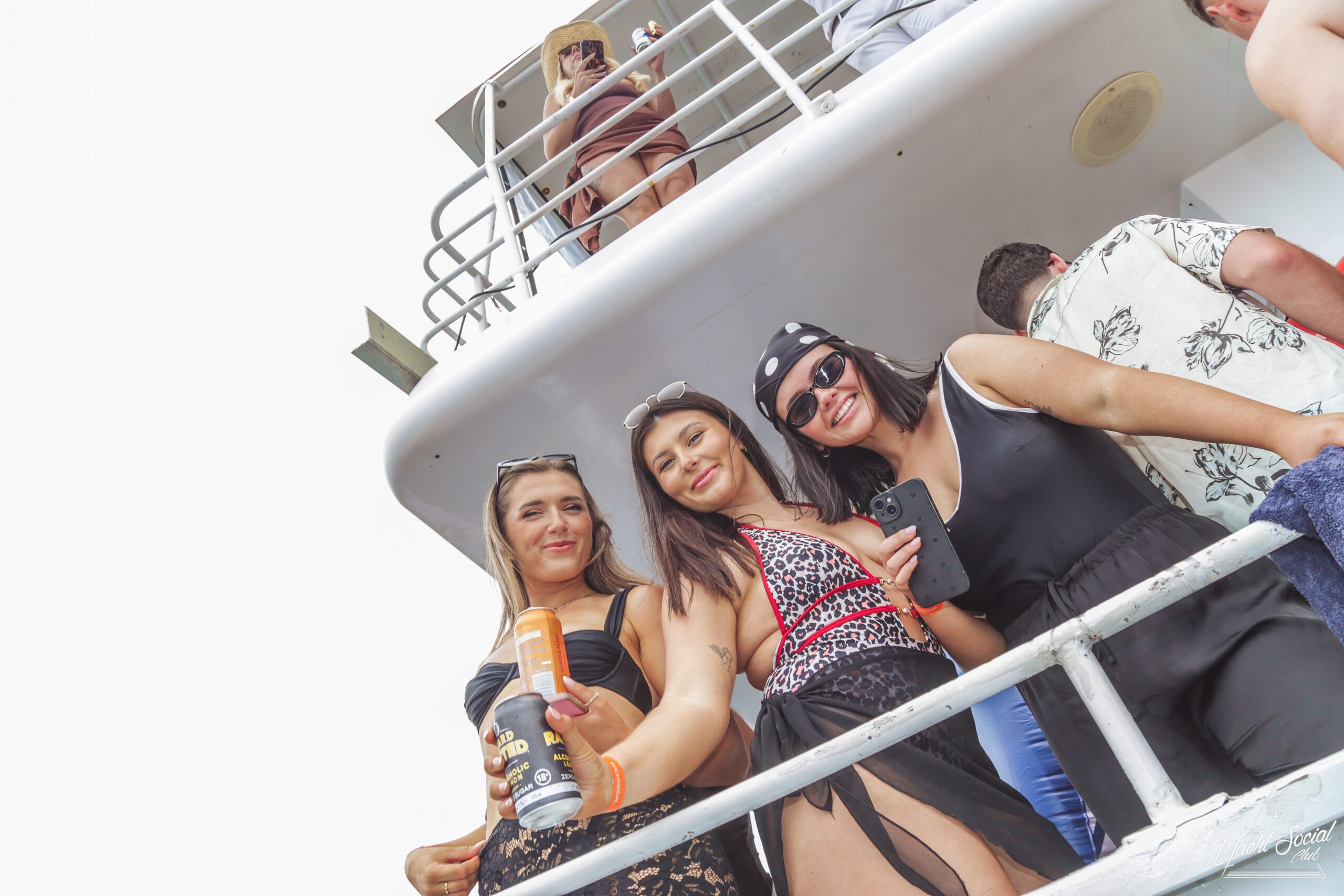 Three women in swimsuits smile and hold drinks on a crowded boat party, surrounded by people, pool floats, and another boat on the water in the background. The atmosphere is lively and festive.