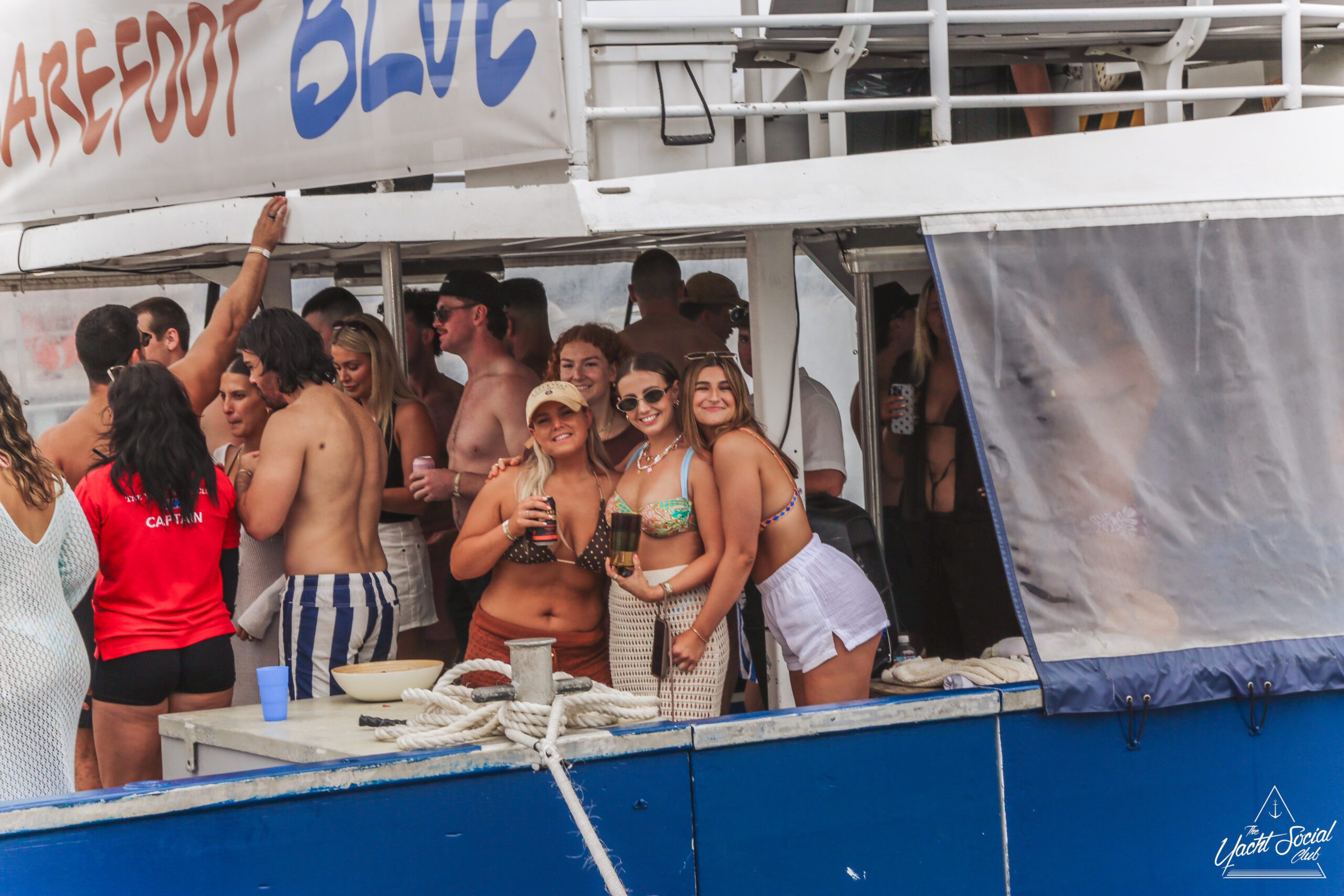 A group of young people in swimsuits are socializing and smiling on the deck of a boat. Three women pose for a photo in the foreground, while others mingle and relax behind them. The boat has a sign reading "Barefoot Blue.