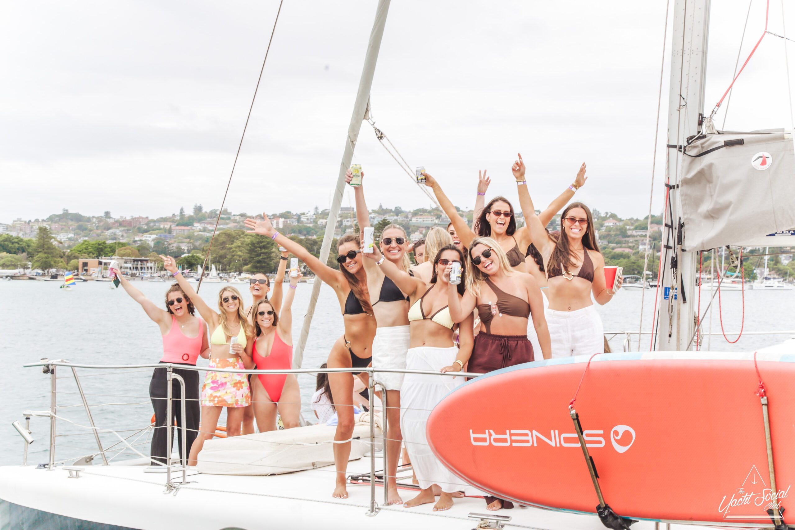 A group of women in swimsuits smile and wave on a yacht, enjoying a sunny day on the water. Some hold drinks, and others pose for the camera. Land with trees and buildings is visible in the background.