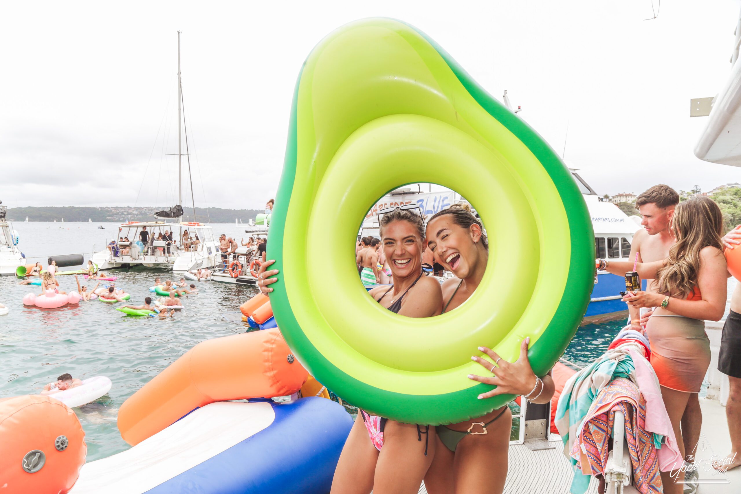Two women in swimsuits smile and pose together through a giant inflatable avocado at a lively dockside pool party, with people, boats, and more floaties in the background.