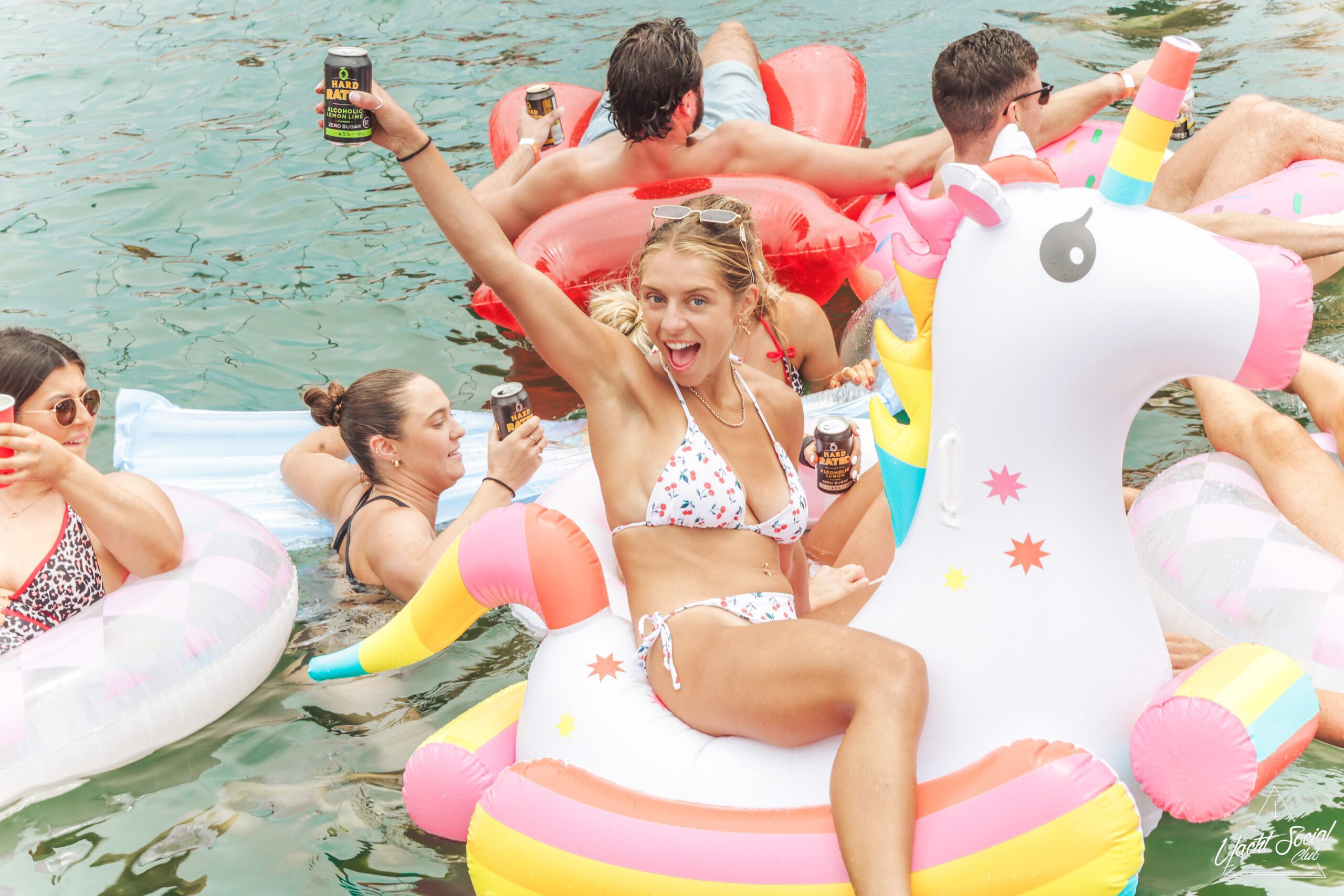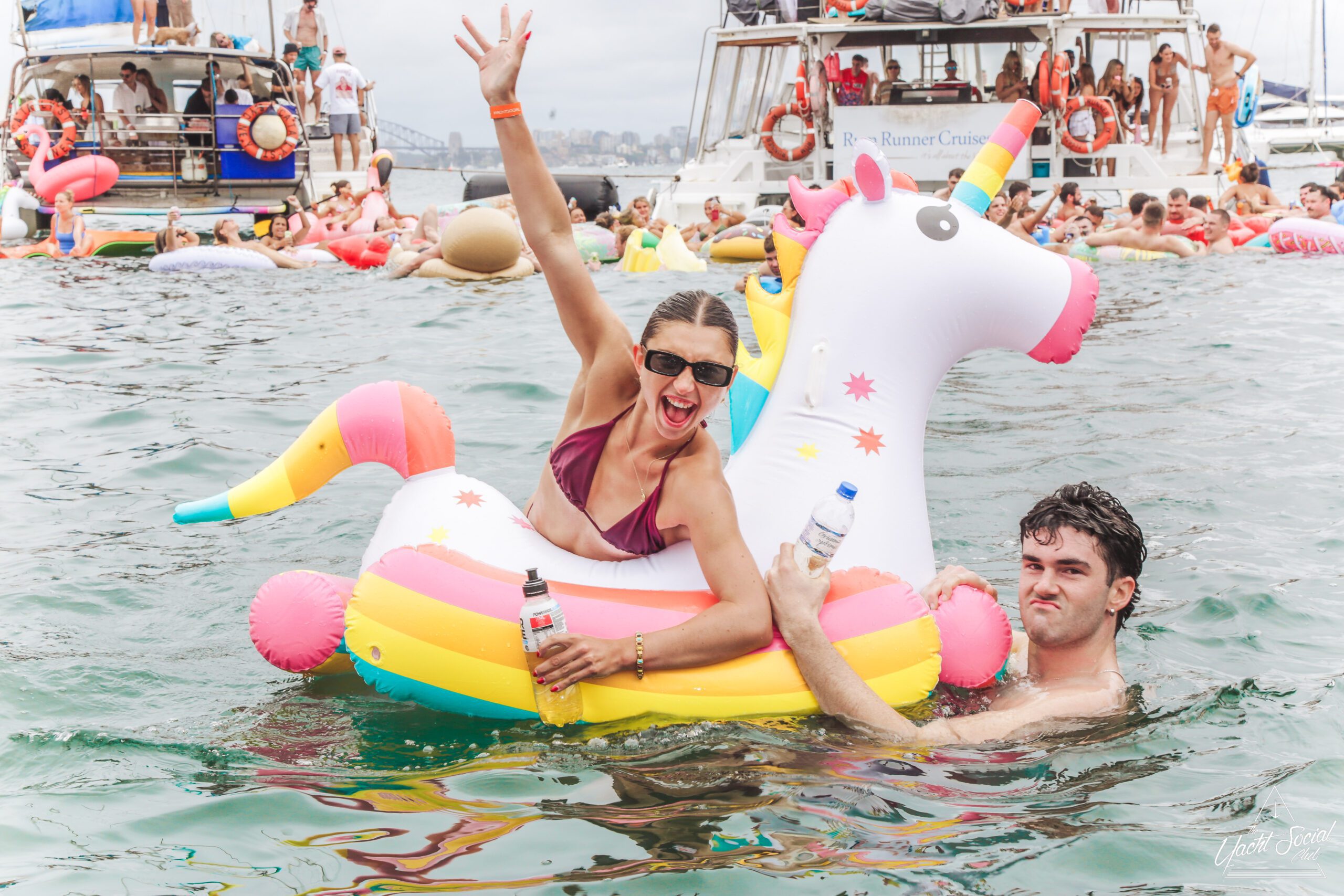 A group of women in swimsuits enjoy a lively boat party, some holding drinks and inflatable pool floats, with a unicorn float in the foreground and another boat visible on the water nearby.