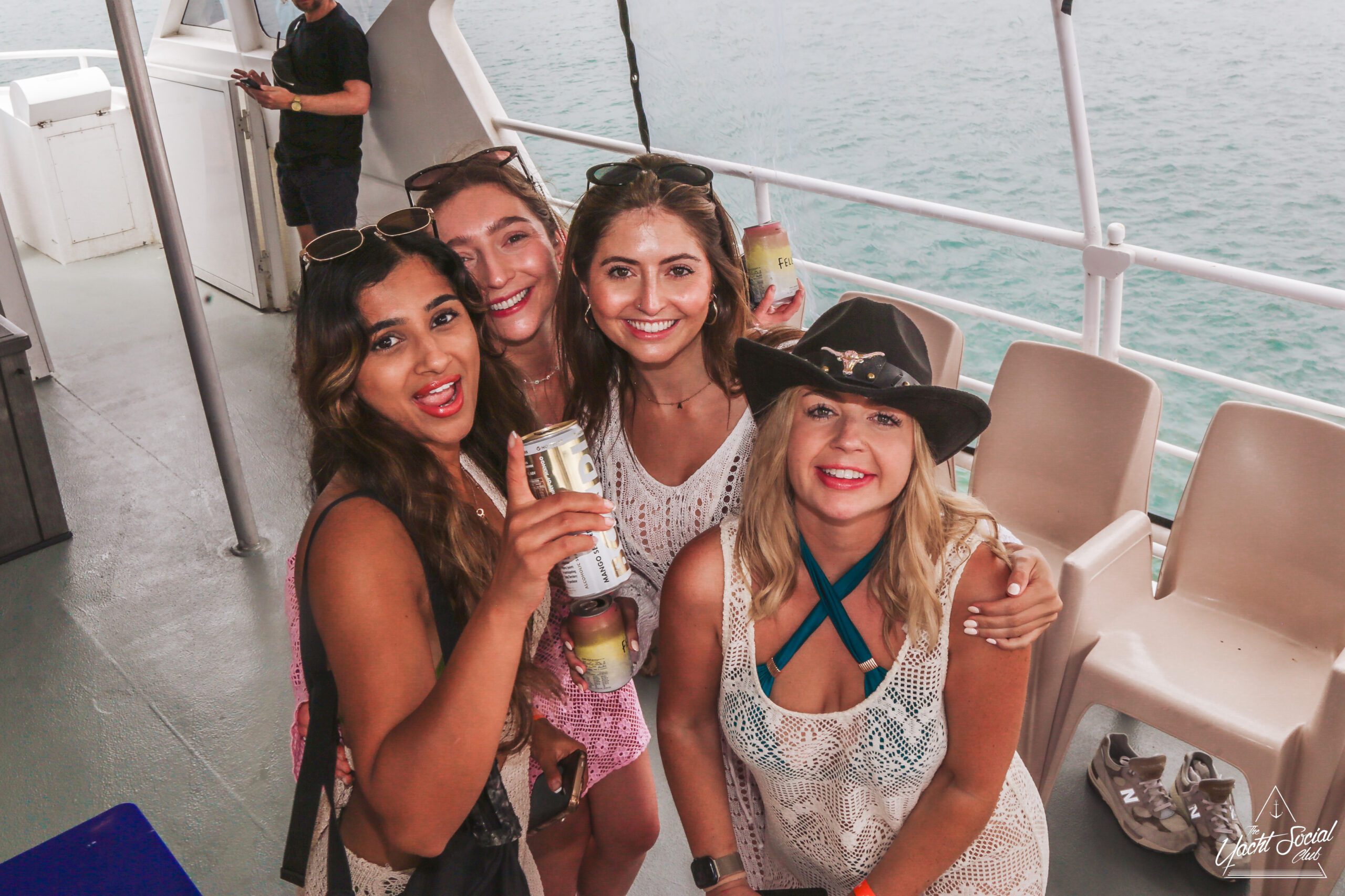 Five women in swimsuits smile and pose together on a boat, holding drinks. The background shows boat railings, water, and other people in swimwear, suggesting a lively and fun atmosphere.