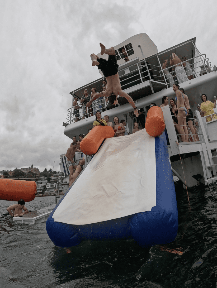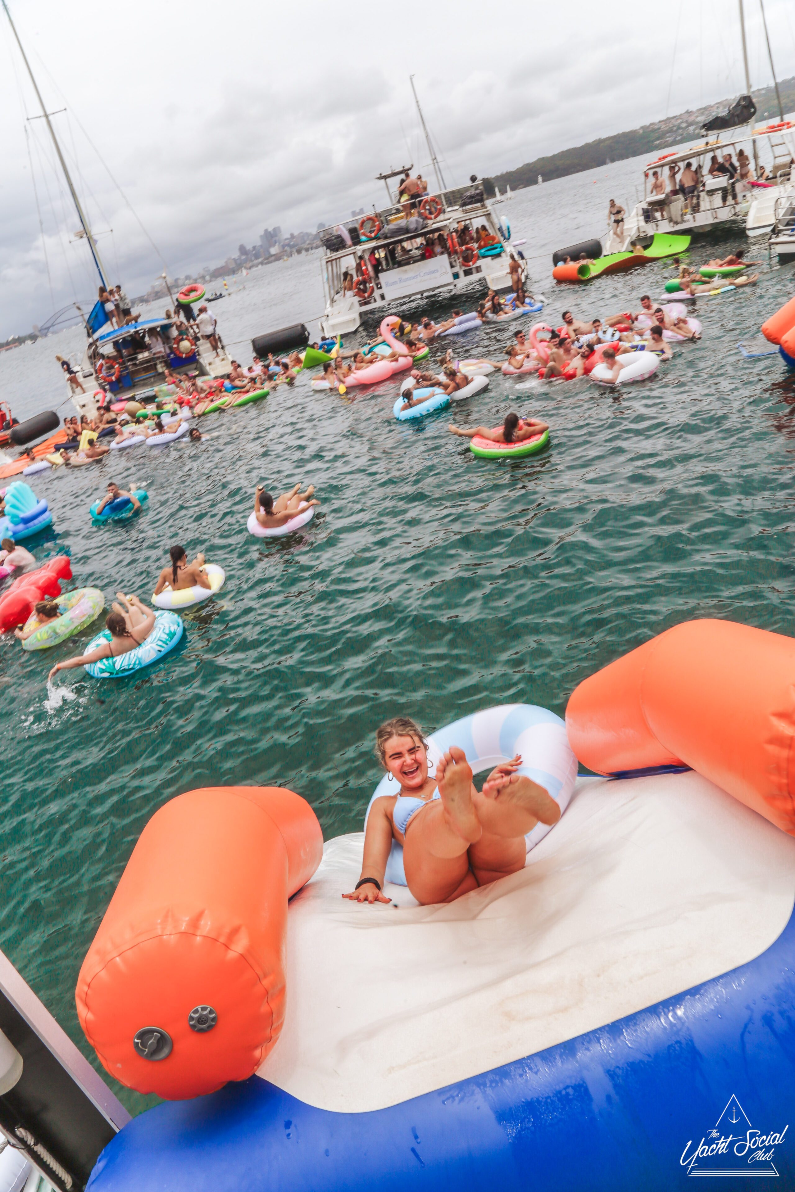 A woman in a pink bikini, holding an inflatable toy, prepares to slide into the water from an orange and white inflatable. Many people float on rafts in a lively boat party scene on a sunny day.