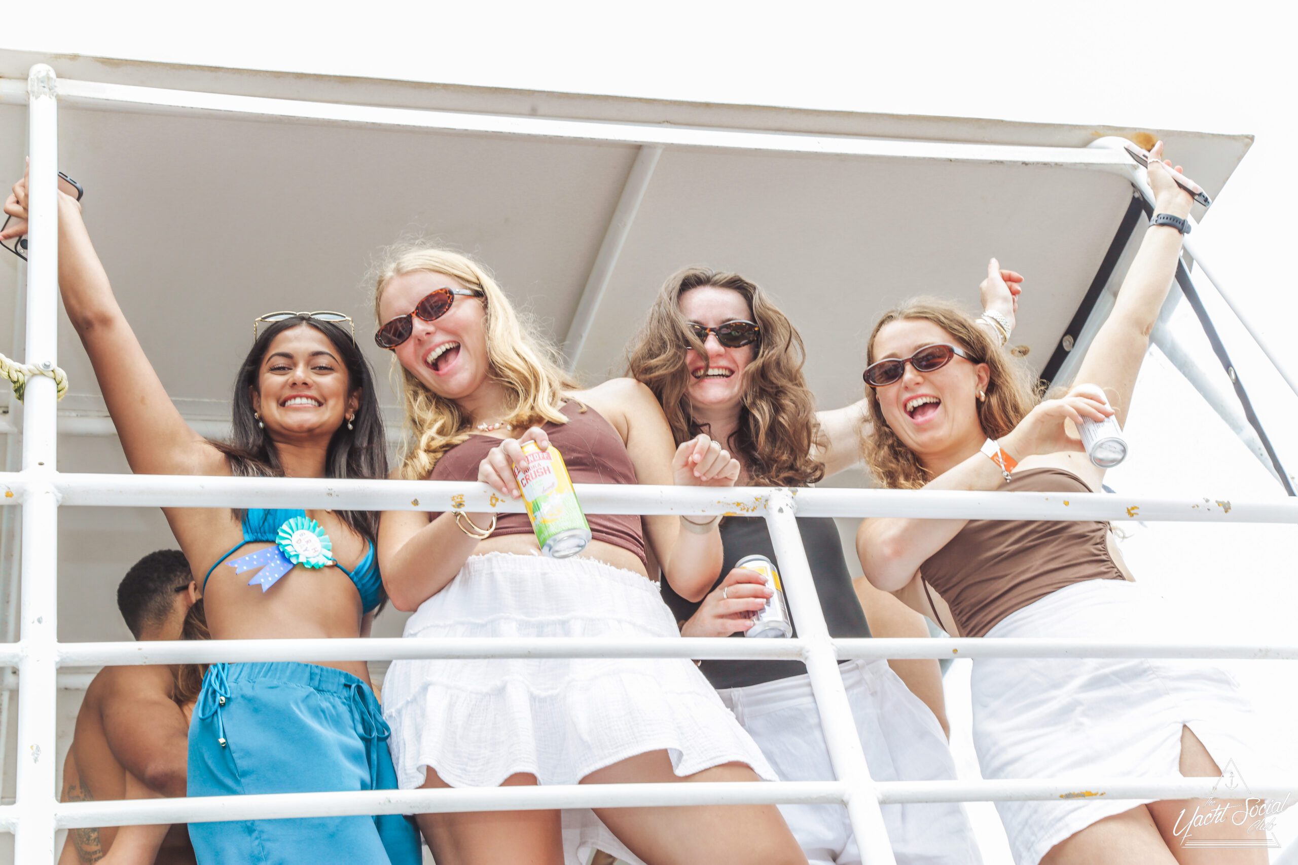 A group of young women in swimsuits smile, laugh, and raise their arms while posing for a photo at a lively boat party on the water. Some hold drinks, and the mood is joyful and energetic.