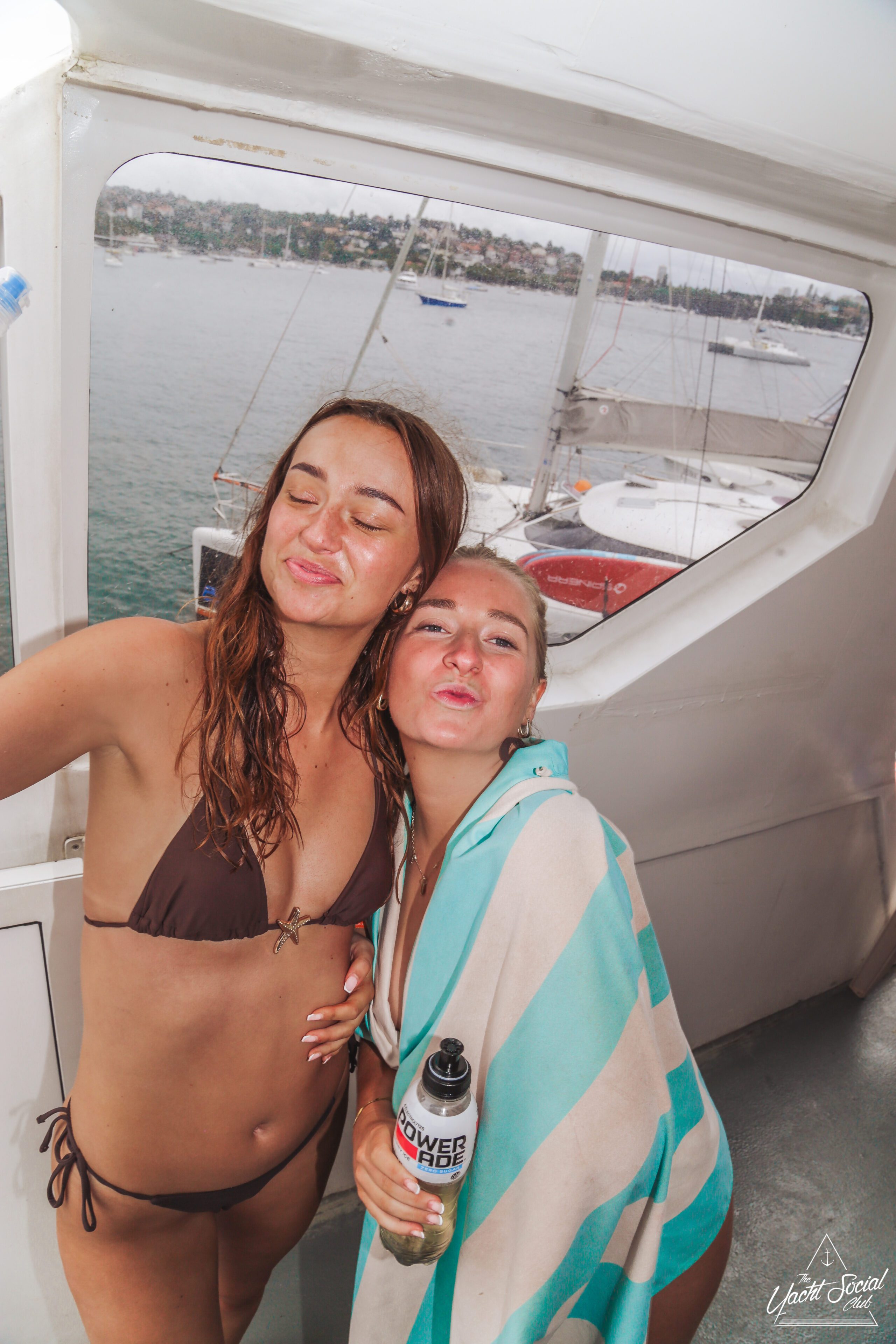Two women in bikinis smiling and posing with their arms raised on a boat, with another boat and several people in swimsuits visible in the background on the water.