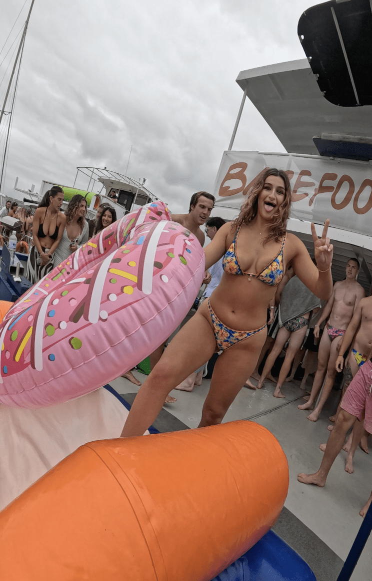 A smiling woman in a colorful bikini makes a peace sign while standing on an inflatable donut at a lively pool party with other people in swimwear. Boats and a "BAREFOOT" sign are visible in the background.