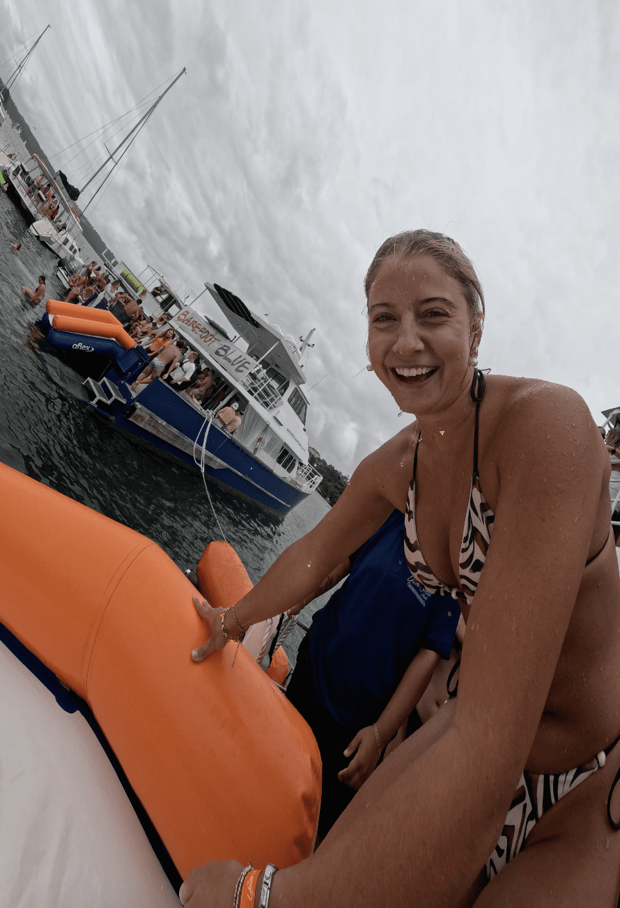A smiling woman in a maroon bikini sits on a boat deck near a pink and white float, with people swimming in blue water in the background.