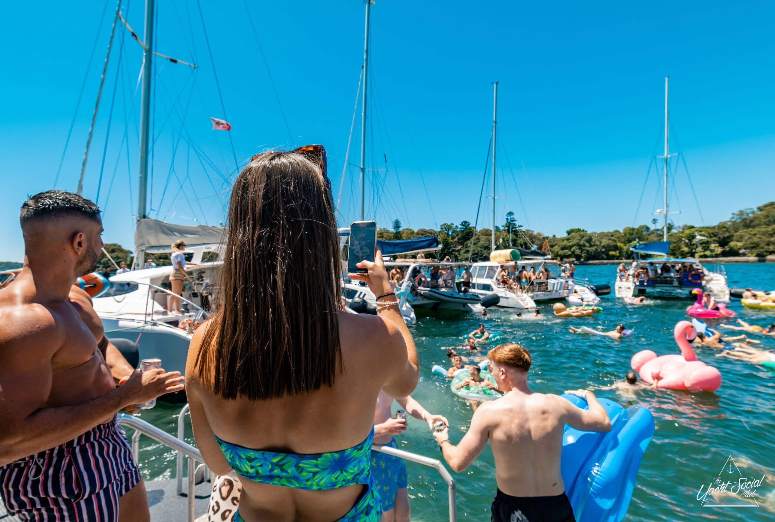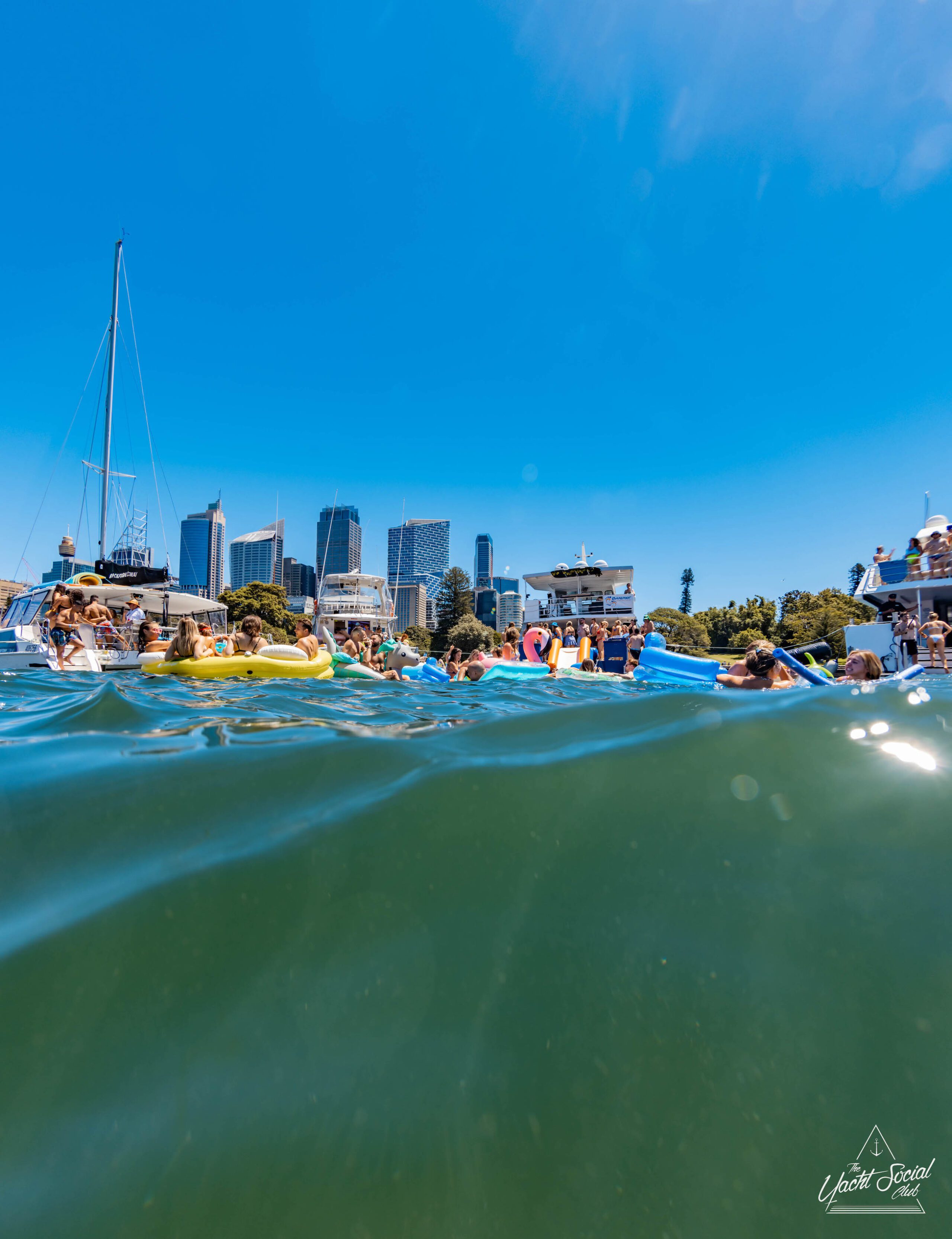 A group of people on boats enjoying a sunny day. Some are swimming and floating on inflatable pool toys, while others watch and take photos from a luxurious yacht hire in Sydney Harbour.