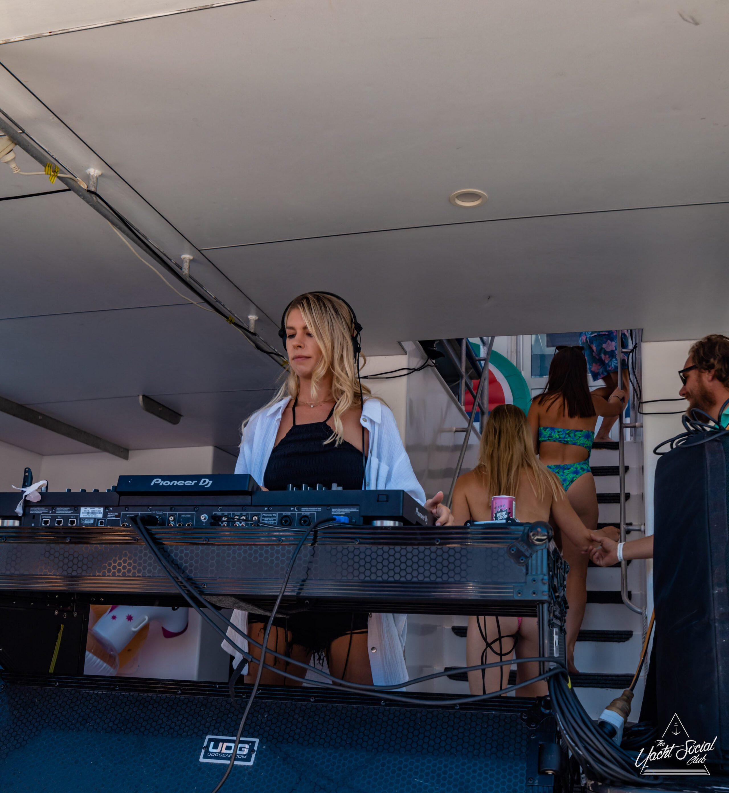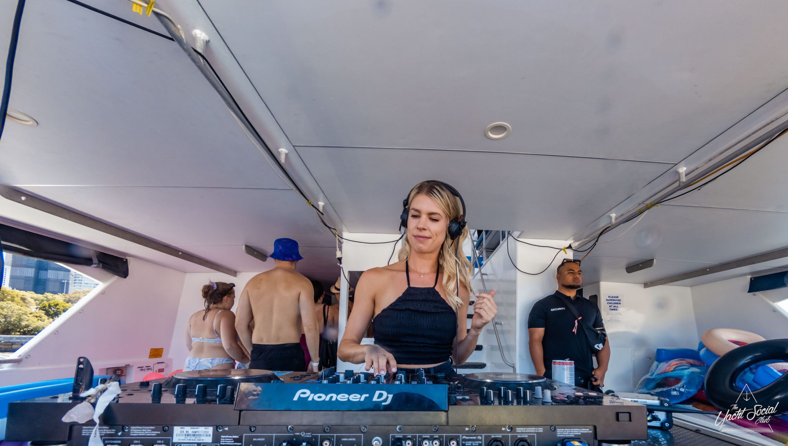 A woman DJ wearing headphones is mixing music on a Pioneer DJ turntable at a private yacht charter in Sydney Harbour. There are several people in the background, some shirtless, standing and talking.