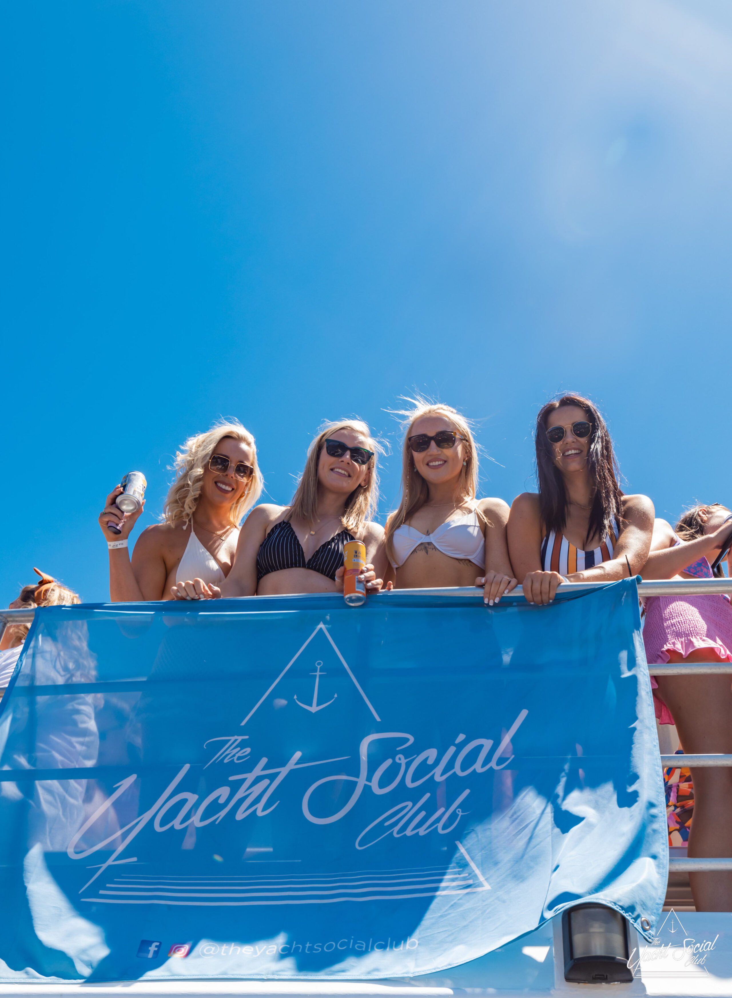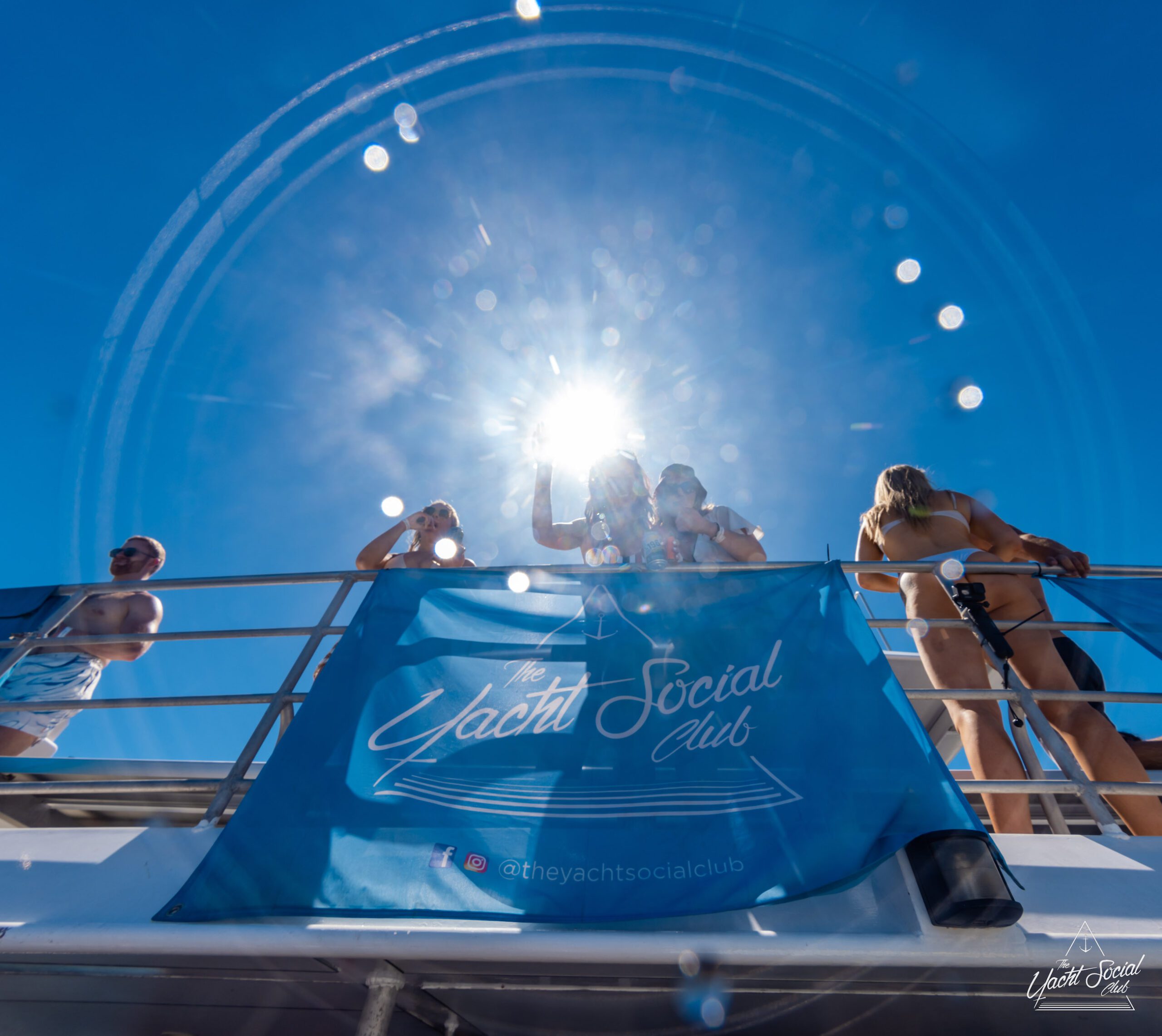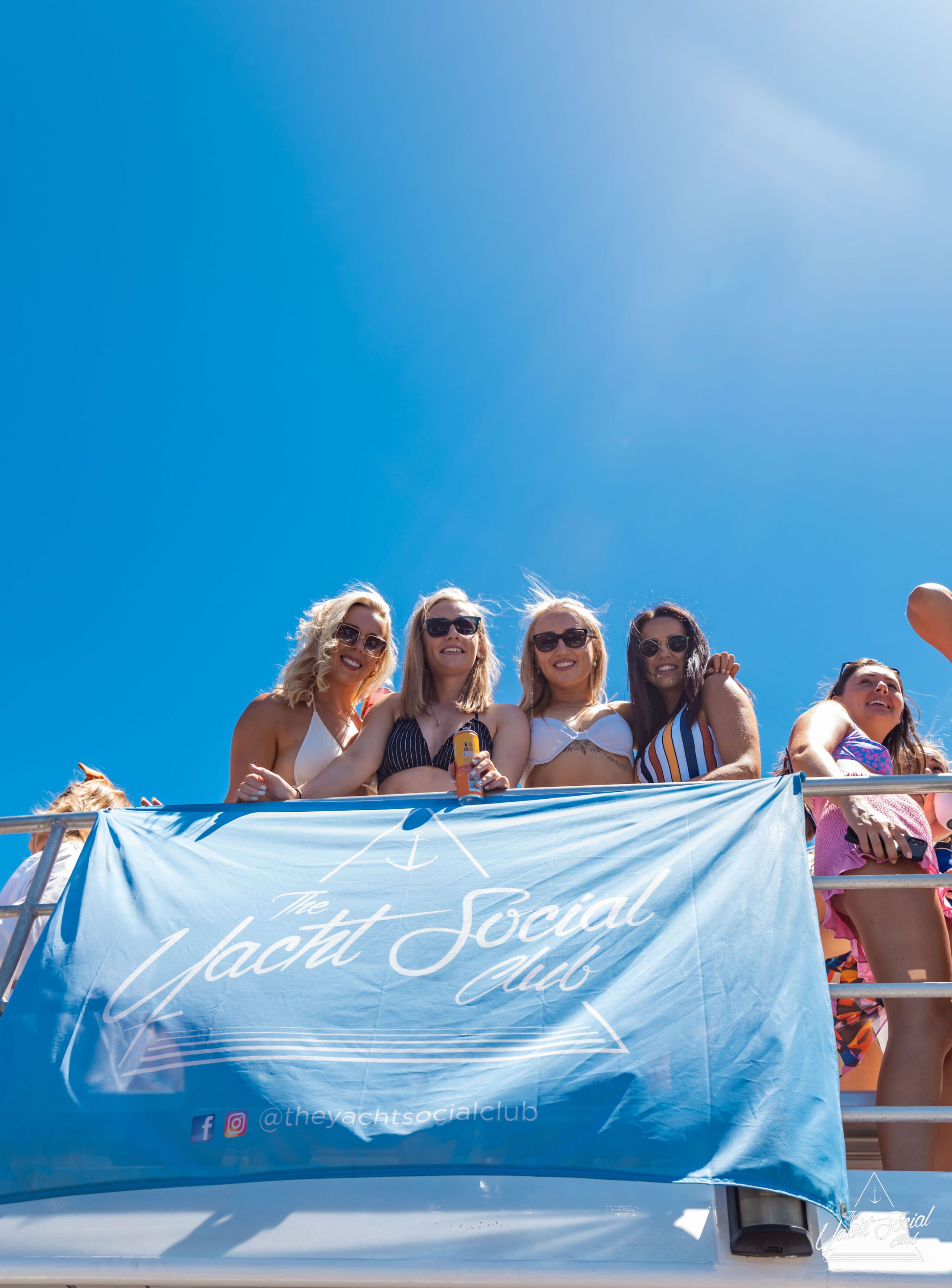 A group of people in swimwear are smiling and posing behind a blue banner that reads "The Yacht Social Club." They are on a luxury yacht under a clear blue sky, perfect for corporate boat events in Sydney.