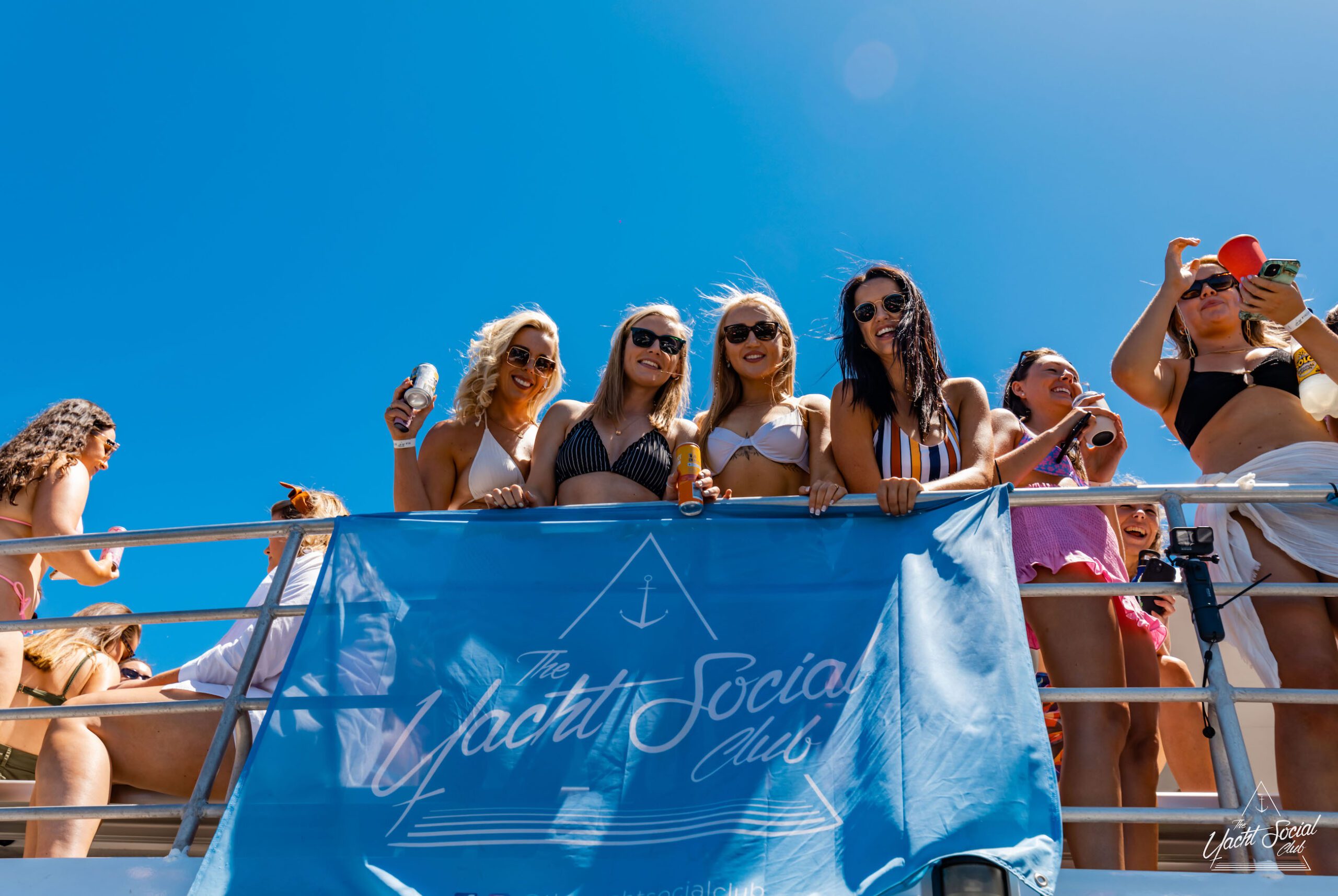 Three people in swimwear smile for the camera on a sunny boat deck surrounded by others. A DJ setup is visible, and a banner in the background reads "The Yacht Social Club." Perfect for private yacht charters on Sydney Harbour, this Sydney boat party hire promises an unforgettable experience.