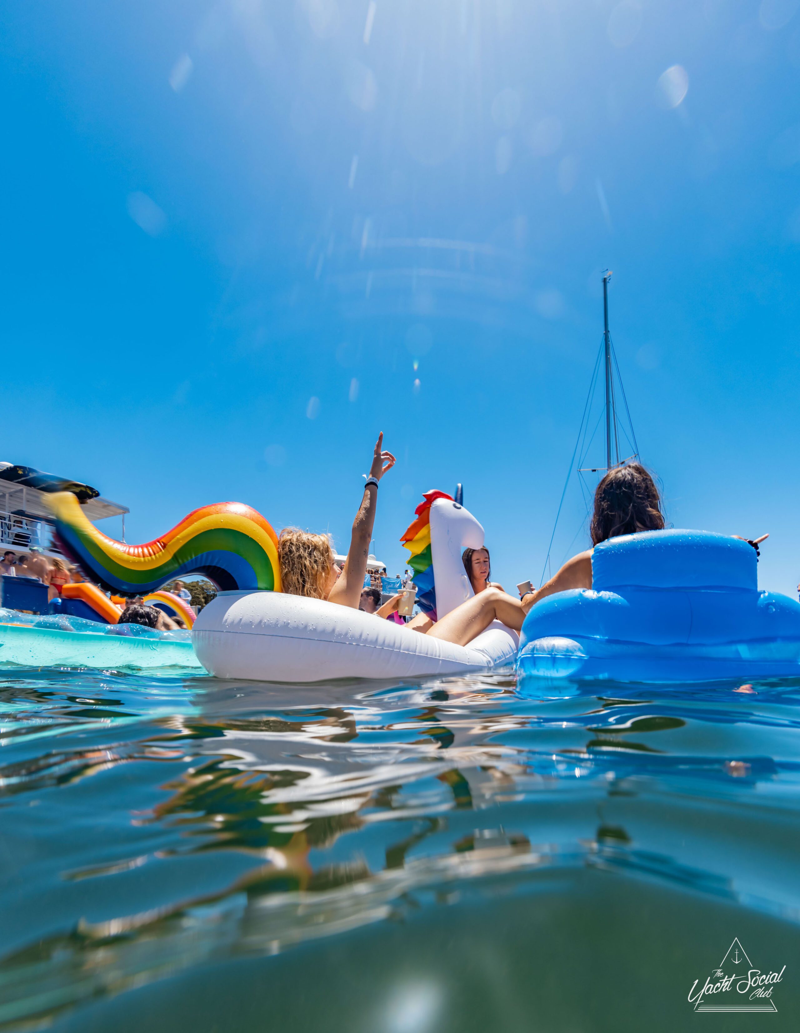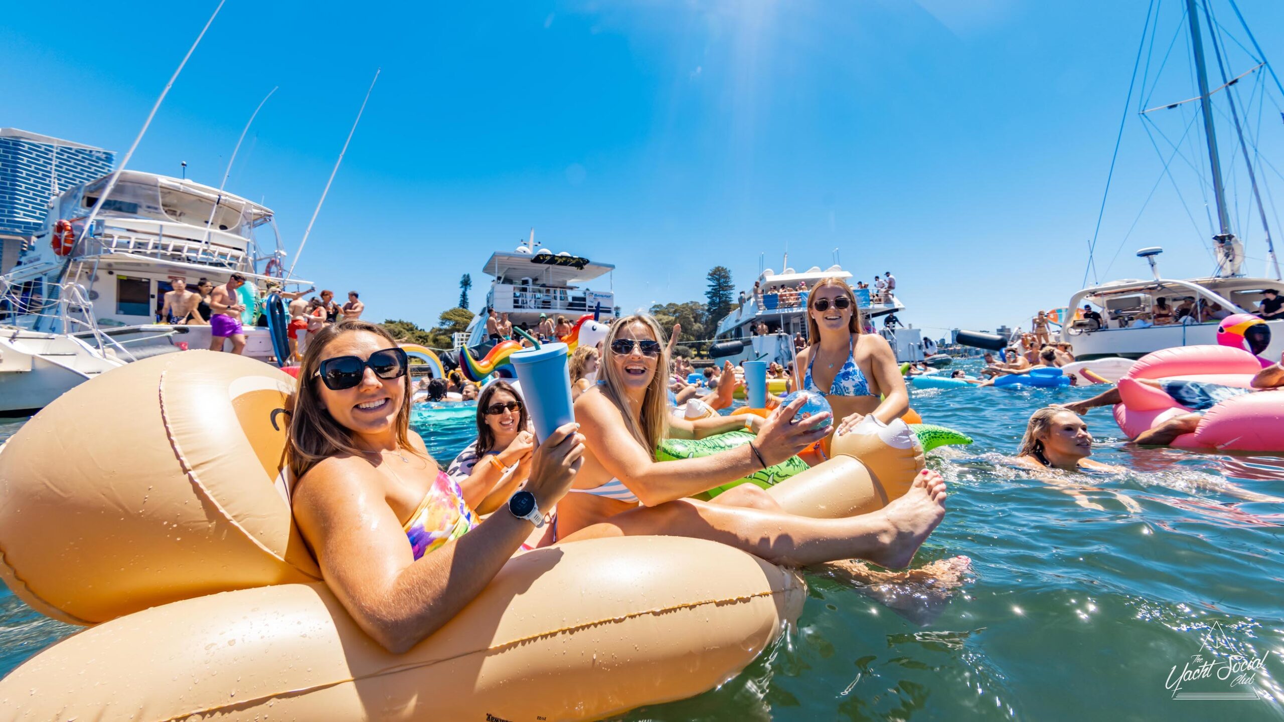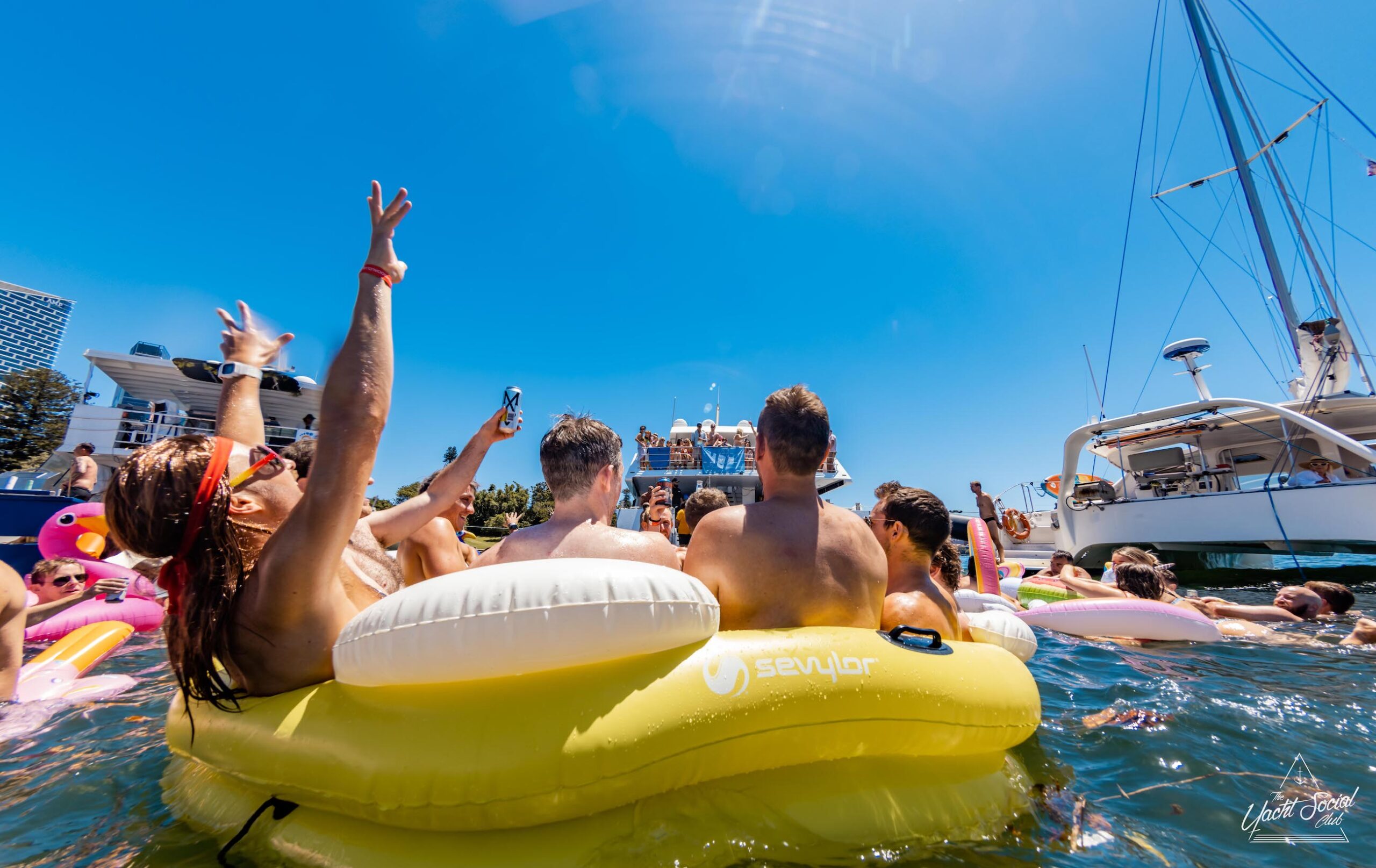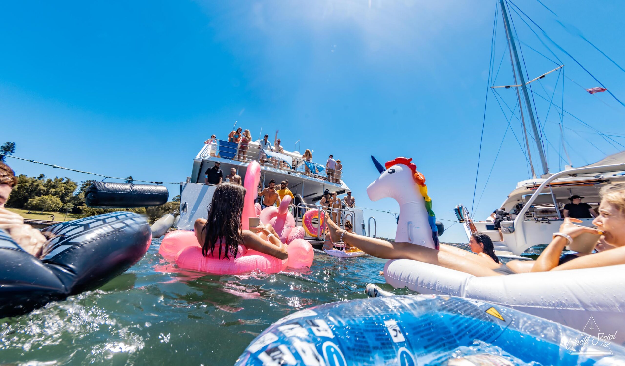 A group of people floats on inflatable rafts and inner tubes in the water near boats on a sunny day, enjoying a festive Catamaran party in Sydney Harbour.