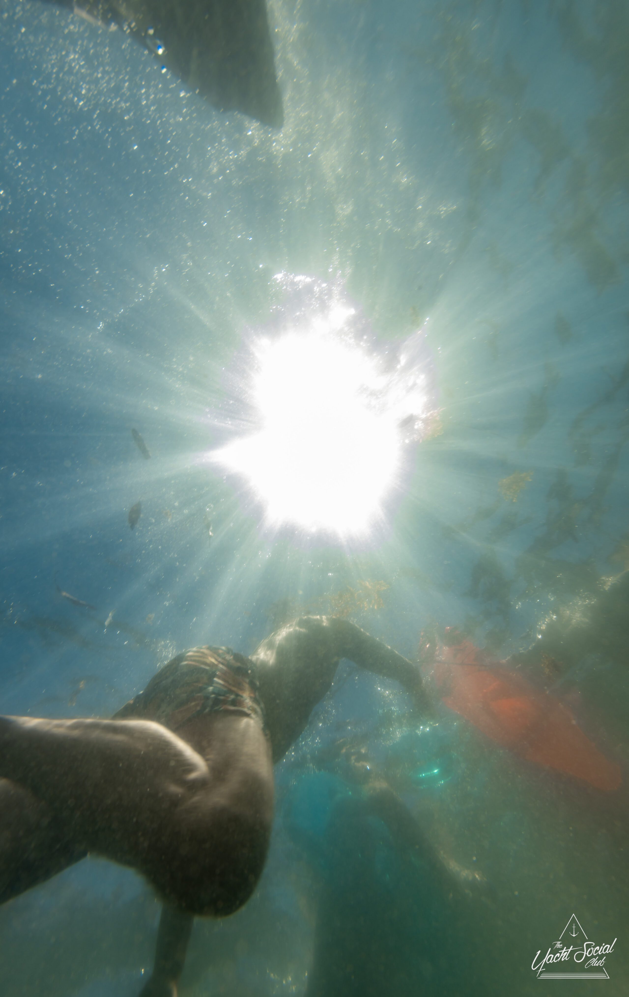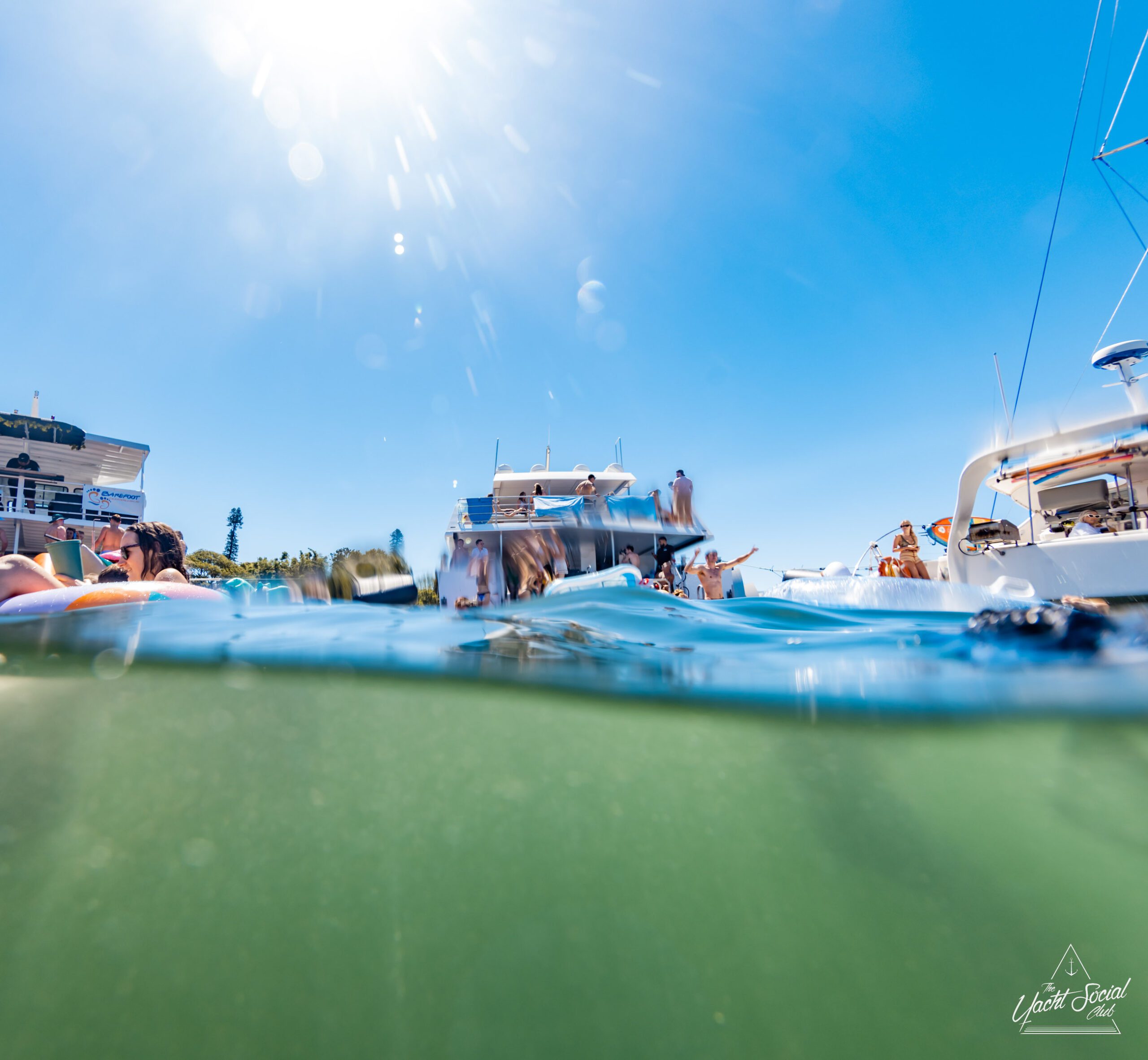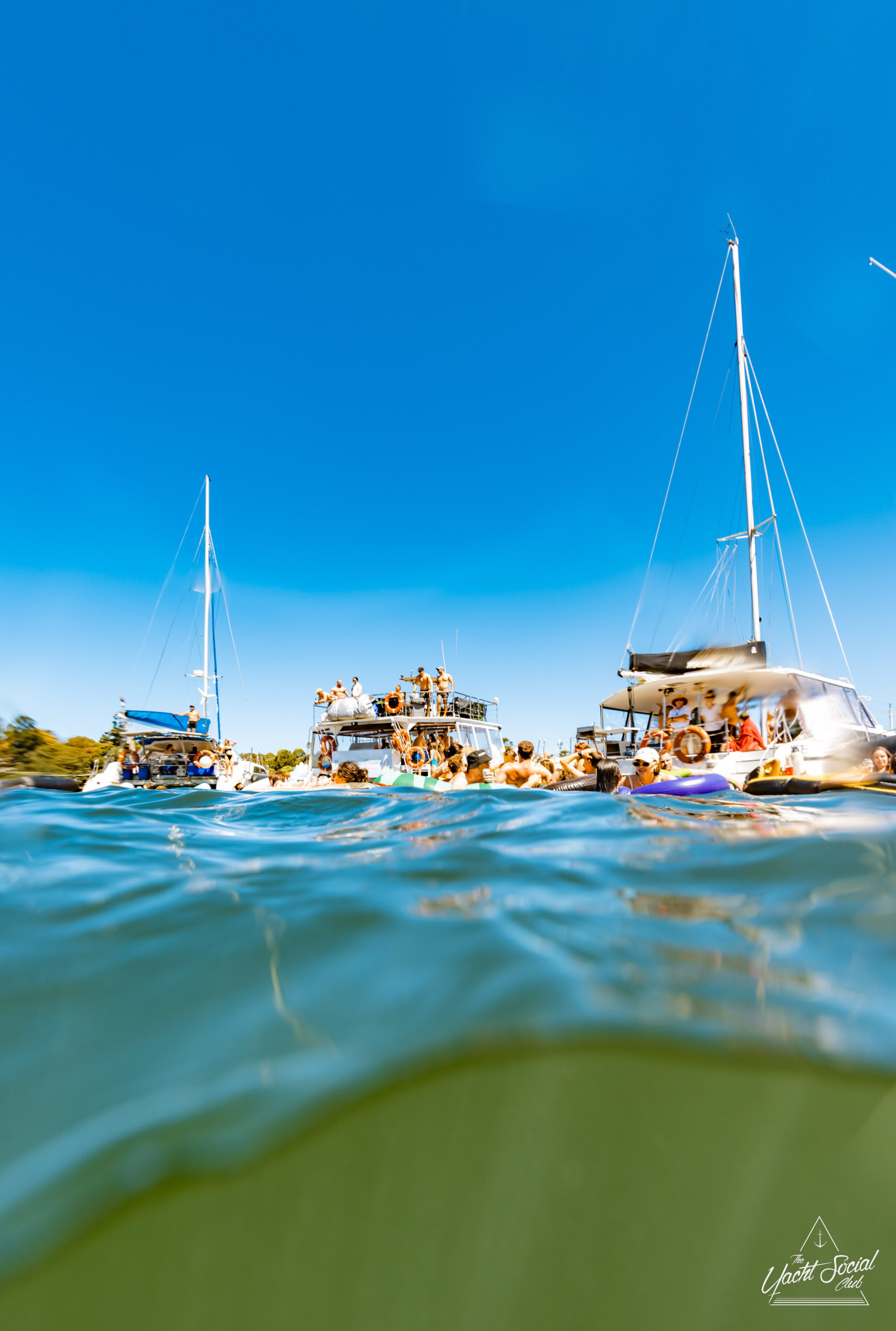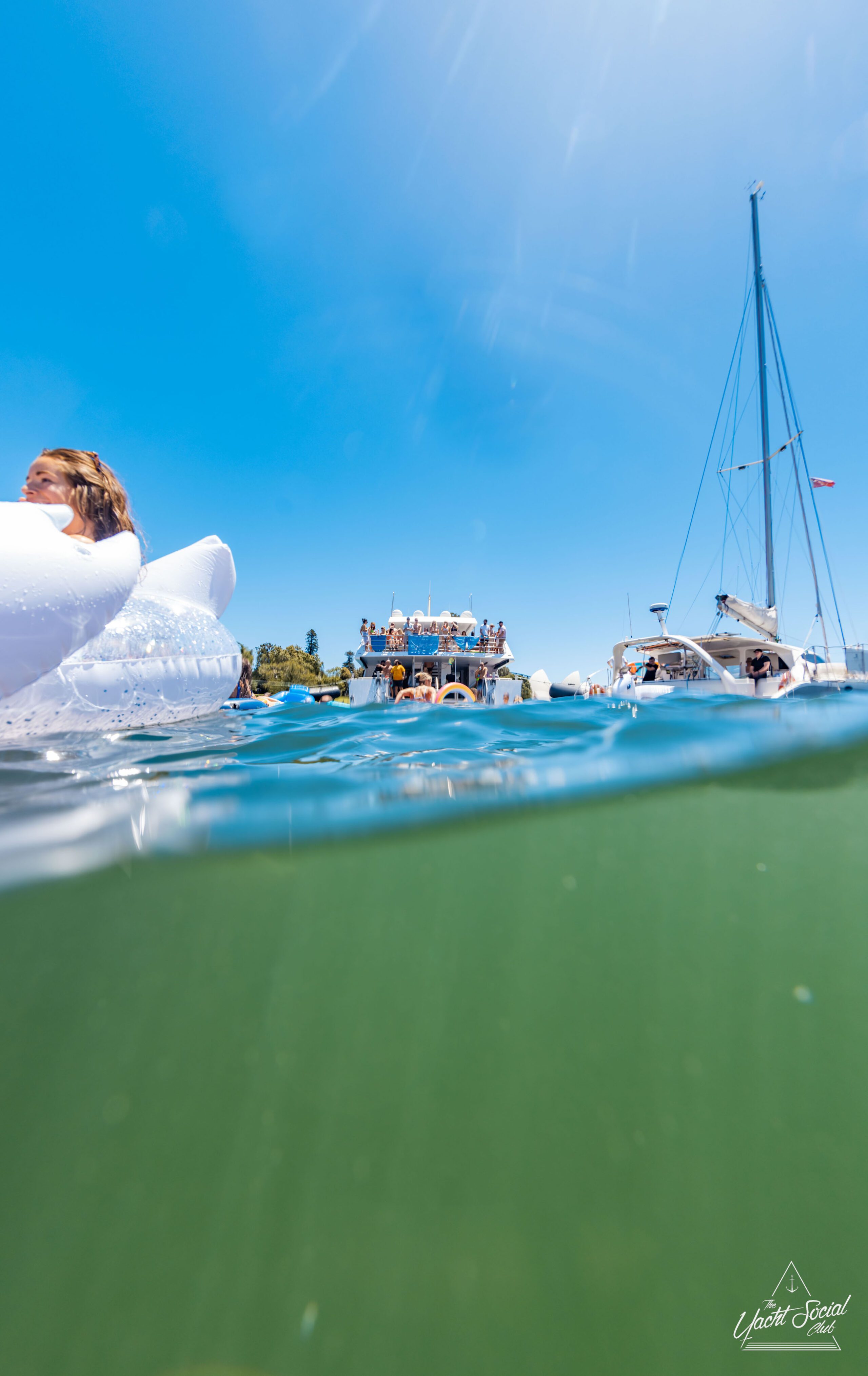People enjoying a sunny day on boats and in the water, captured partially above and below the water's surface during a private yacht charter in Sydney Harbour.