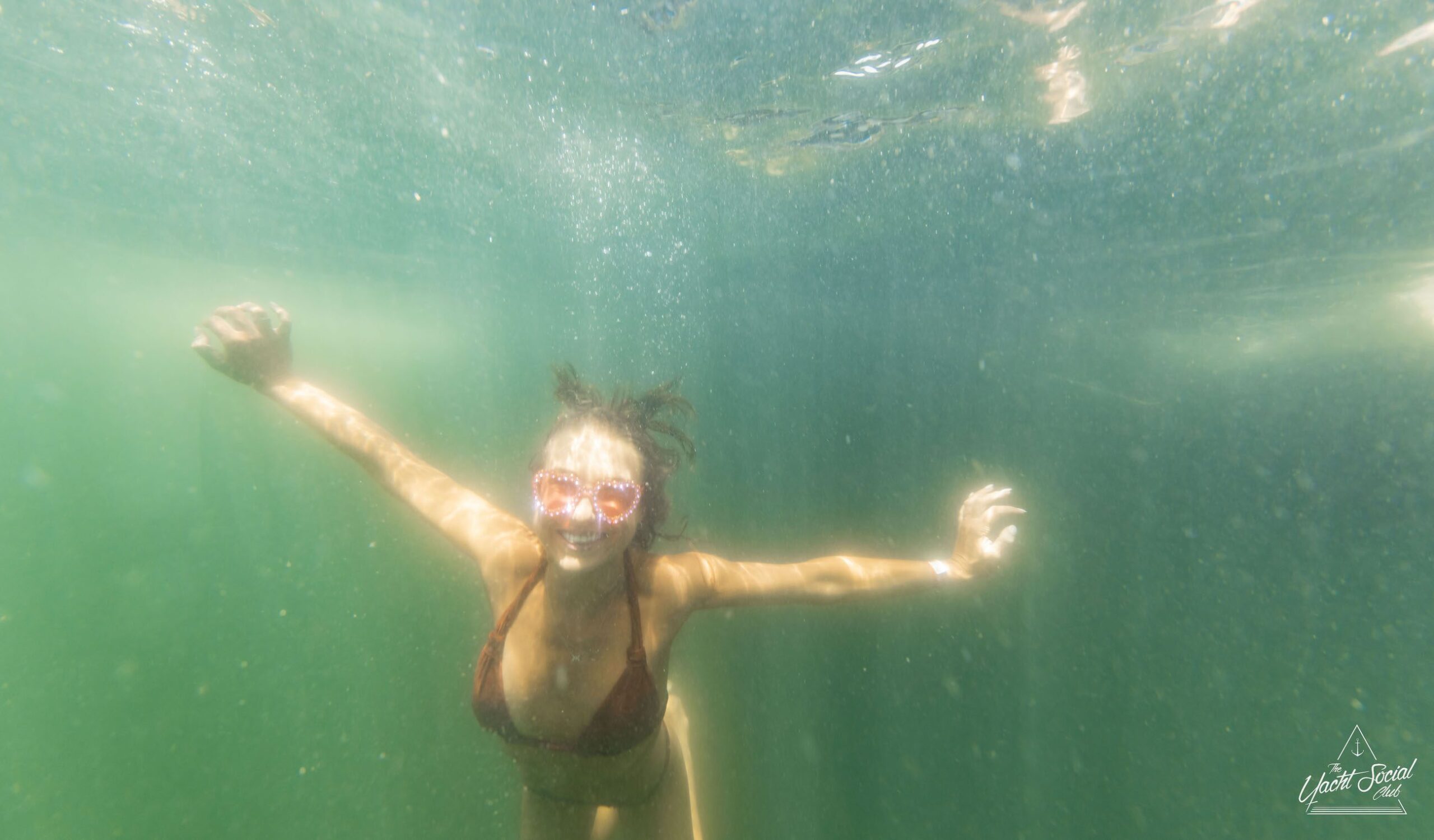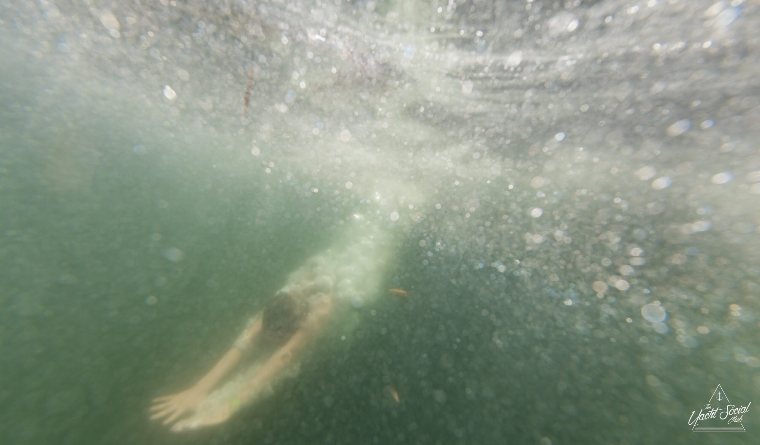 A person is underwater swimming with arms extended forward. The water is slightly murky, and air bubbles are visible, possibly from a nearby luxury yacht hire in Sydney.
