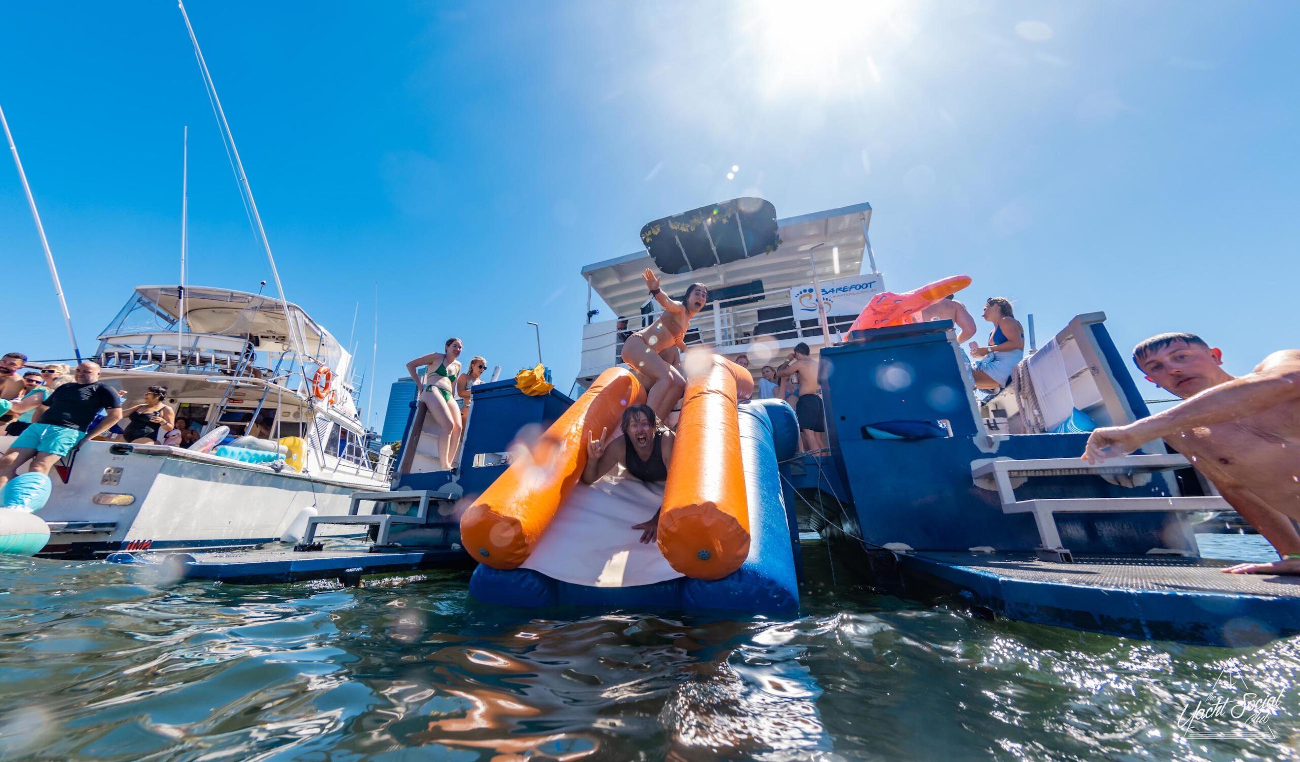 People are enjoying a sunny day on boats docked together. A person is sliding into the water from an orange and yellow inflatable slide, creating a splash. It's a perfect scene for DJ boat hire Sydney or even a vibrant catamaran party Sydney.