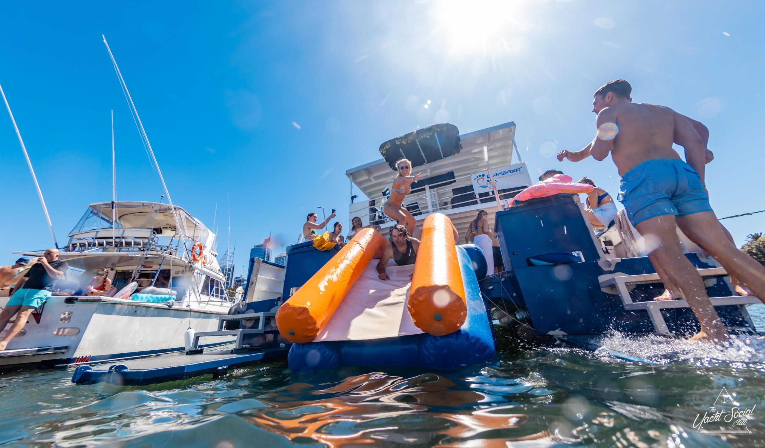 People enjoying a sunny day on a luxury yacht hire Sydney, equipped with a water slide. A person is sliding into the water while others watch and relax on the boat. Several boats are docked nearby, showcasing the perfect setting for corporate boat events Sydney.