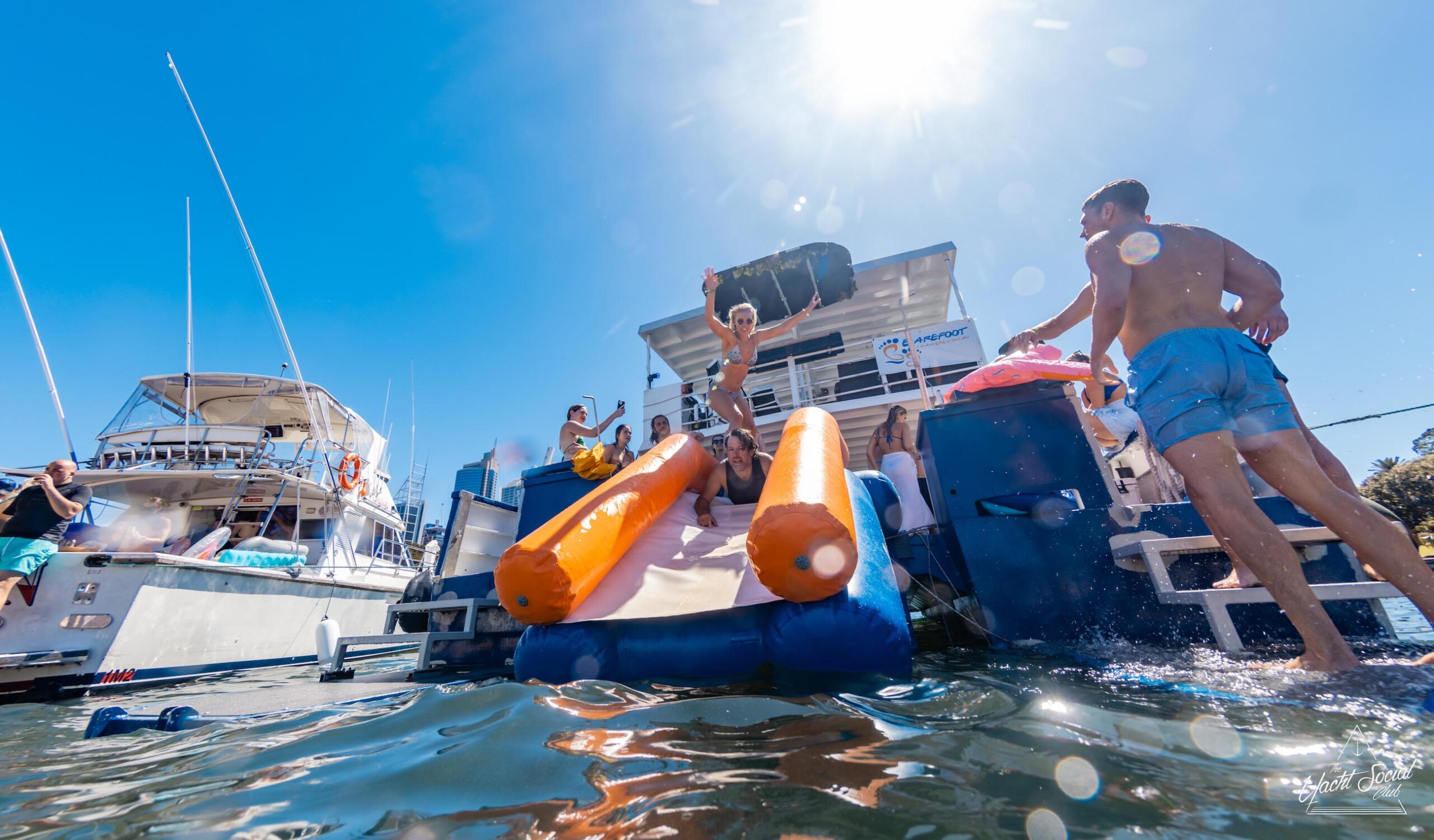 People enjoying a sunny day on and around boats, with several engaging in water activities and using inflatable floats, during a Catamaran party in Sydney.