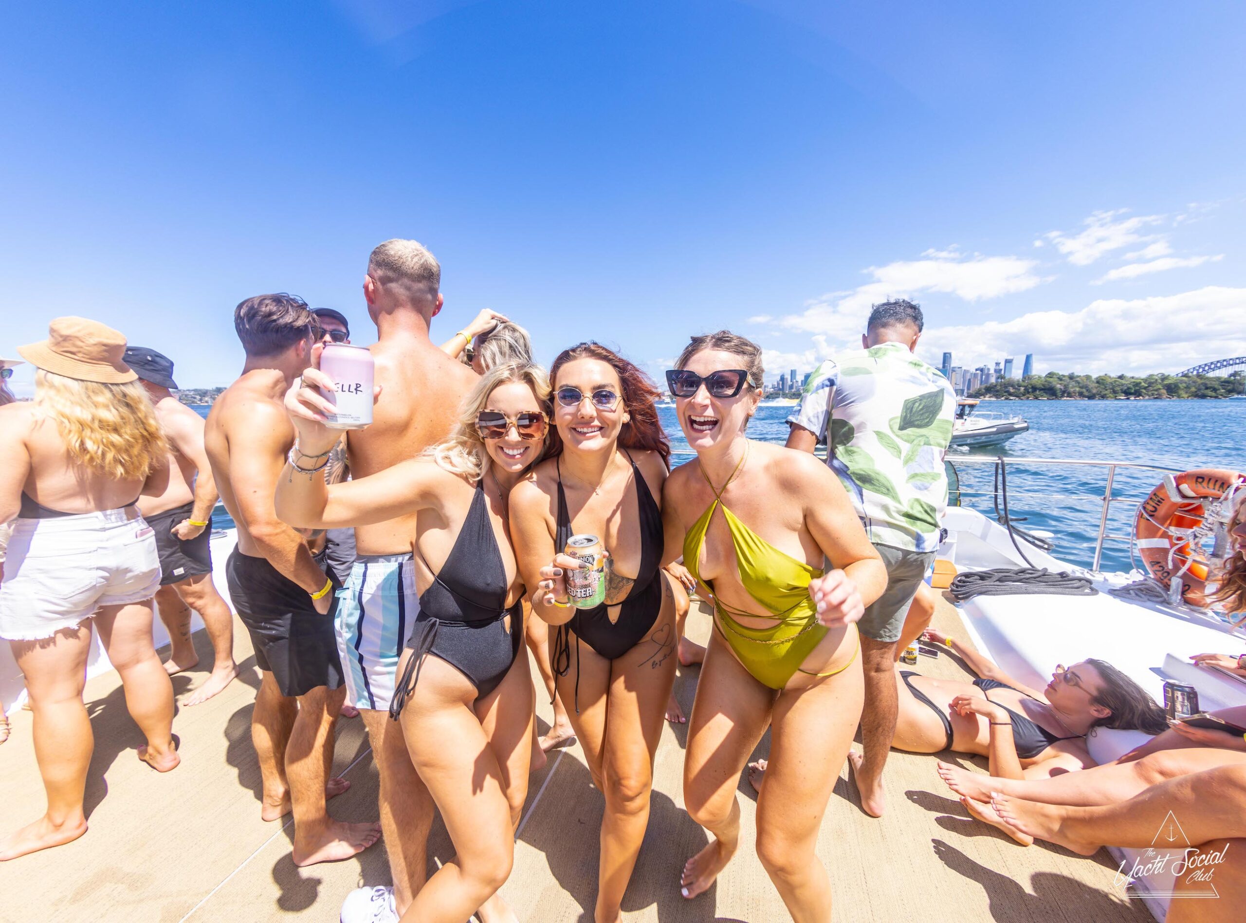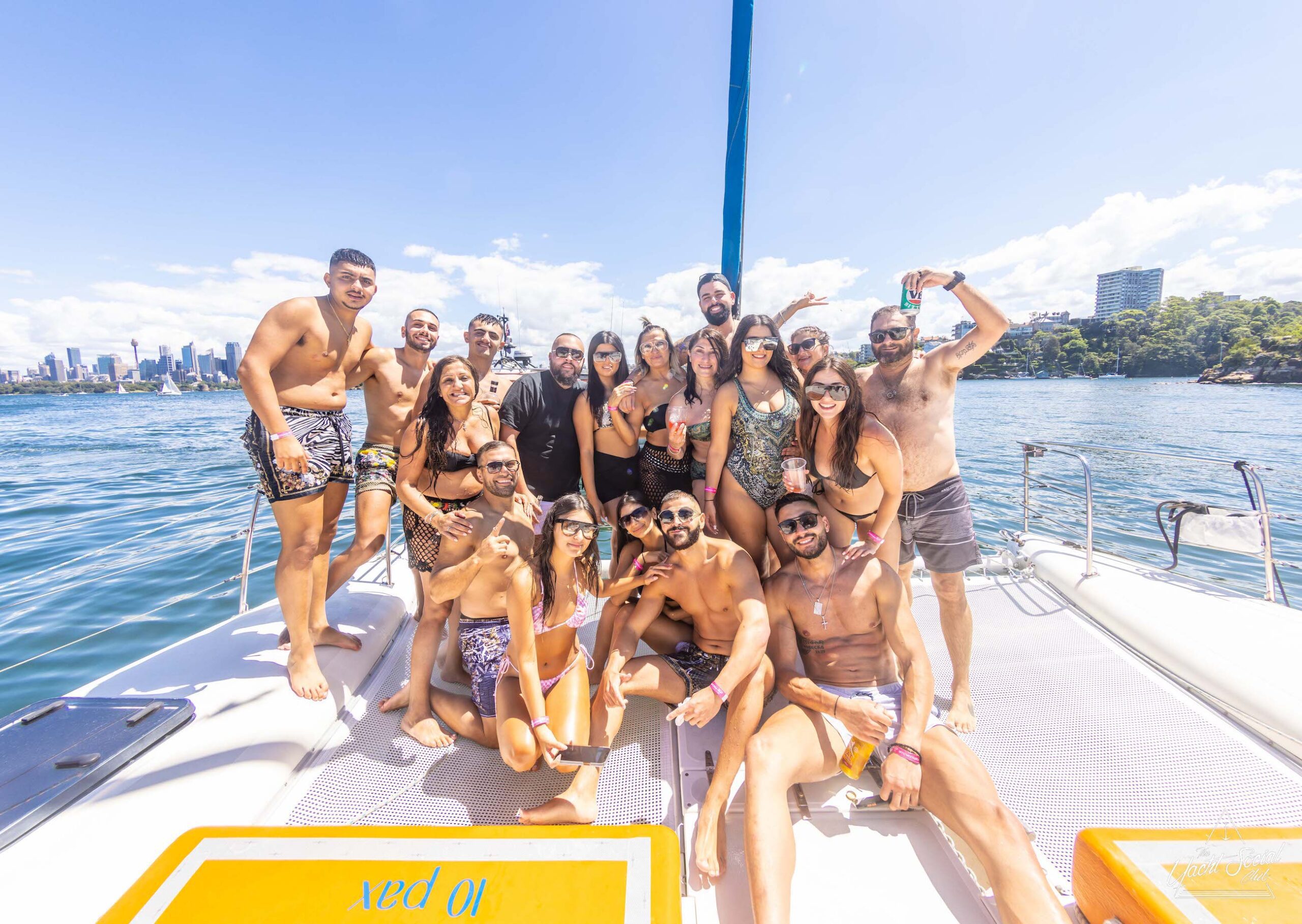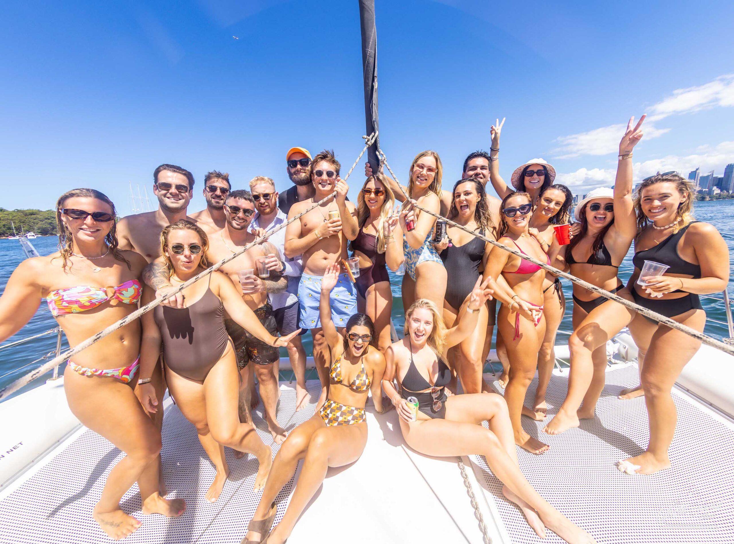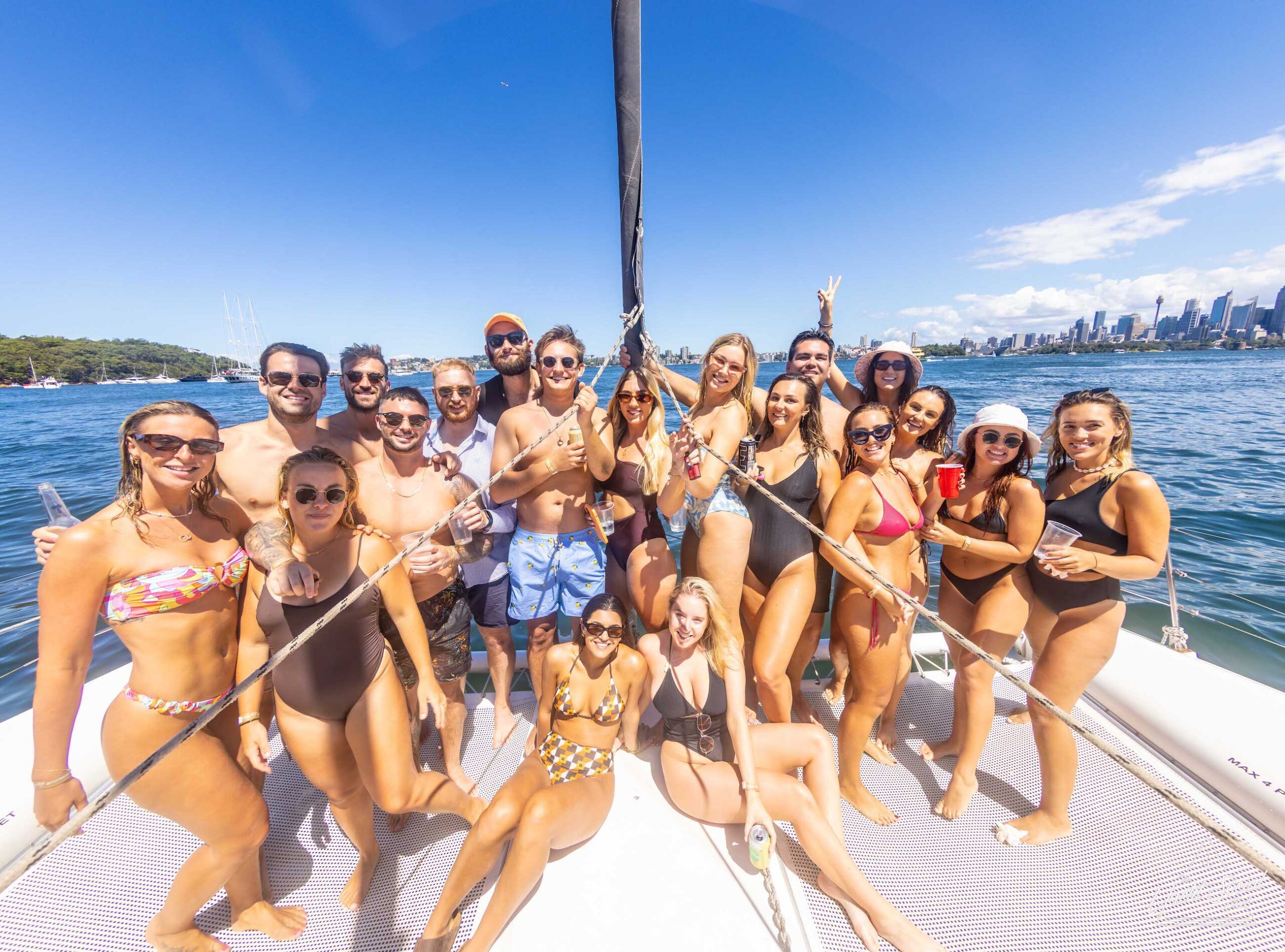 A group of people in swimwear stand and sit on a boat with water and a cityscape in the background on a sunny day, enjoying what looks like an exciting catamaran party in Sydney.