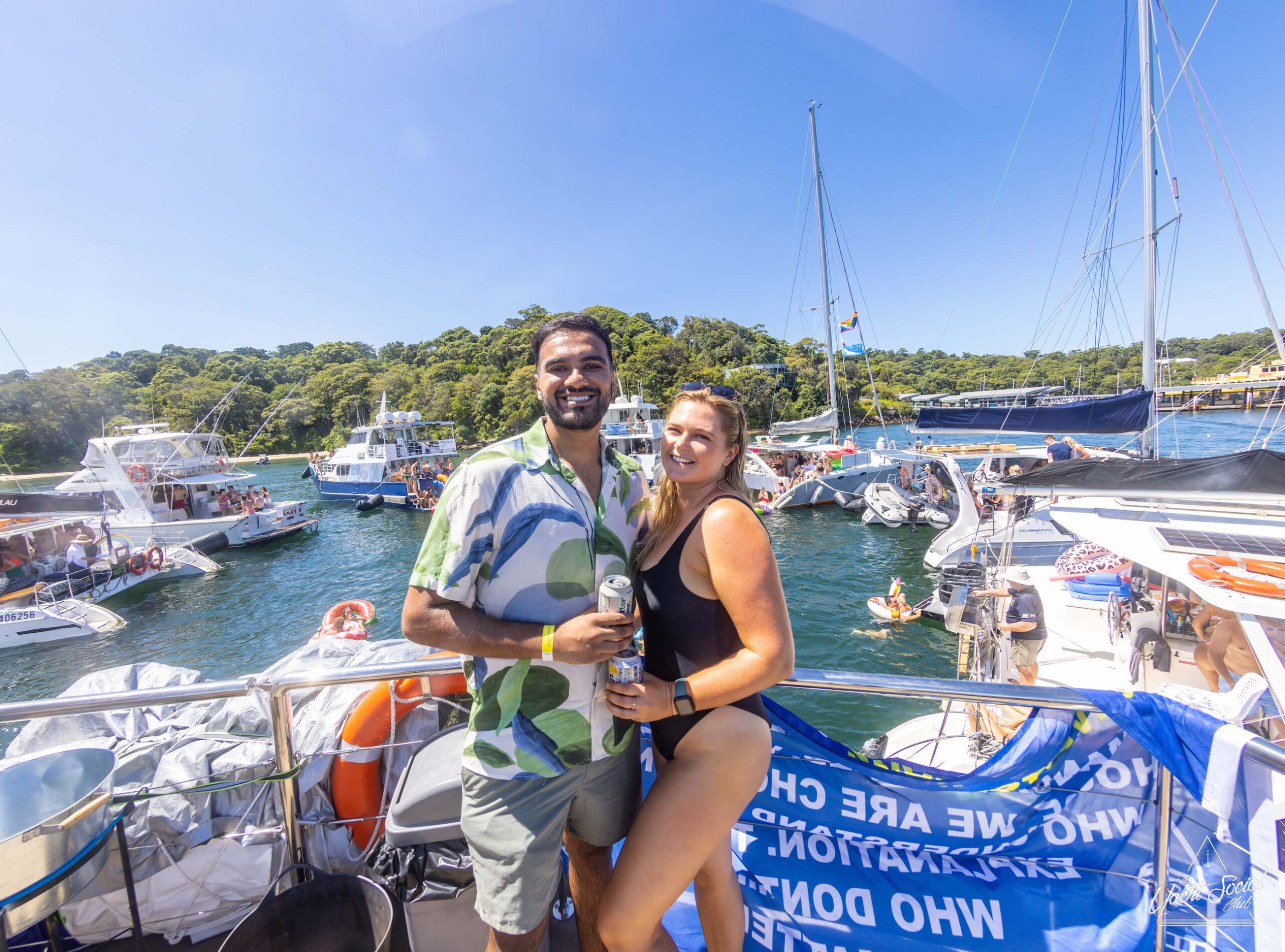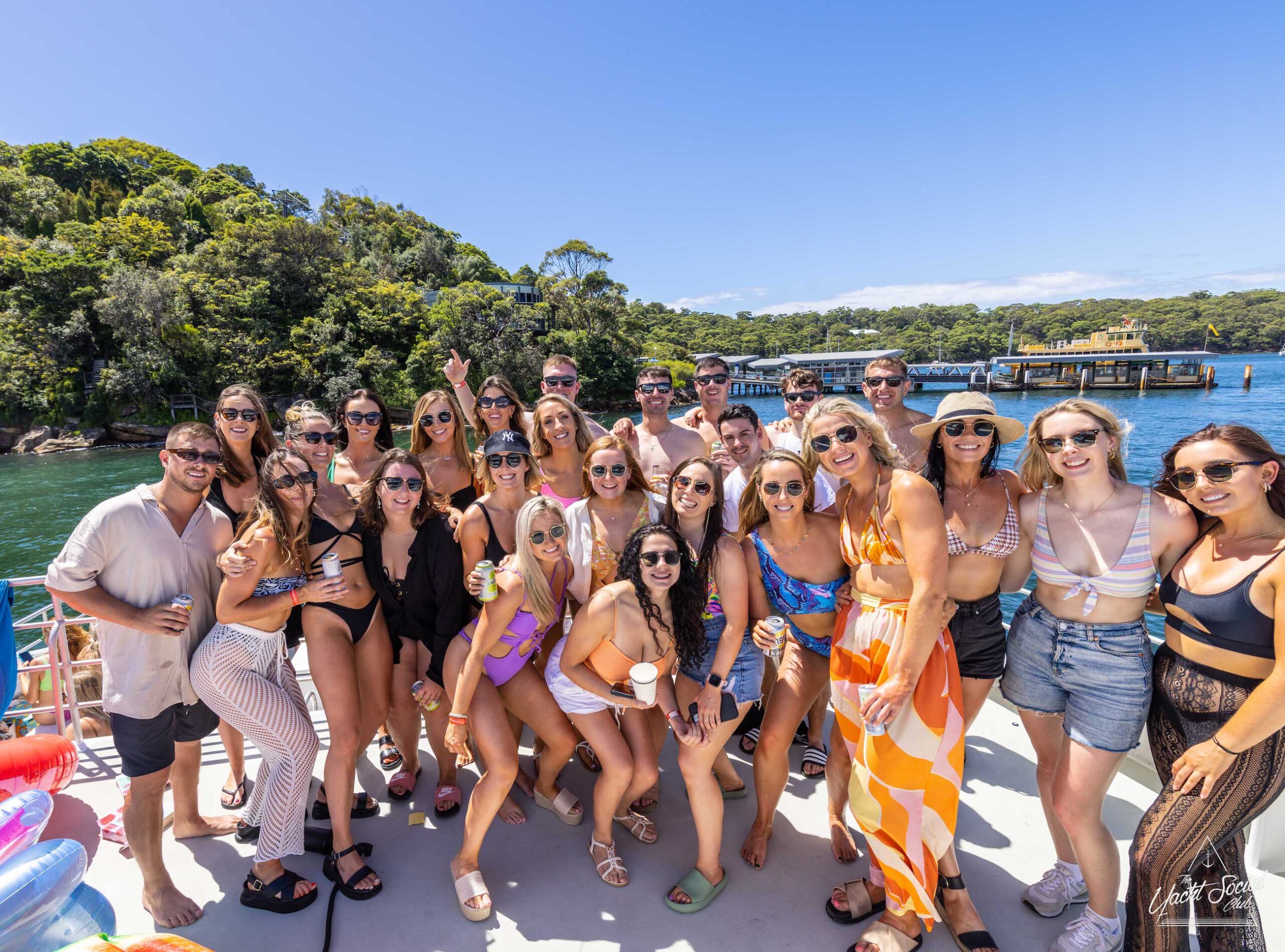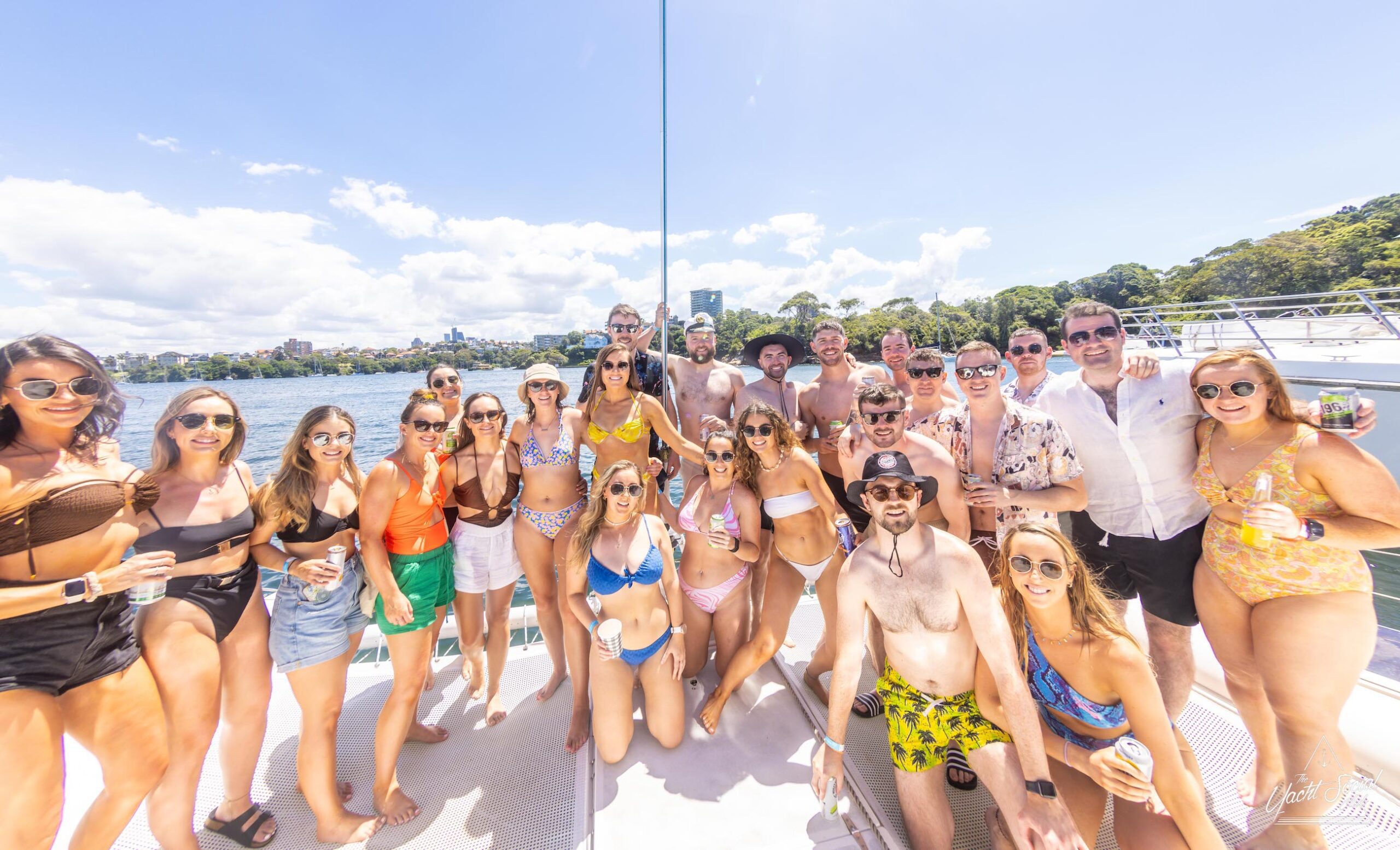 A group of people in swimwear and summer outfits pose together on a private yacht charter in Sydney Harbour with a scenic backdrop of trees and water.
