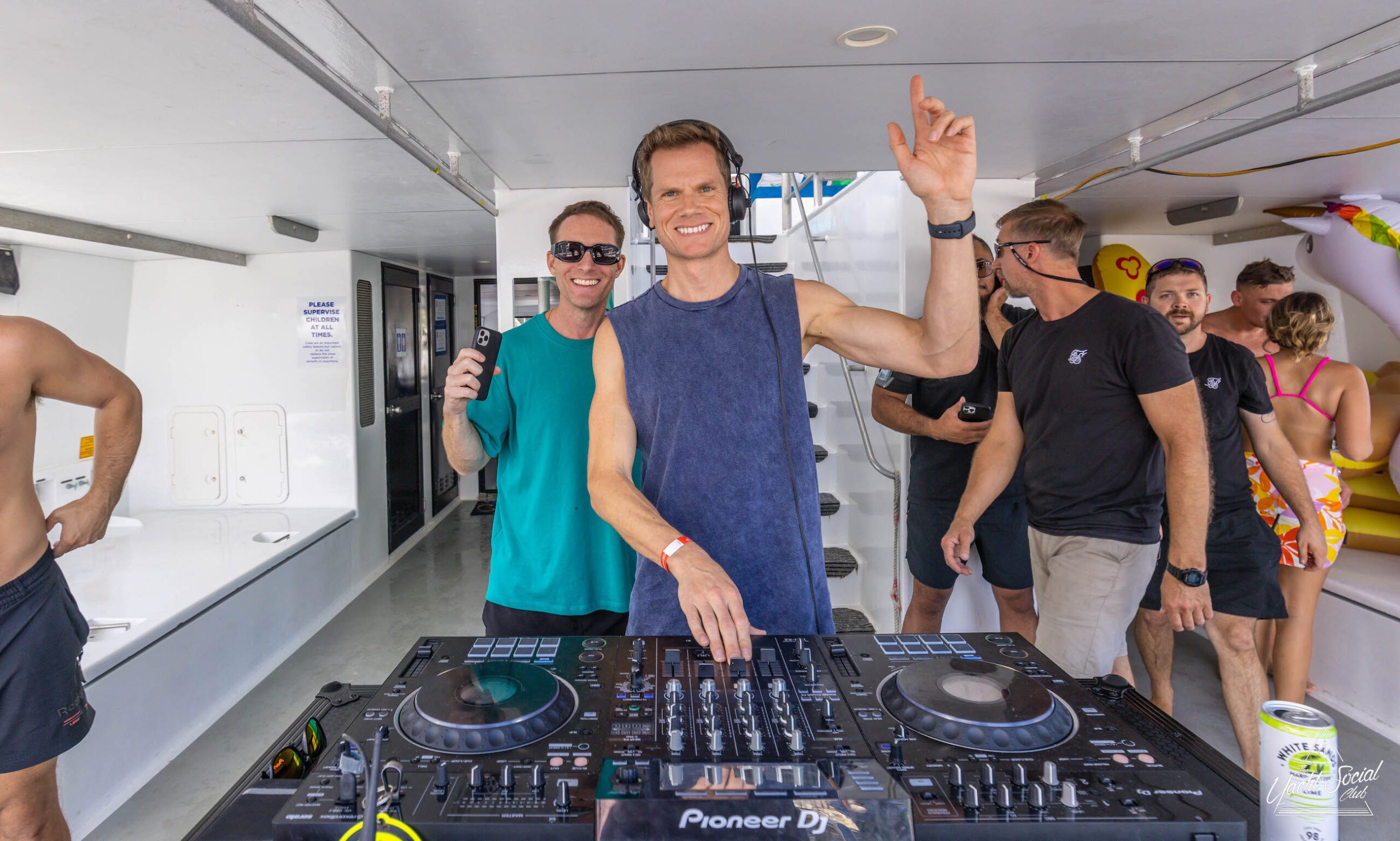 Two men DJing on a boat, one wearing headphones and raising his hand, while others socialize in the background with drinks and casual attire. Prominent DJ equipment sets the scene for a lively catamaran party in Sydney Harbour.