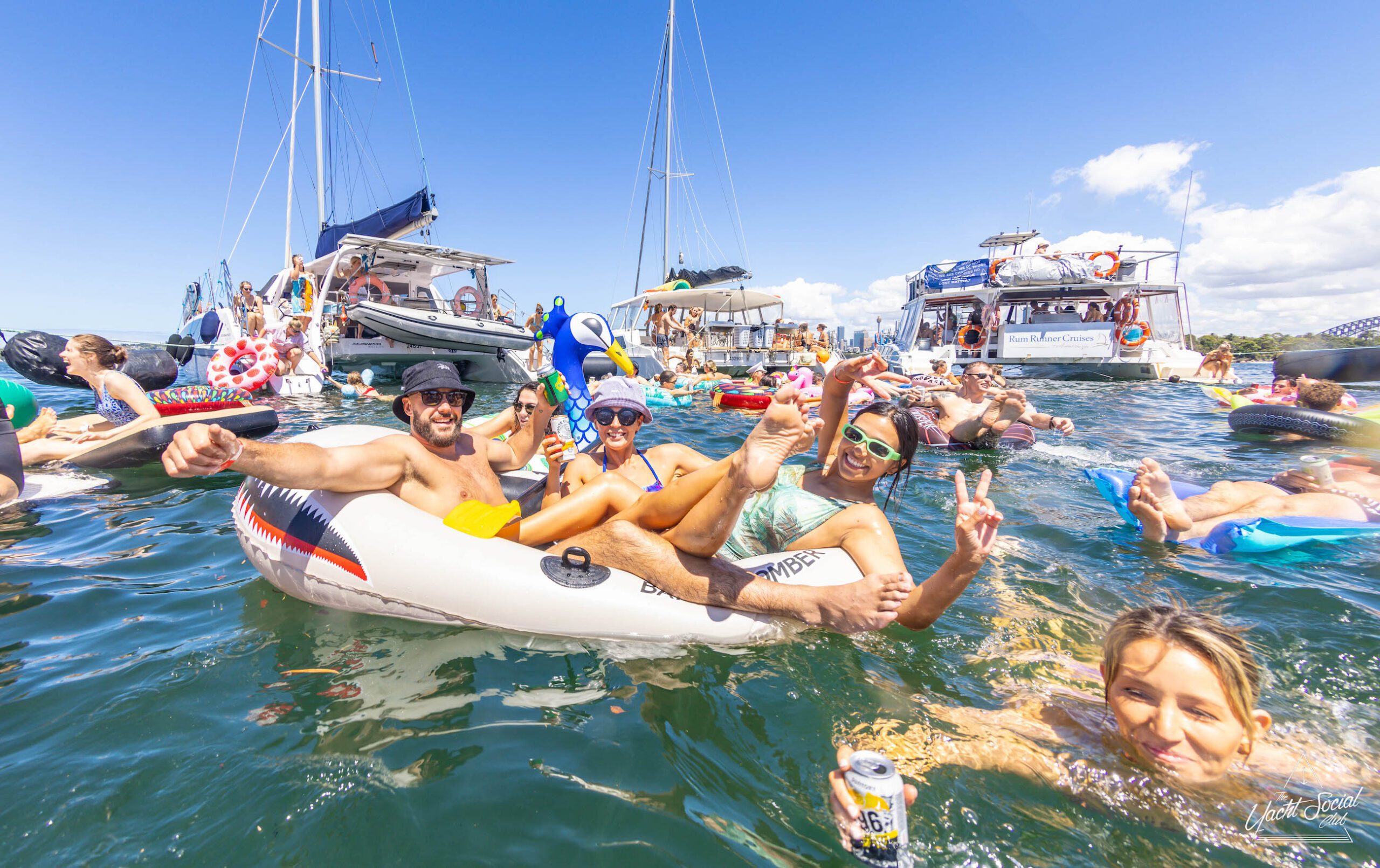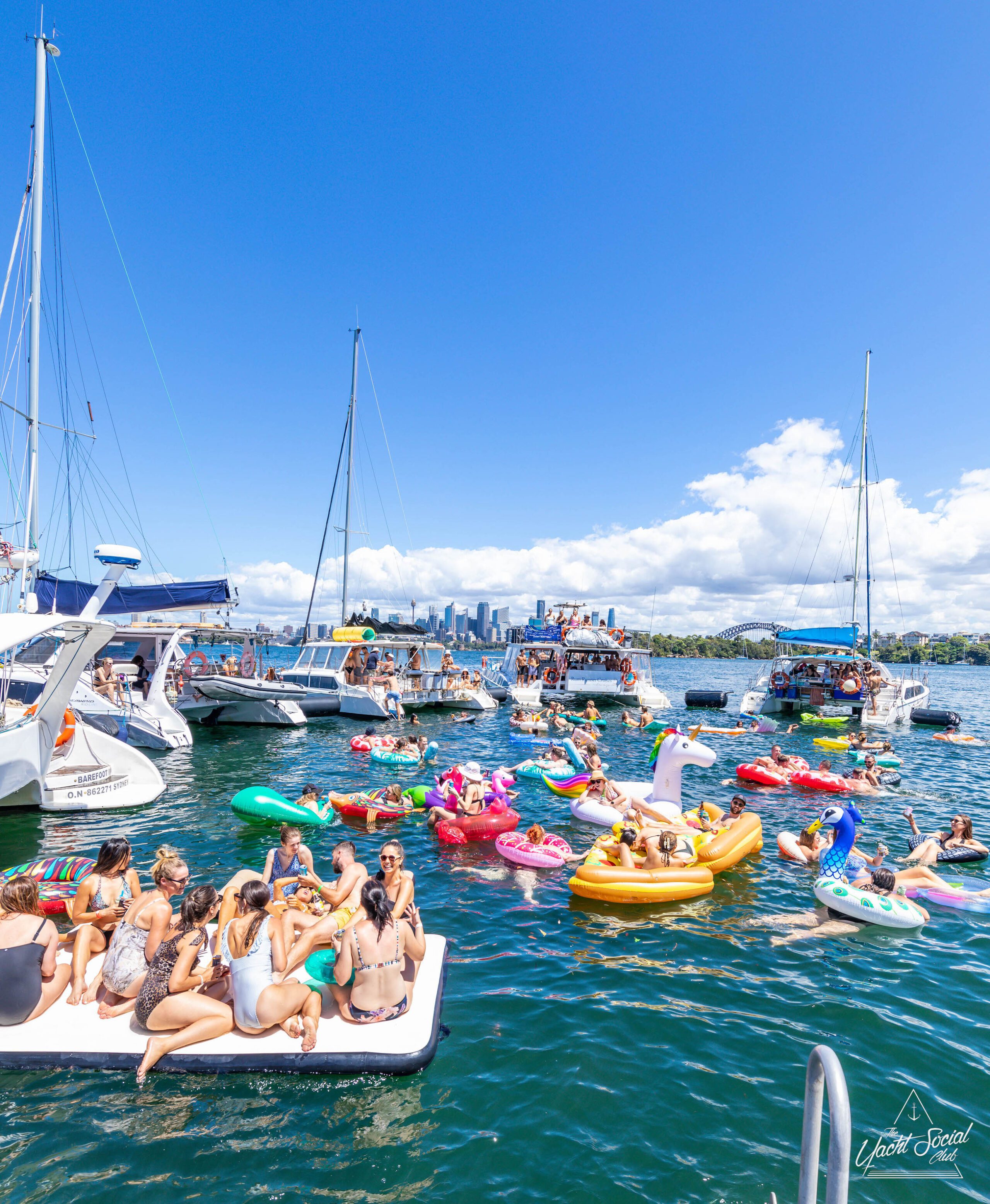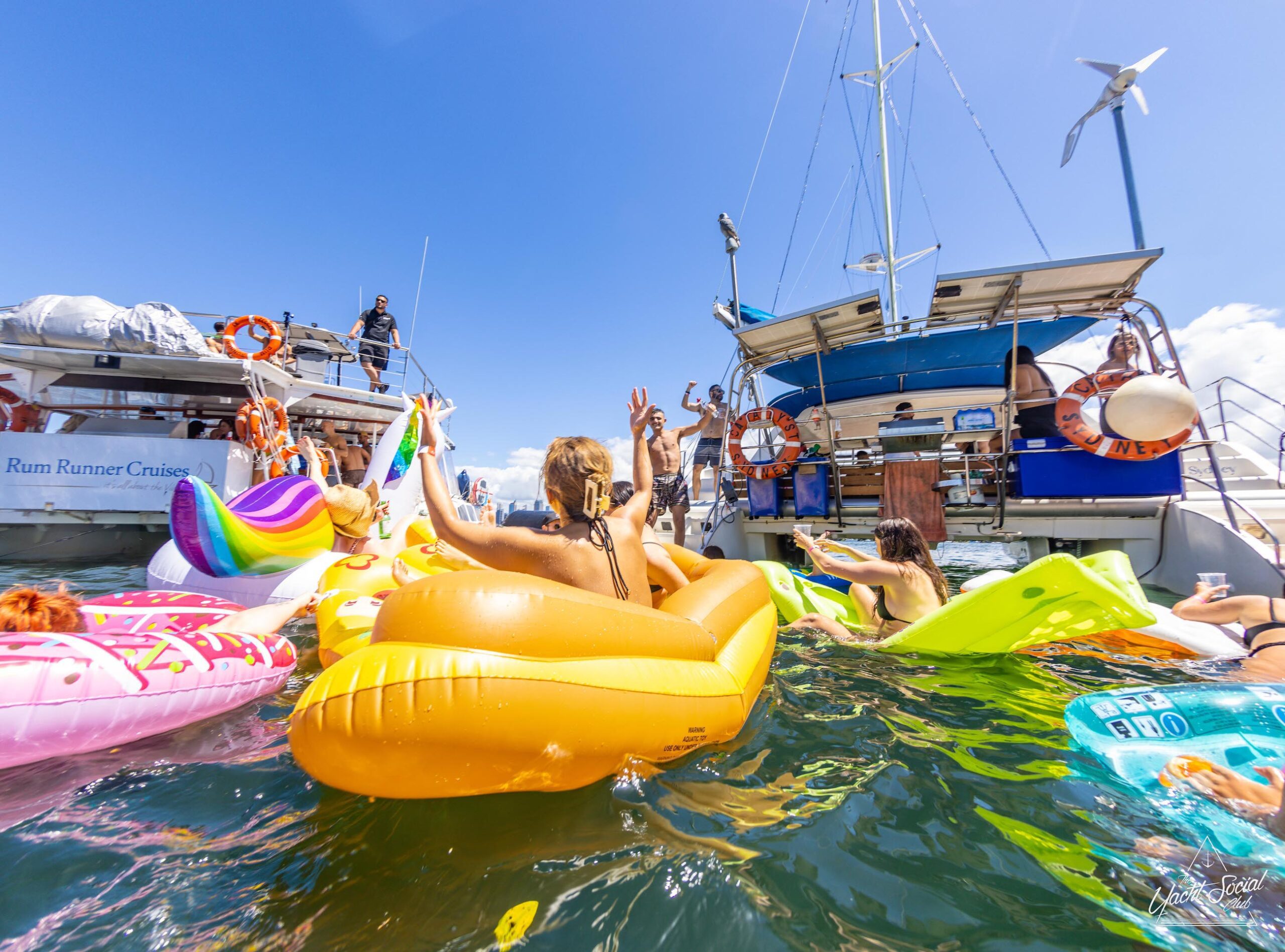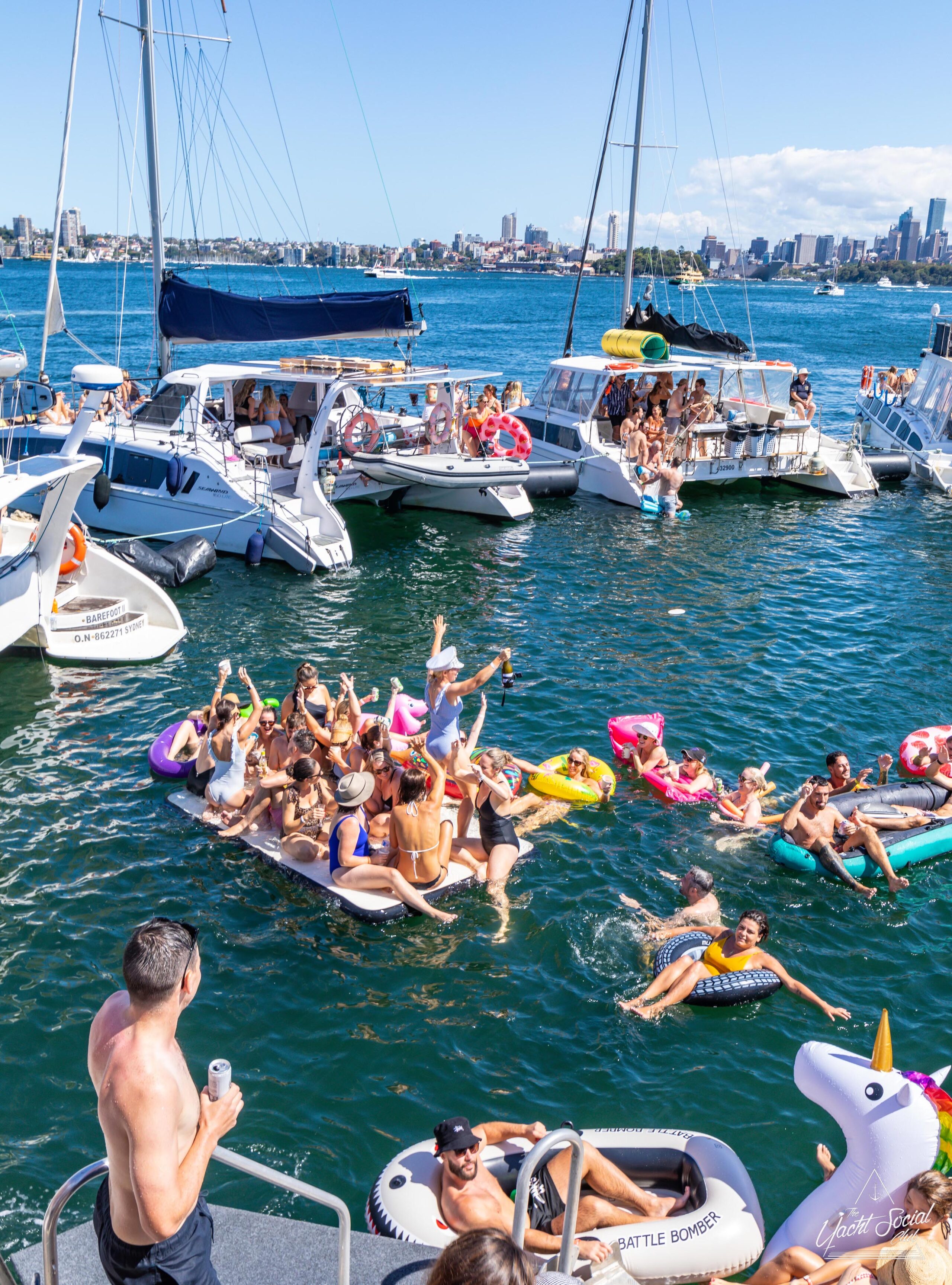 People on inflatable rafts and floaties enjoying a sunny day on the water with several boats and yachts, including a catamaran party Sydney in the background.
