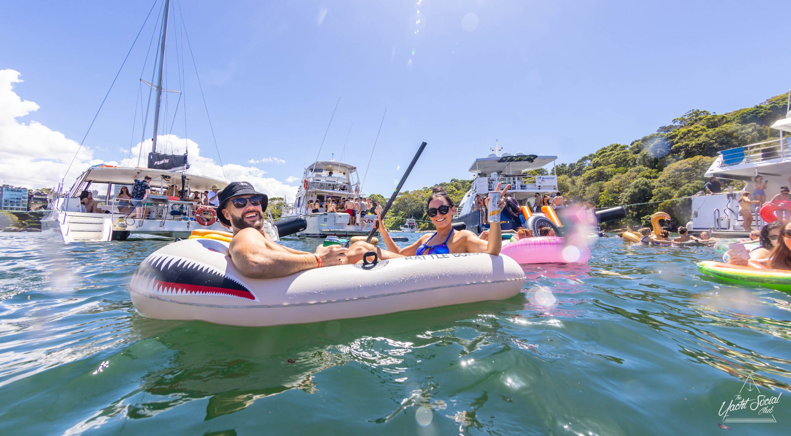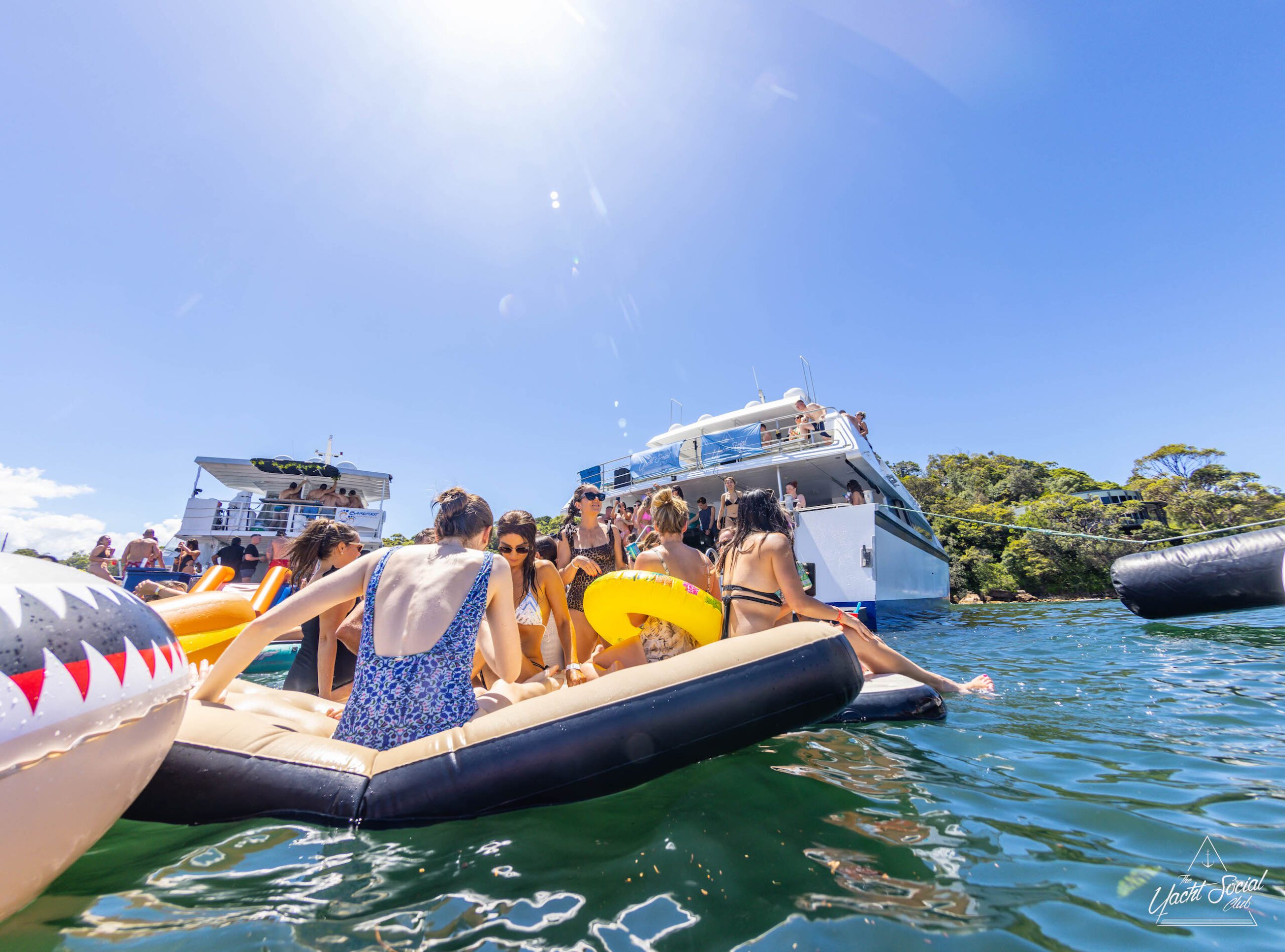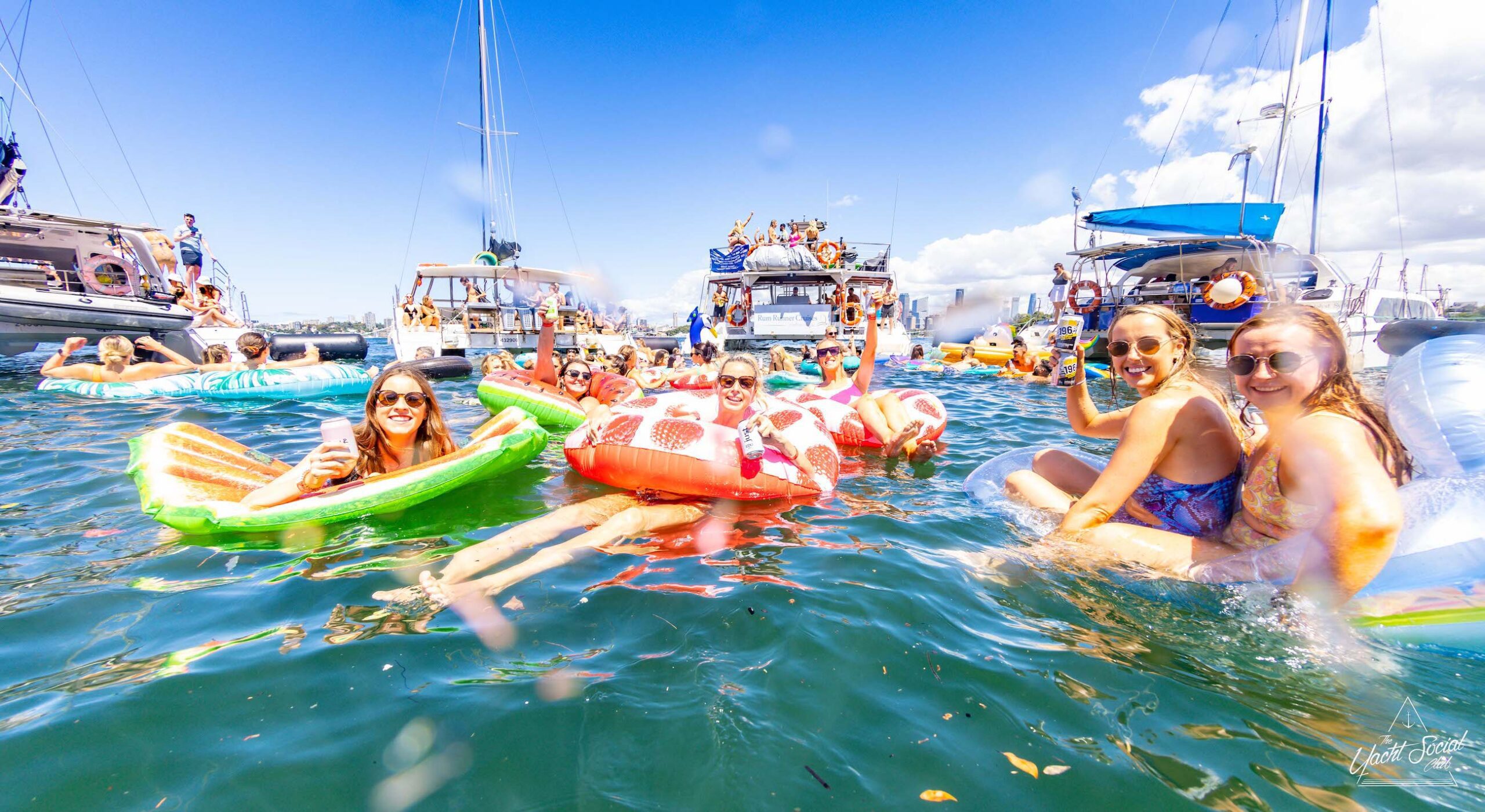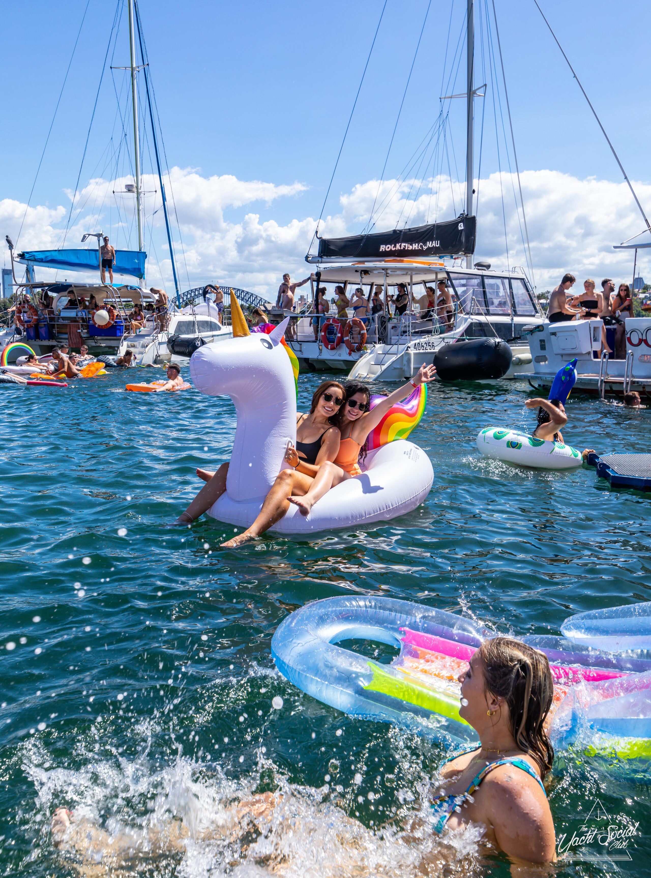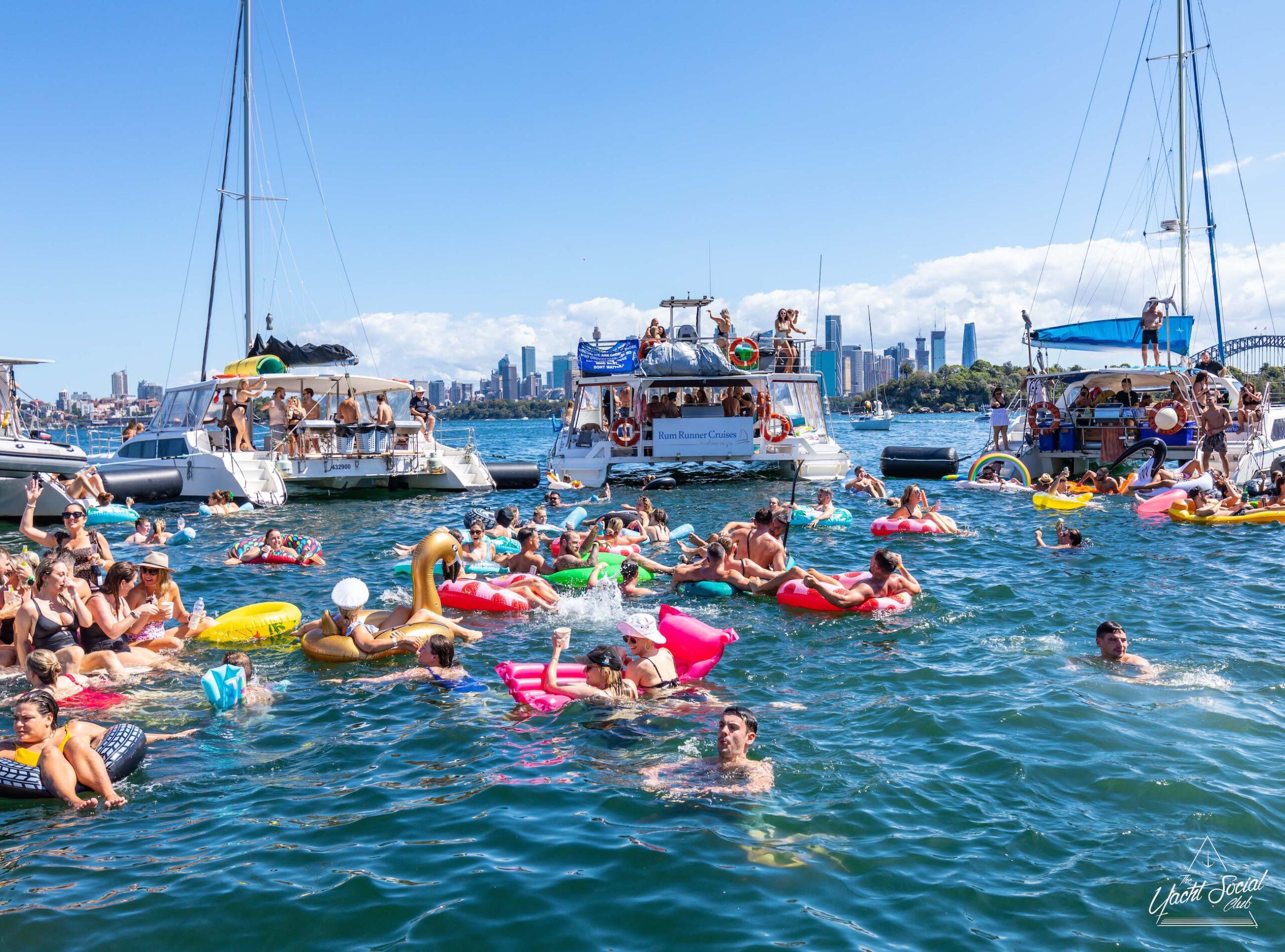 People on inflatable rafts and floaties enjoying a sunny day on the water with several boats and yachts, including a catamaran party Sydney in the background.