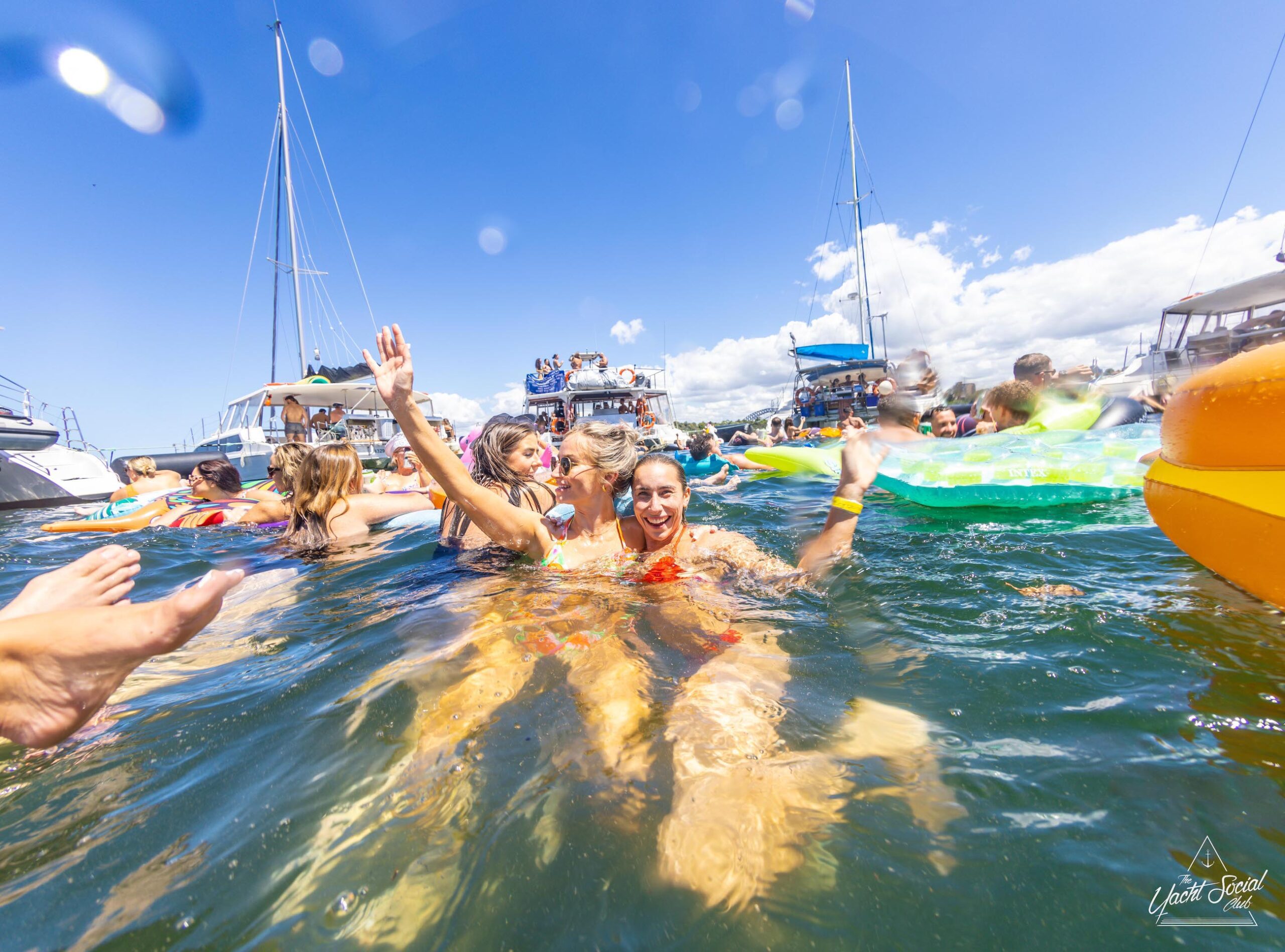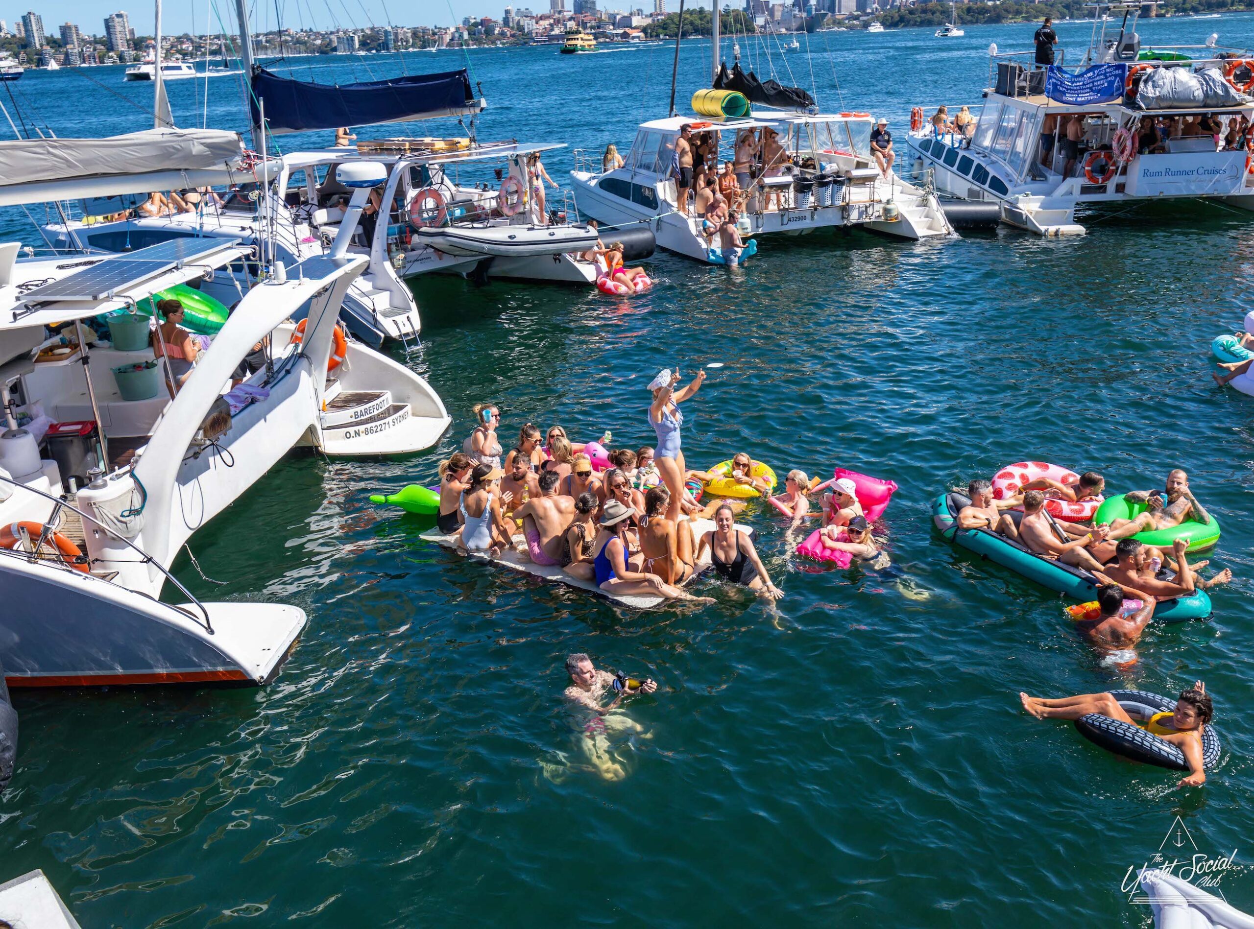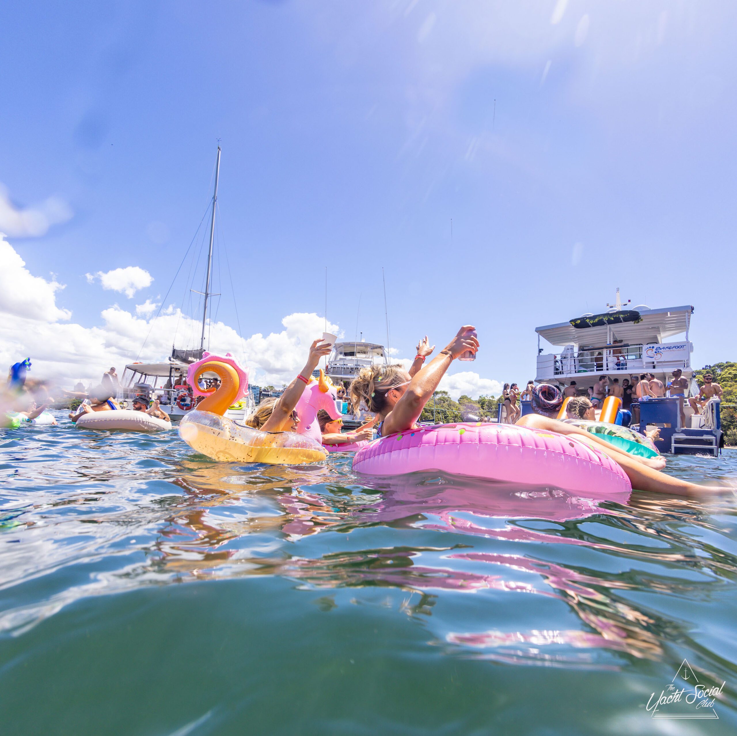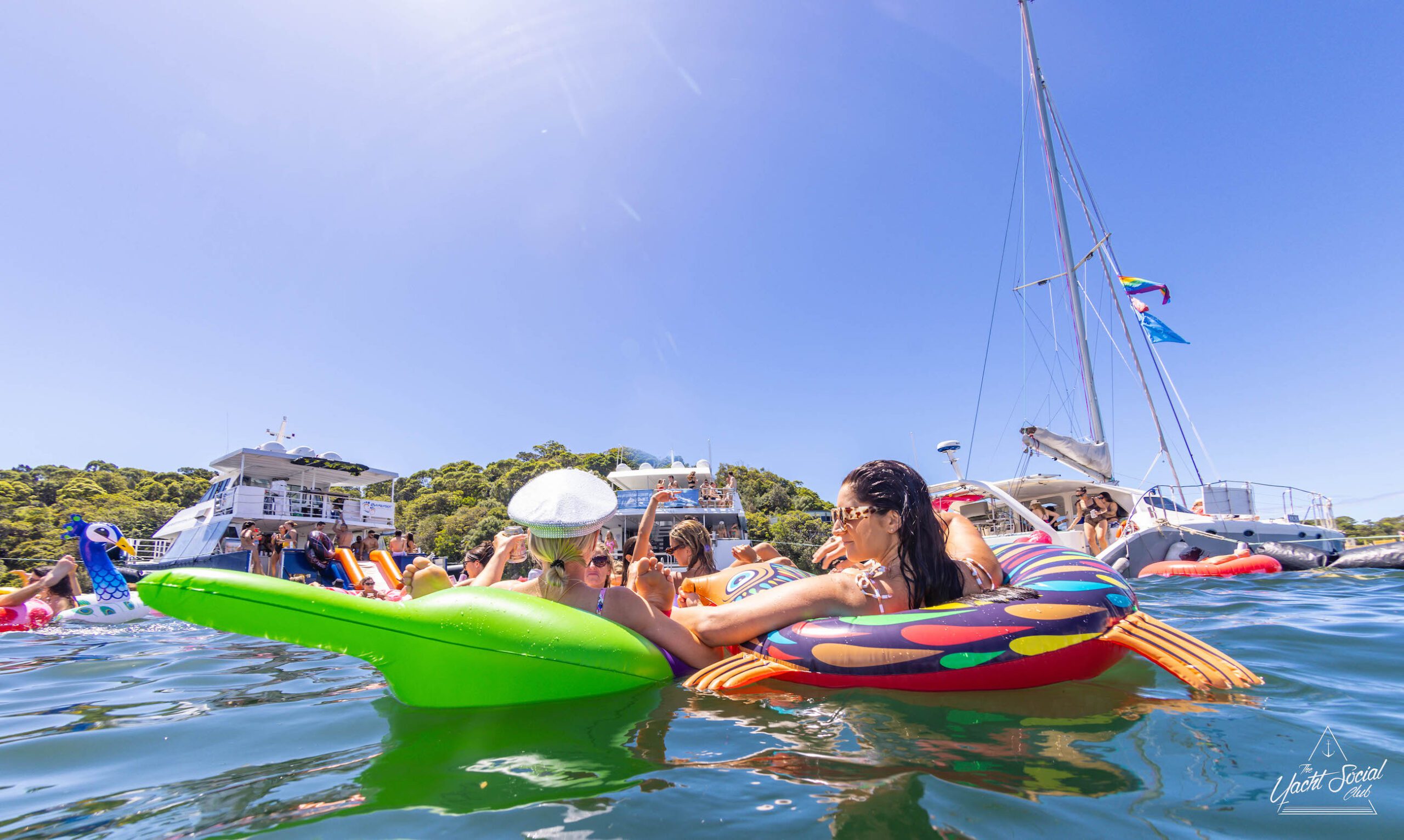 People on inflatable rafts and floaties enjoying a sunny day on the water with several boats and yachts, including a catamaran party Sydney in the background.