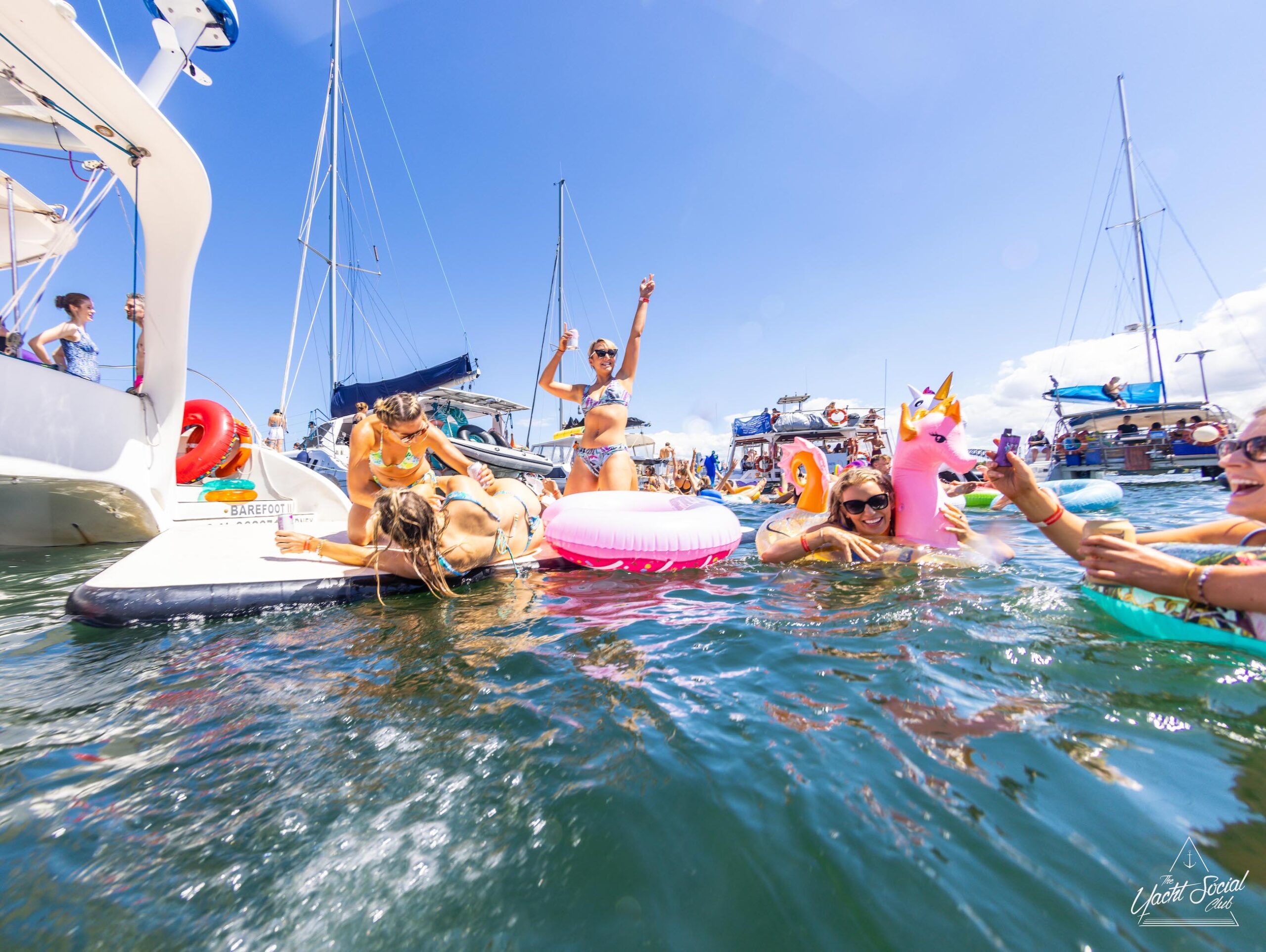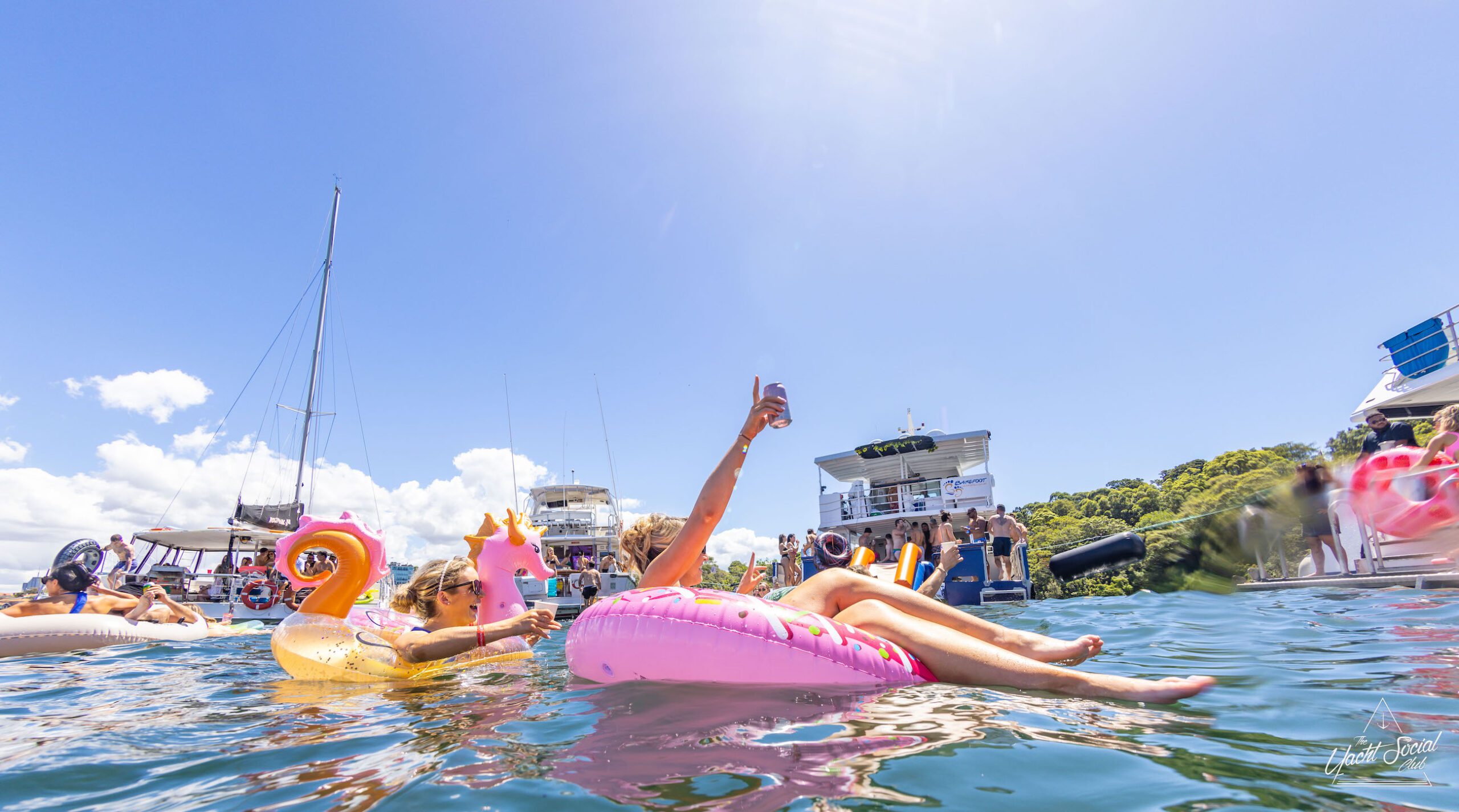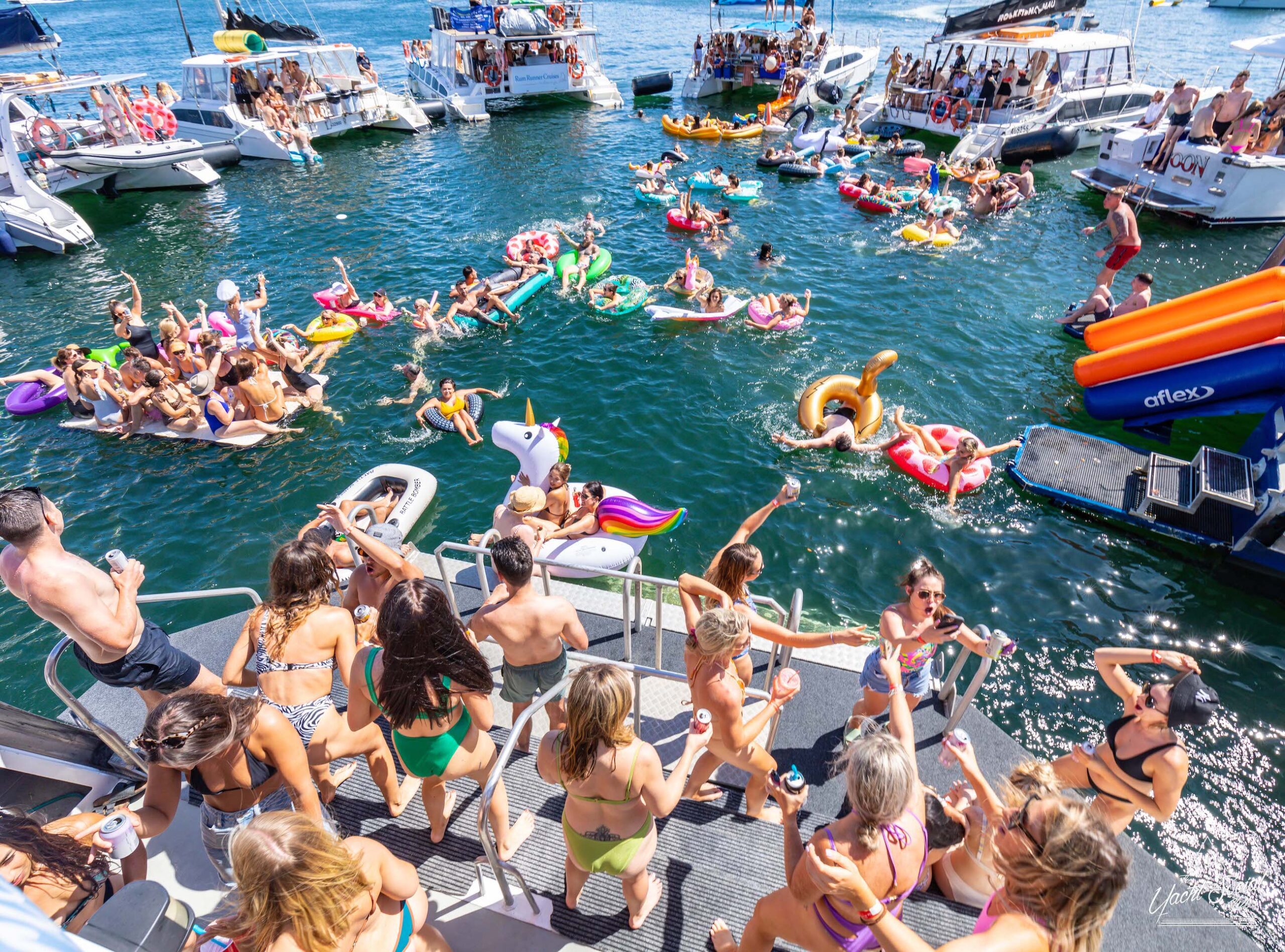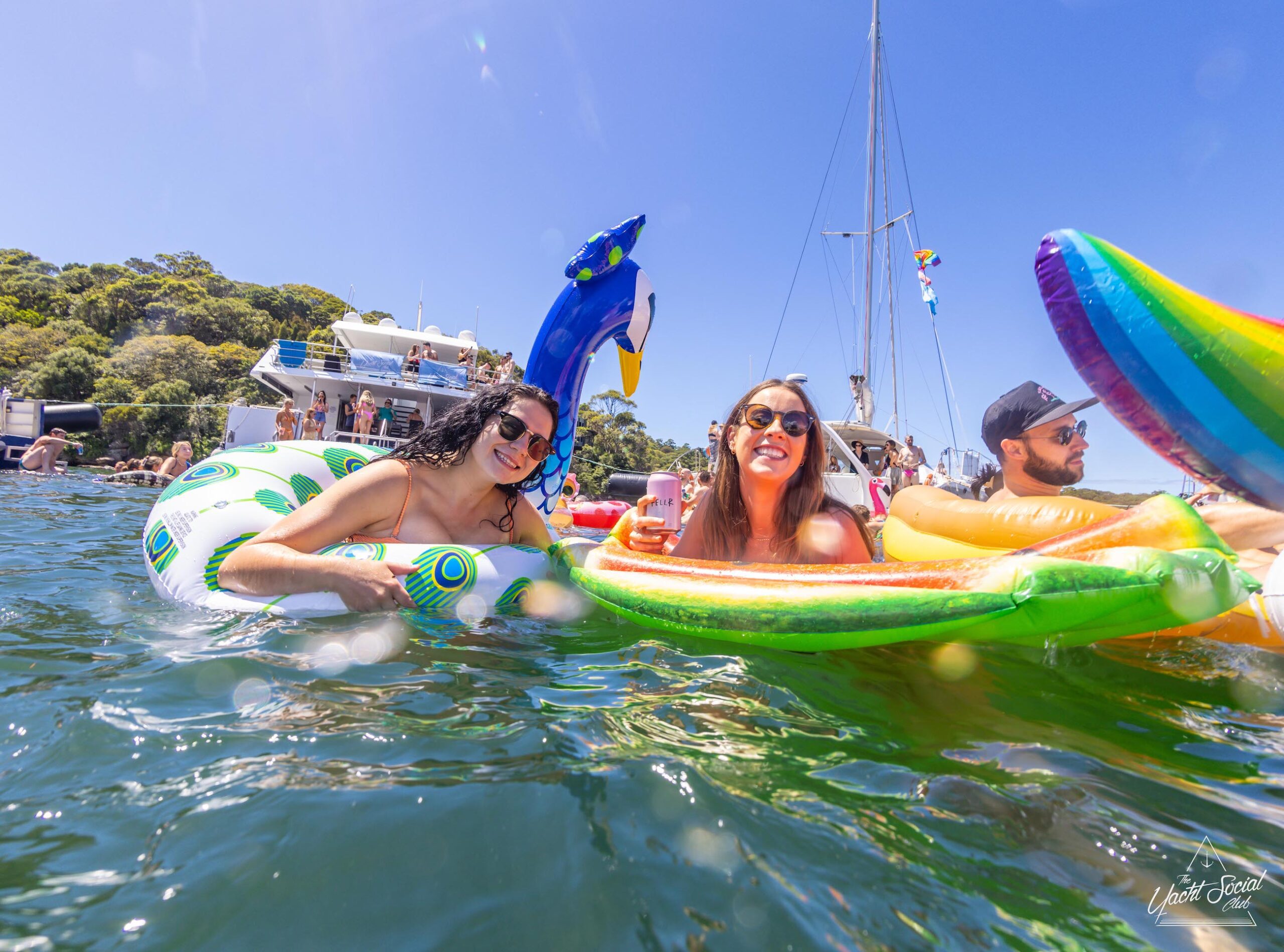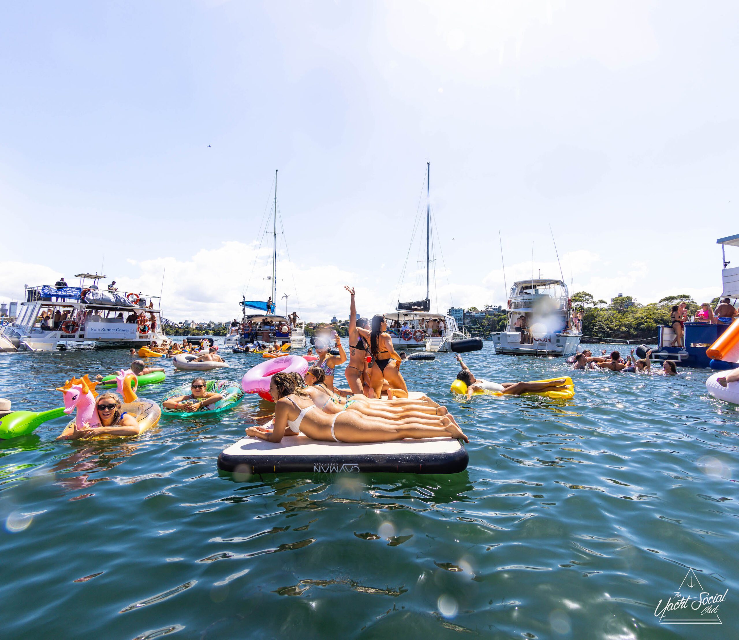 People on inflatable rafts and floaties enjoying a sunny day on the water with several boats and yachts, including a catamaran party Sydney in the background.