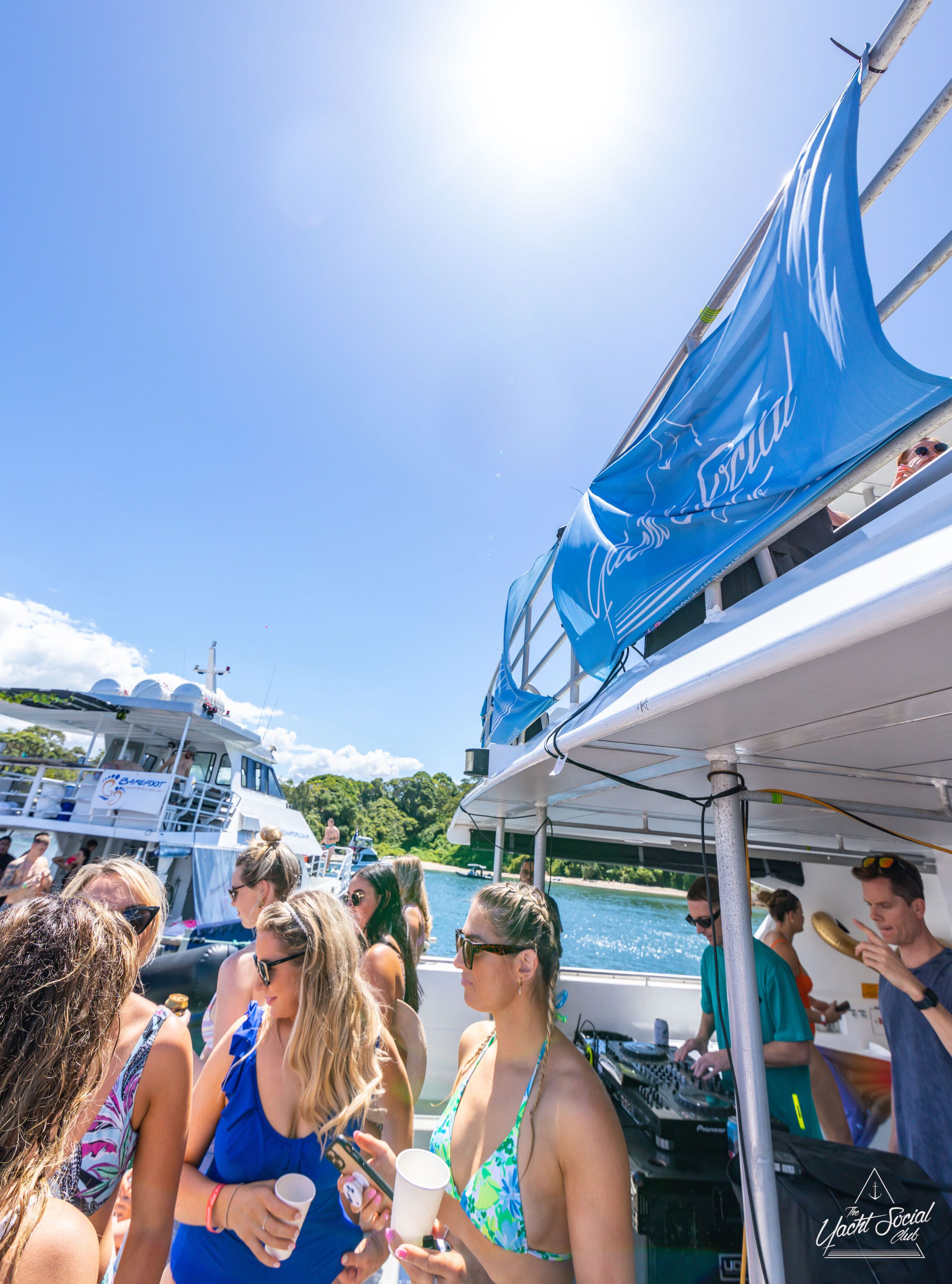 A group of people in swimwear dance and socialize on a luxury yacht near DJ equipment on a sunny day.