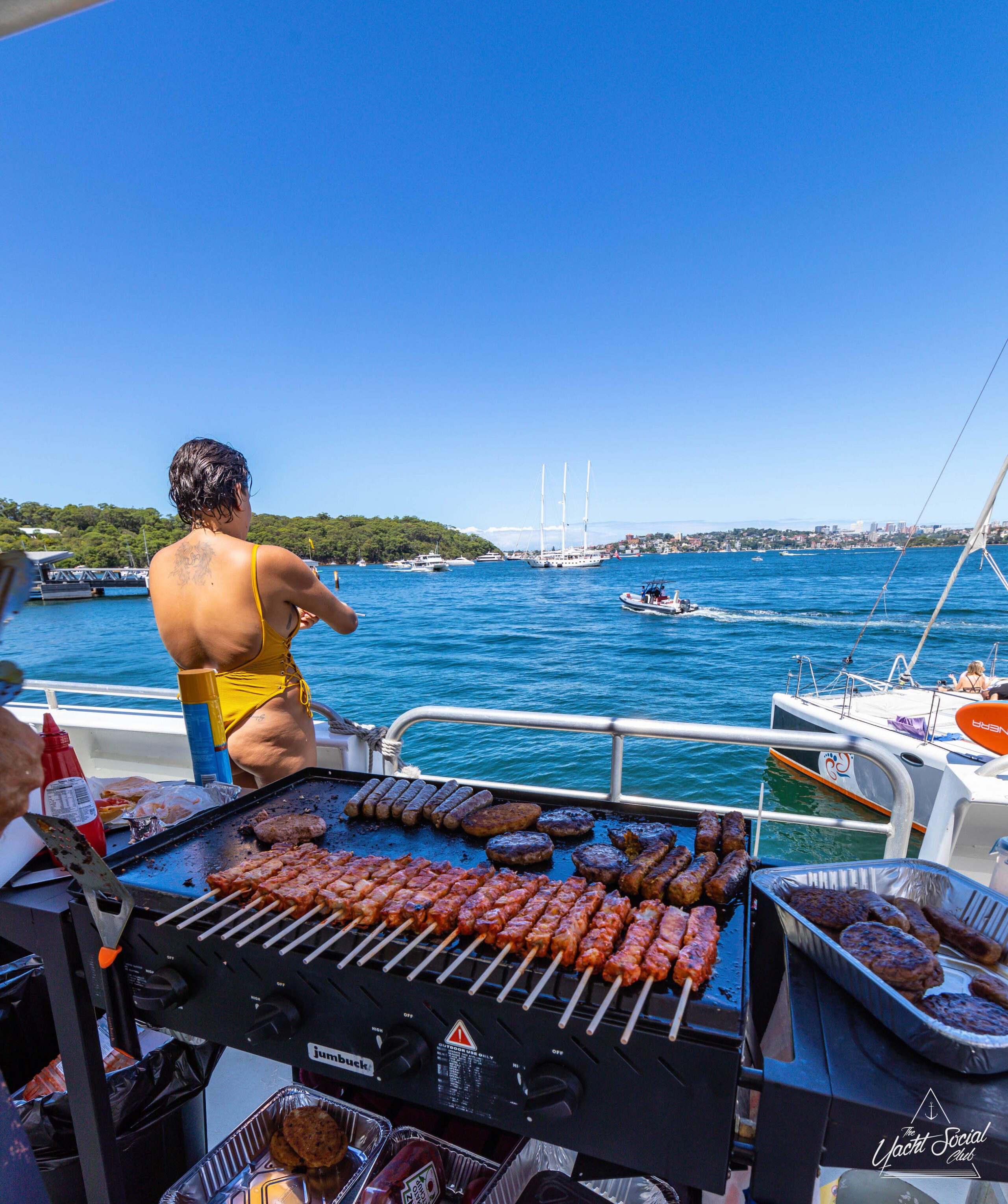 A DJ performs on a private yacht charter in Sydney Harbour while a crowd of people in swimwear dance and enjoy a sunny day on the water, with the city skyline in the background.