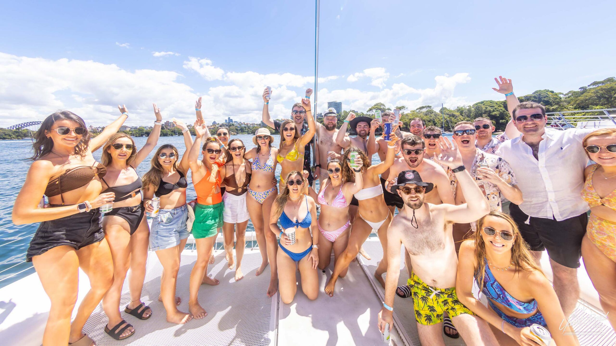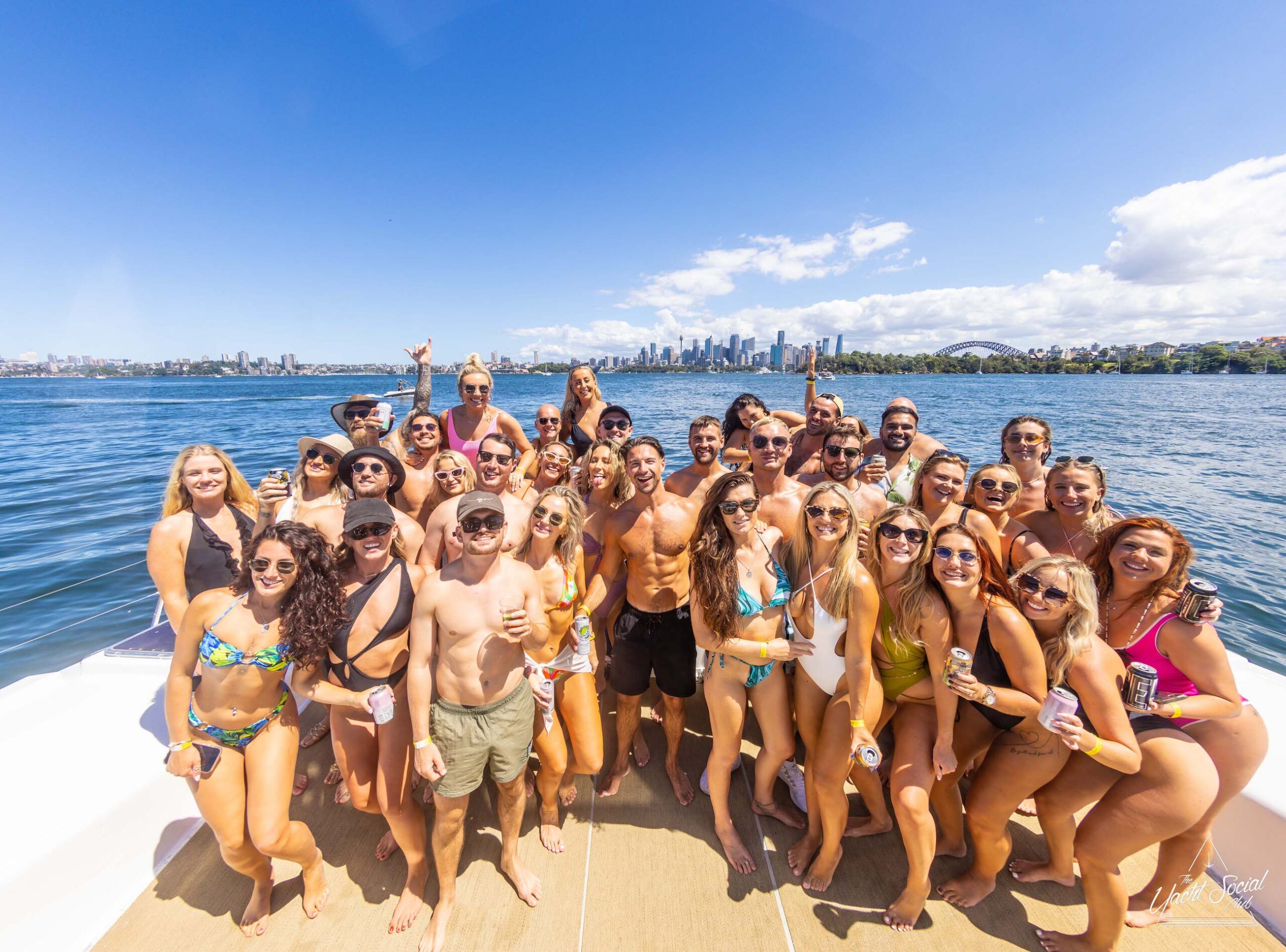 A large group of people on a private yacht charter in Sydney Harbour, smiling and posing for a picture under sunny skies. Some wear swimwear and hats, while others hold drinks. A watercraft is visible in the background.