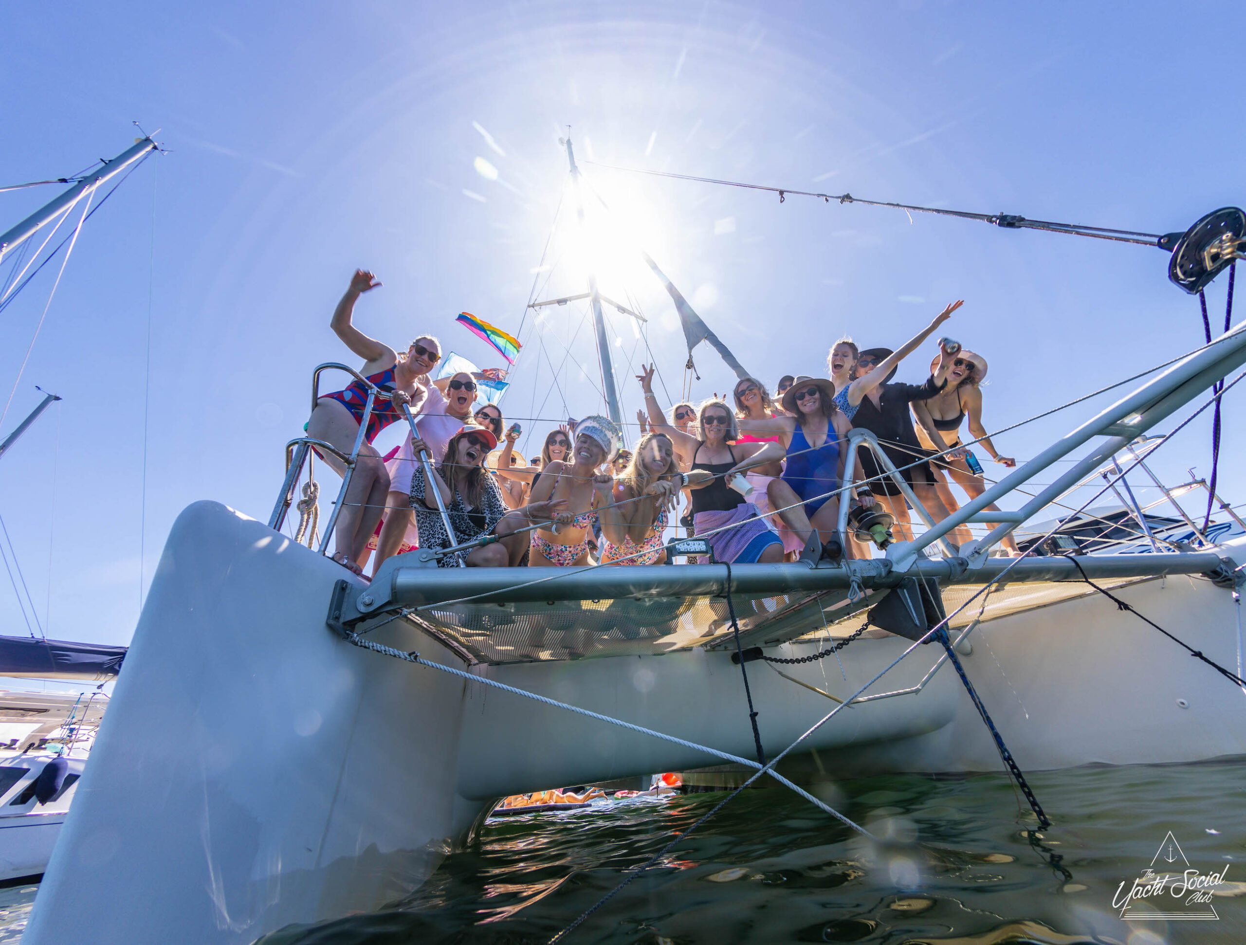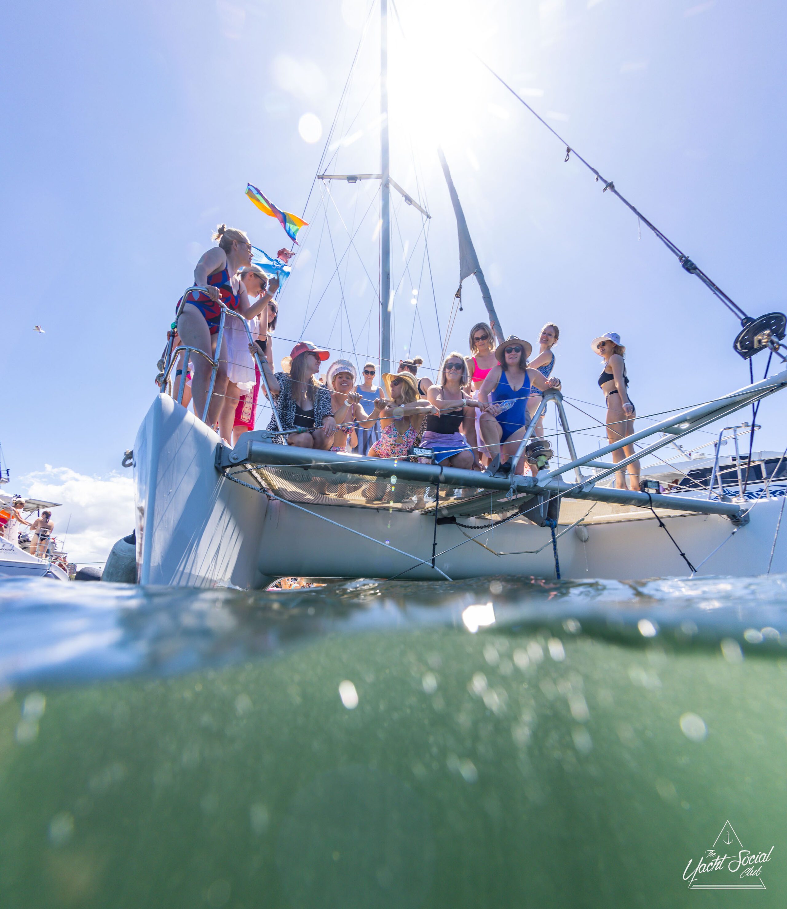 A group of people on a sailboat pose for a photo. Some are sitting and some are standing, with a rainbow flag visible in the background. The photo, taken partially from underwater, could be from a Sydney boat party hire event.