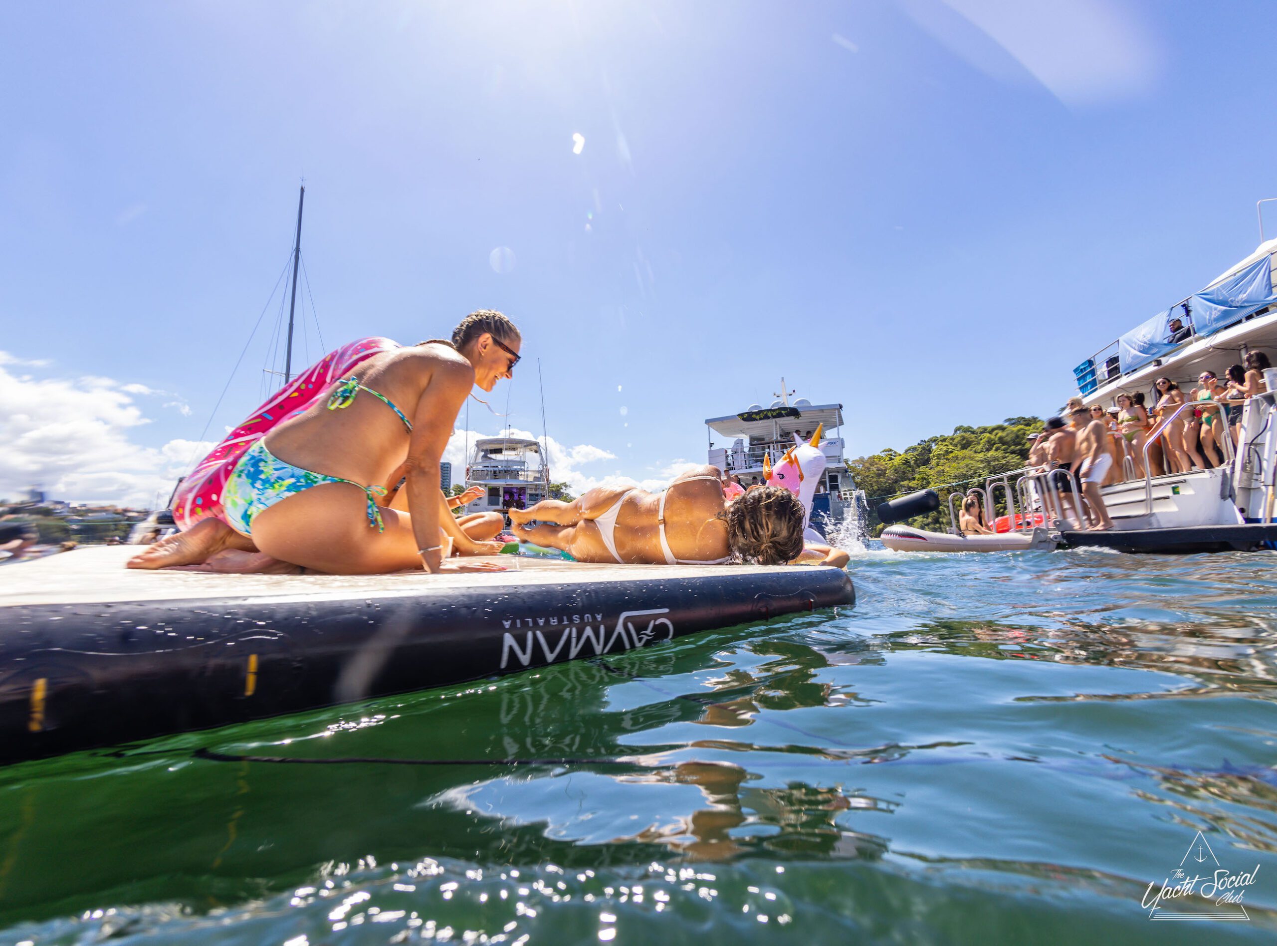 A group of people in swimwear dance on a floating platform in the water with boats and greenery in the background, creating the perfect scene for a private yacht charter on Sydney Harbour.