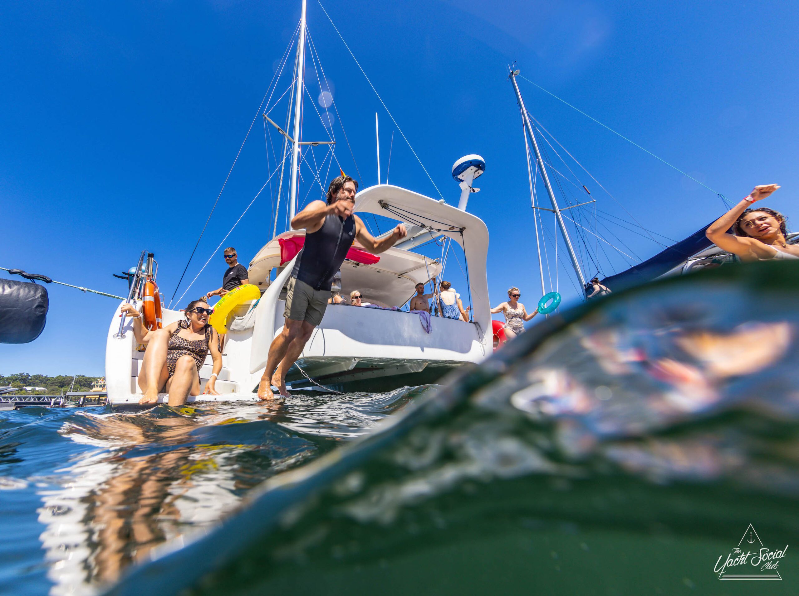 A group of people enjoys a sunny day on the water, playing and splashing near sailboats. Some individuals kneel and cheer while others swim or relax on the boat during a luxurious catamaran party Sydney experience.