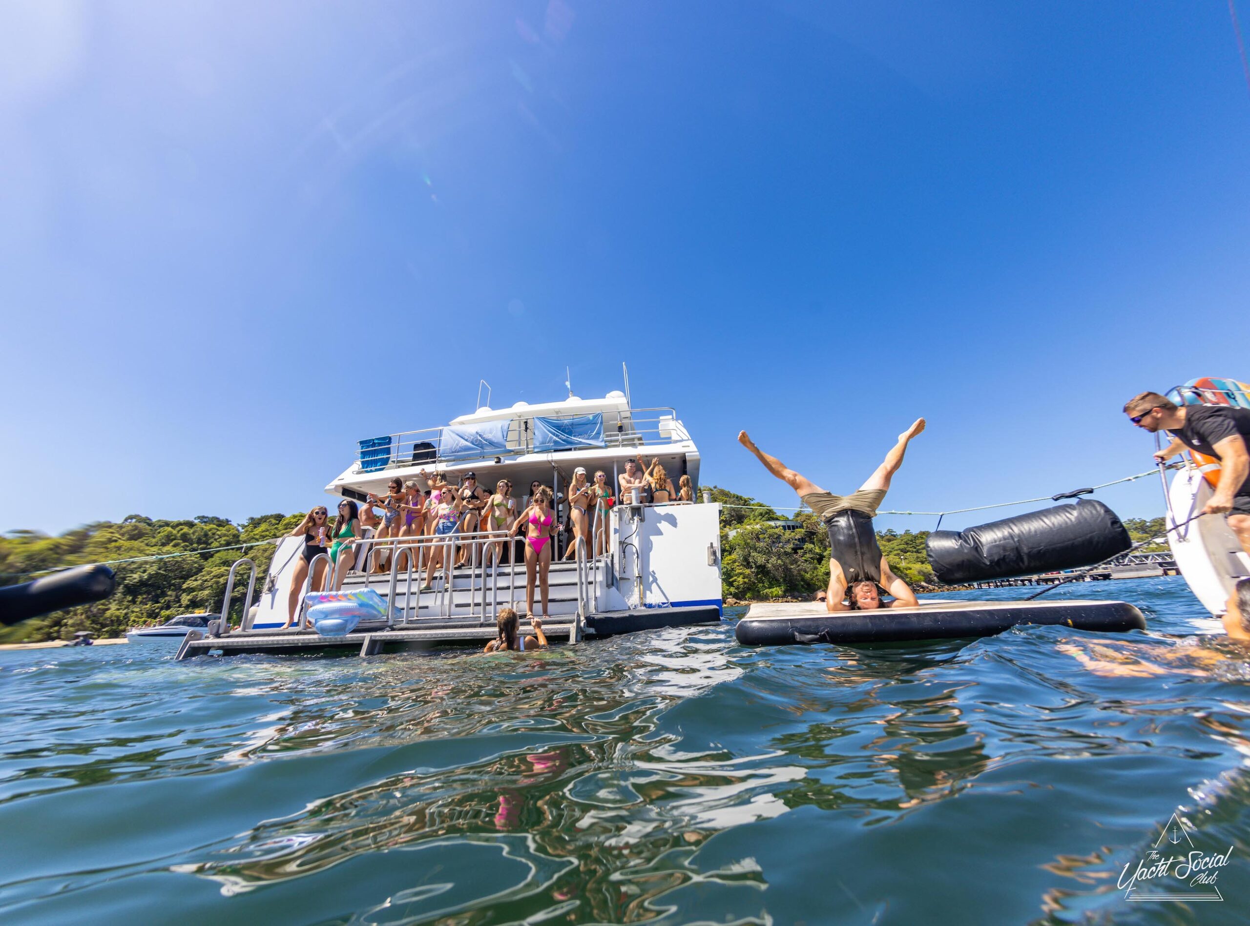 A group of people enjoy time on a luxury yacht hire in Sydney. Some are on the boat's deck, while one person performs a handstand on a floating platform beside the boat. The backdrop is clear and sunny.