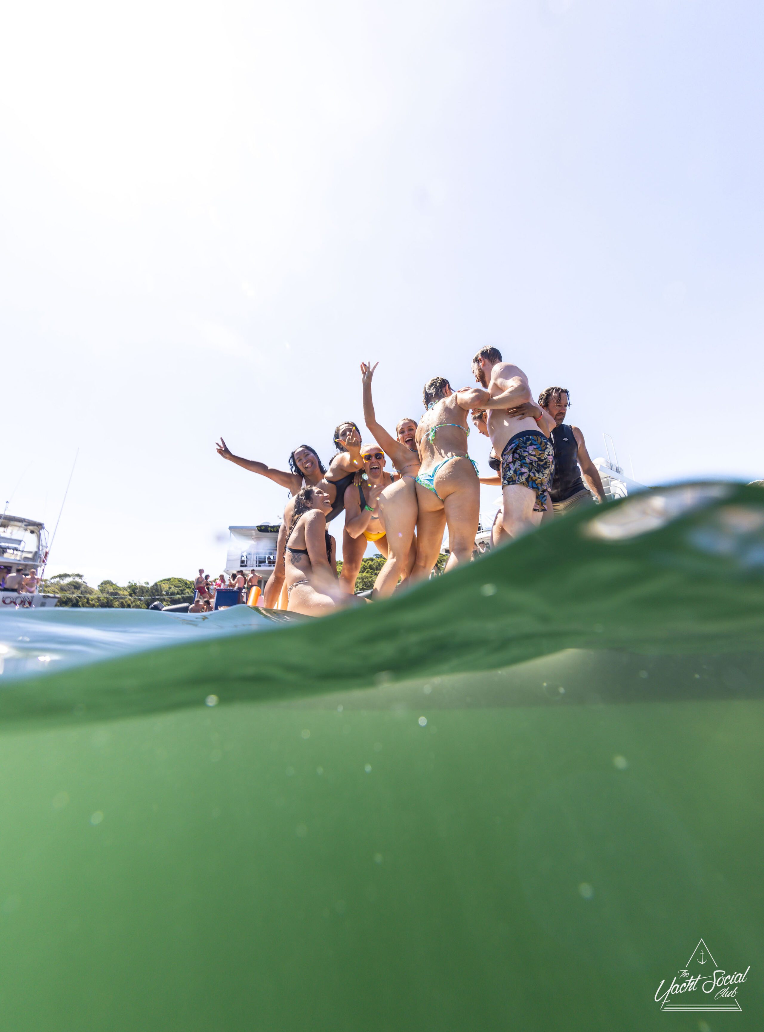A group of people in swimwear stands closely together on a floating platform in a body of water, with a boat and additional people in the background on a sunny day, enjoying a lively atmosphere reminiscent of a catamaran party Sydney.