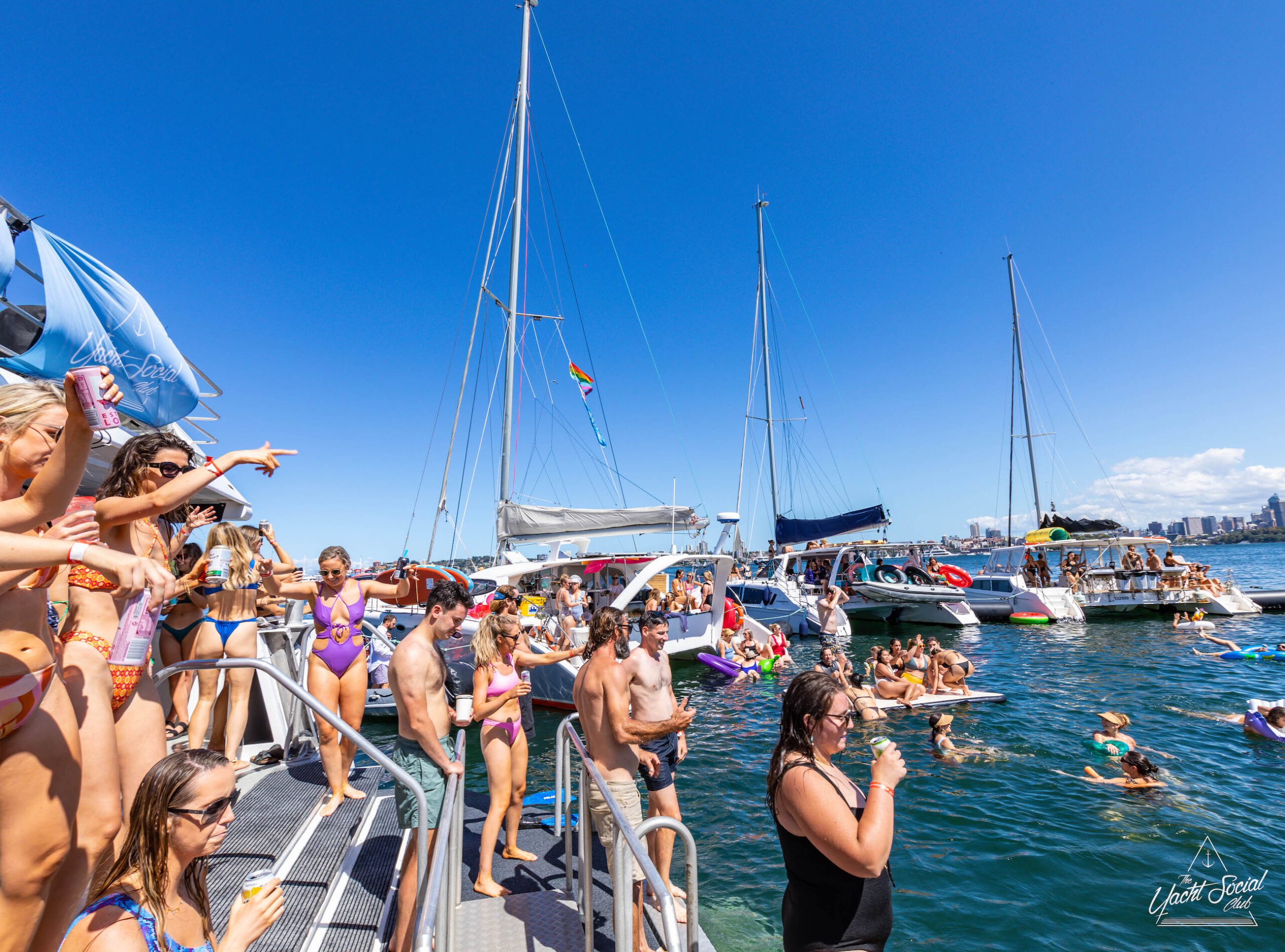 People in swimwear partying on a luxury yacht hire in Sydney Harbour, some holding drinks, with other boats and people in the water nearby on a sunny day. A rainbow flag is visible on one of the boats in the background.