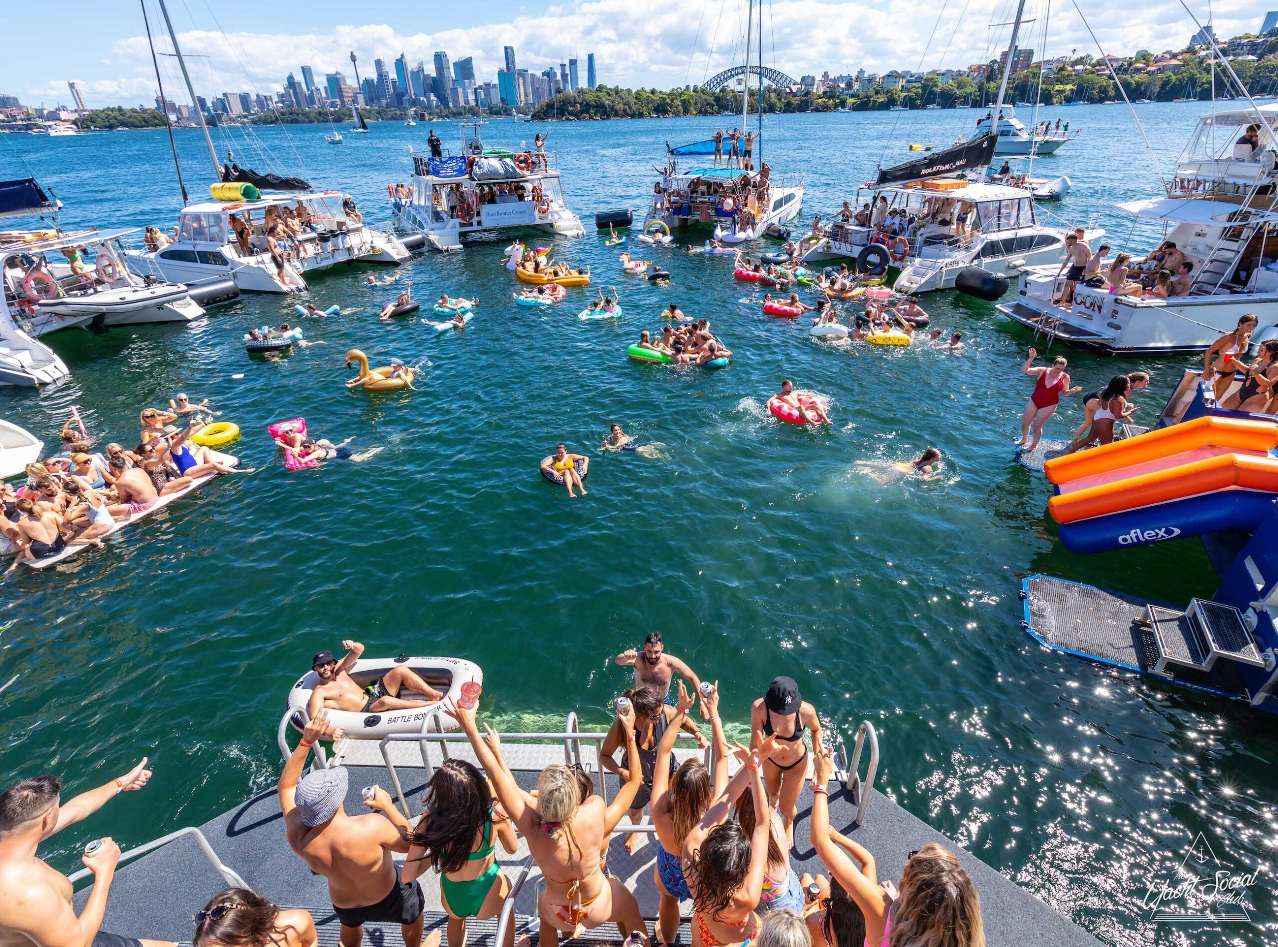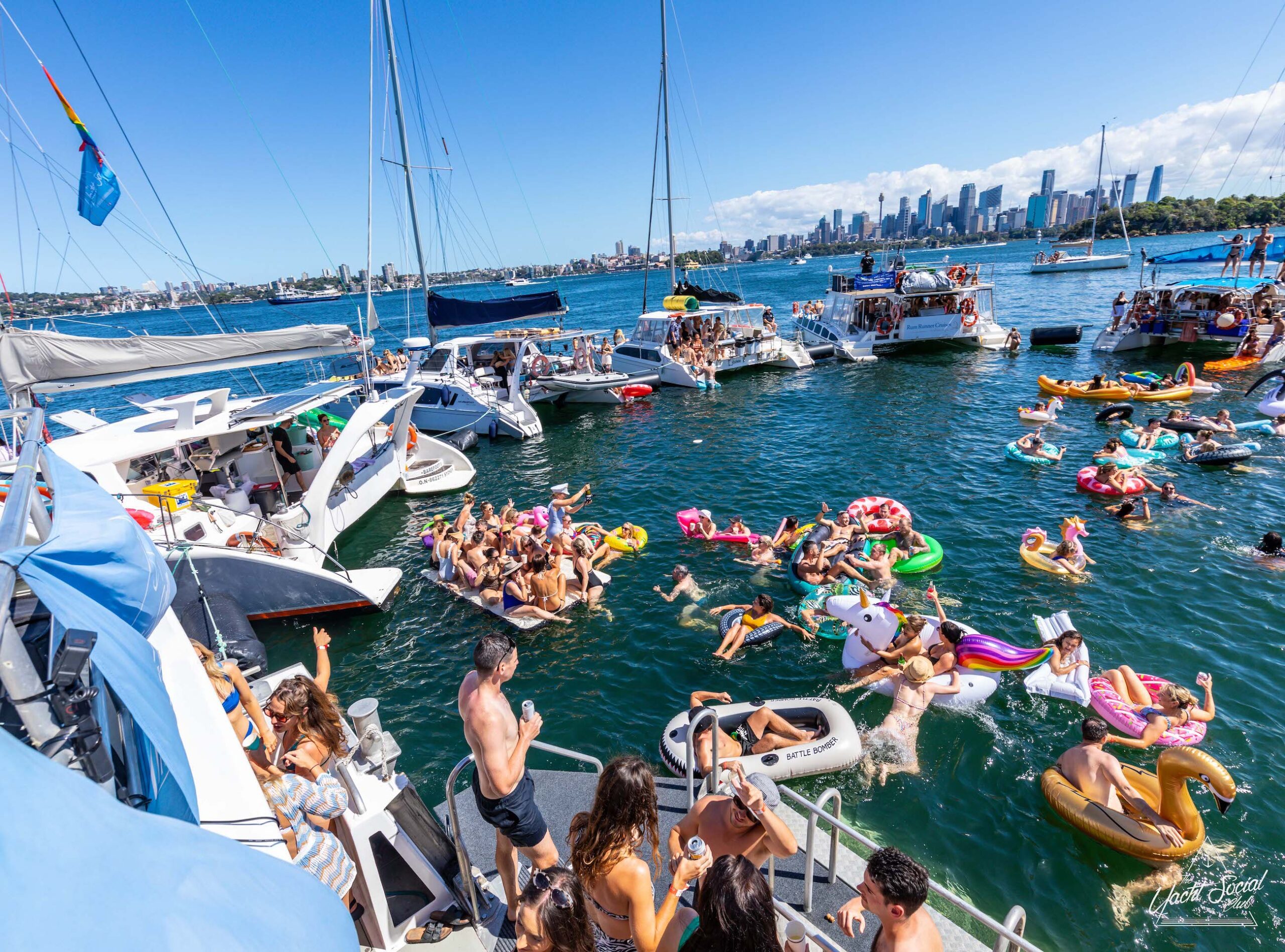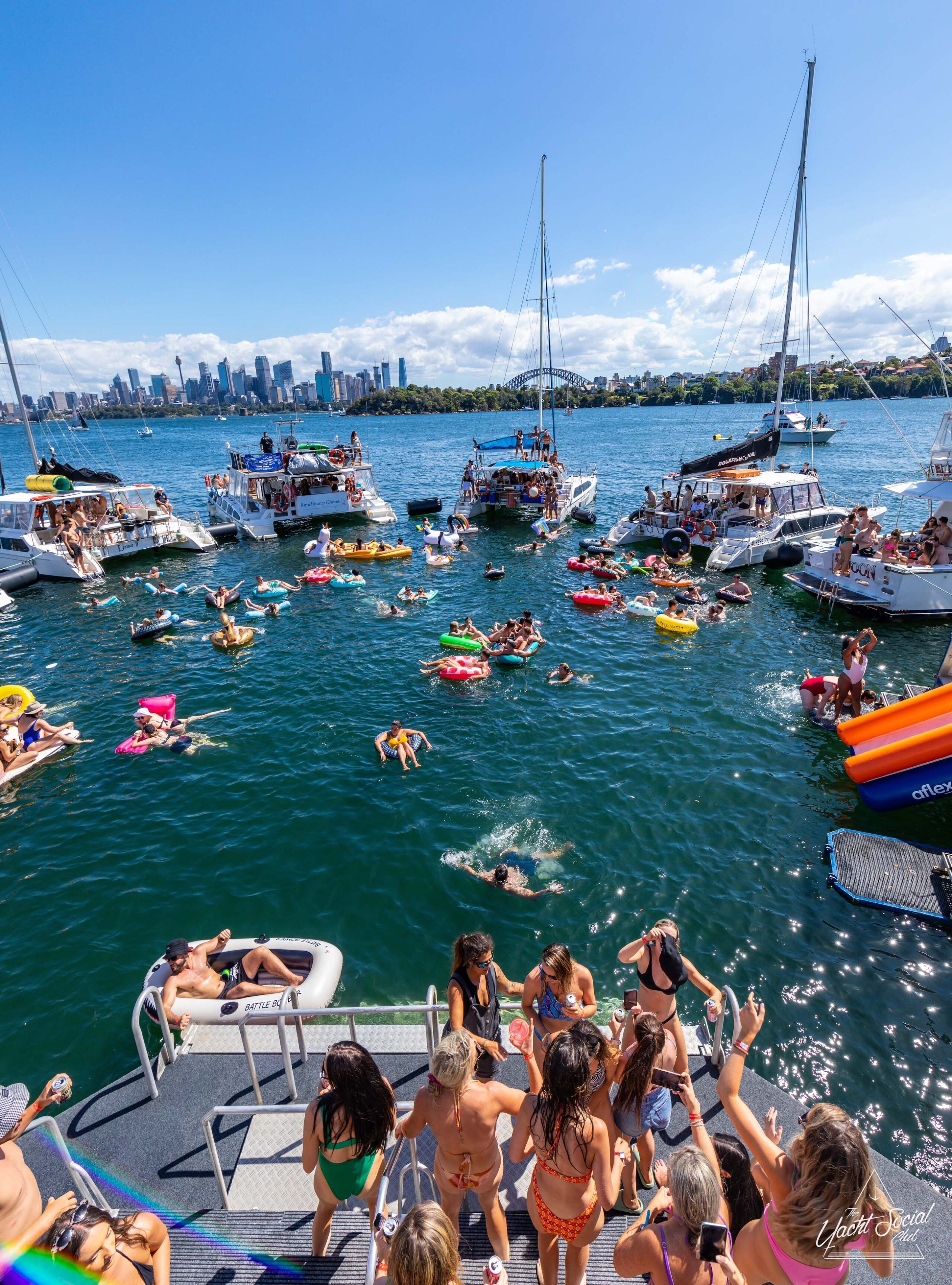 Large group of people in swimwear enjoying a lively Sydney boat party hire on a yacht-filled water, with many on inflatables, against a backdrop of city skyscrapers and a clear blue sky.