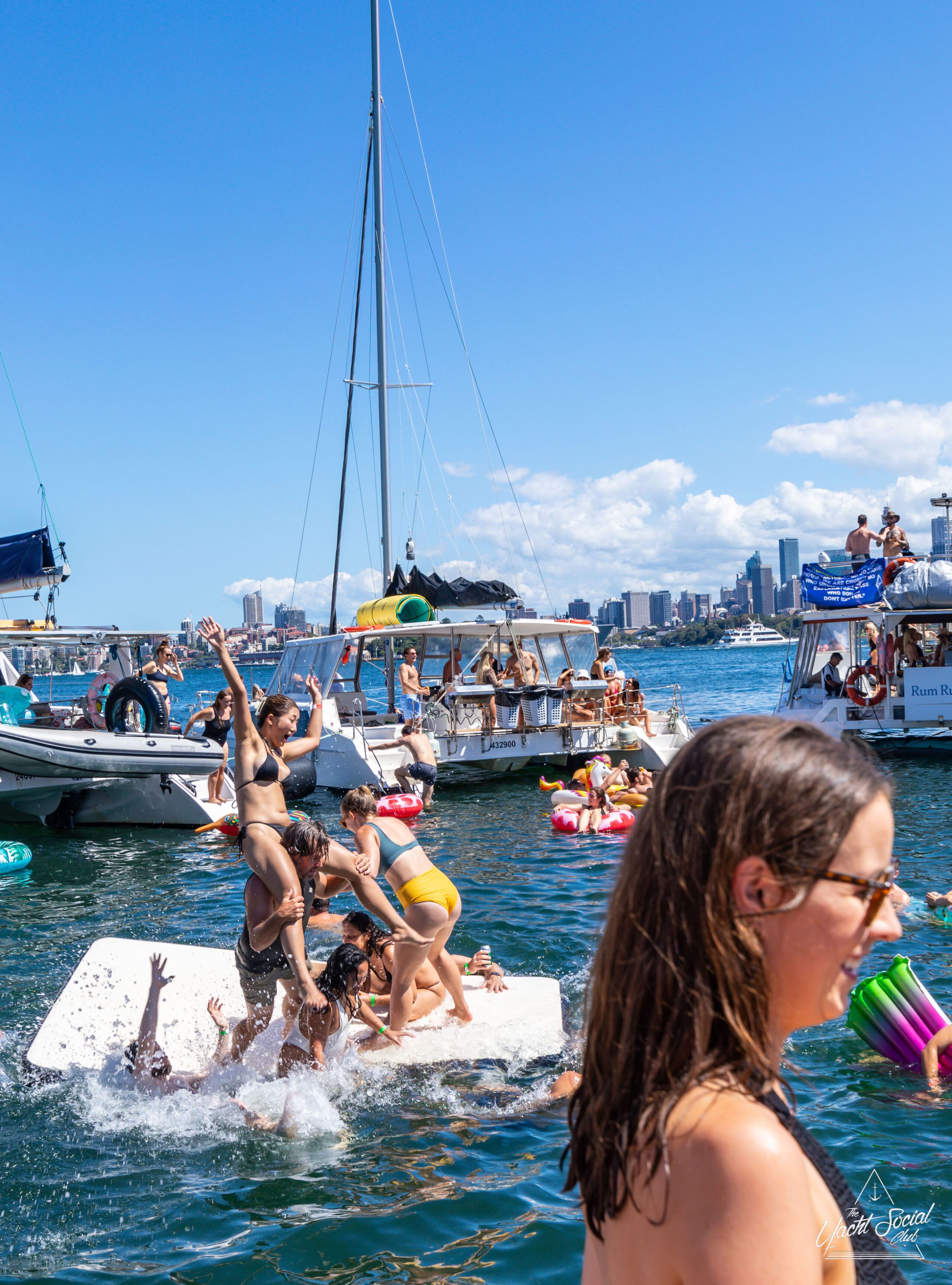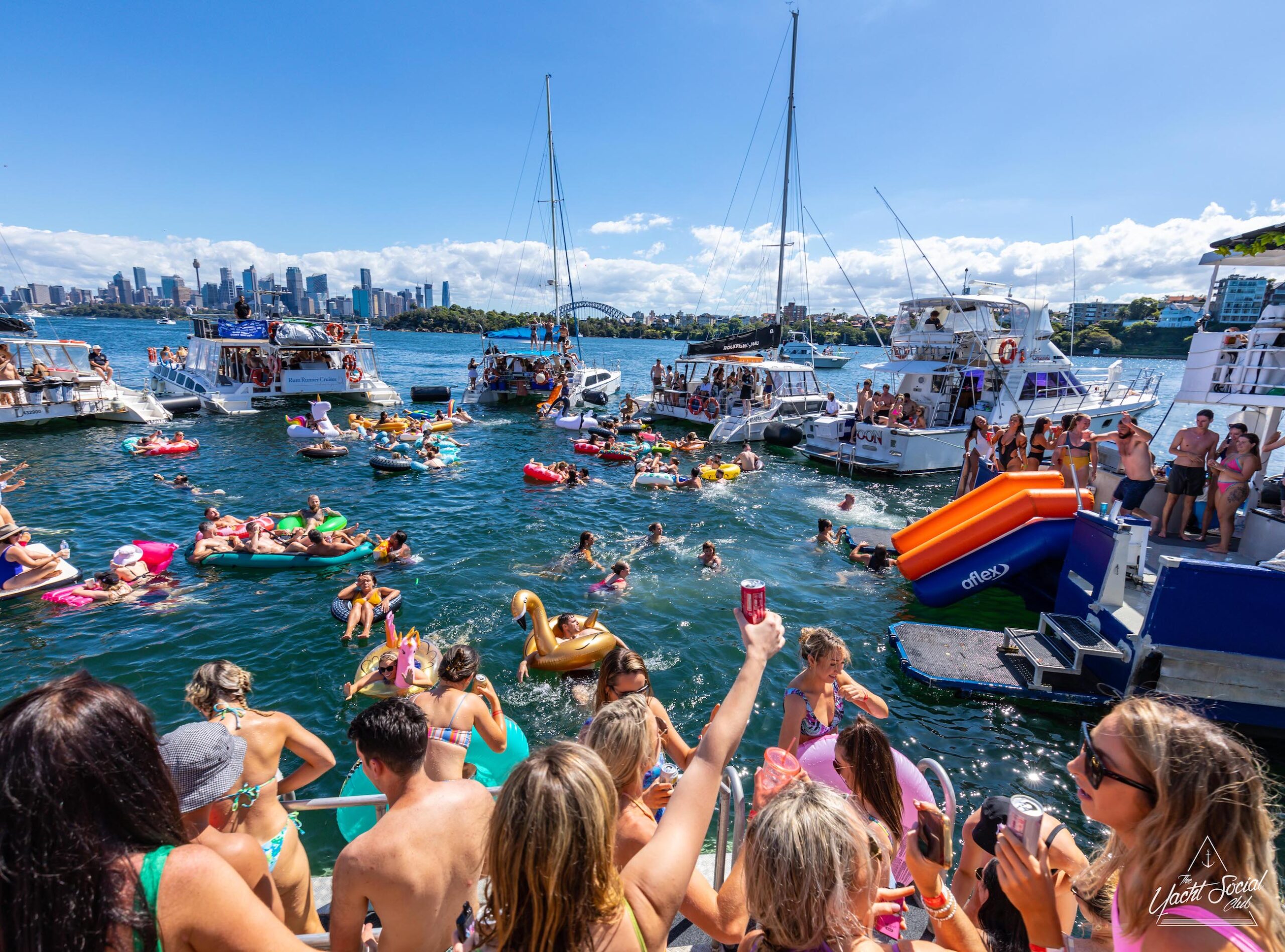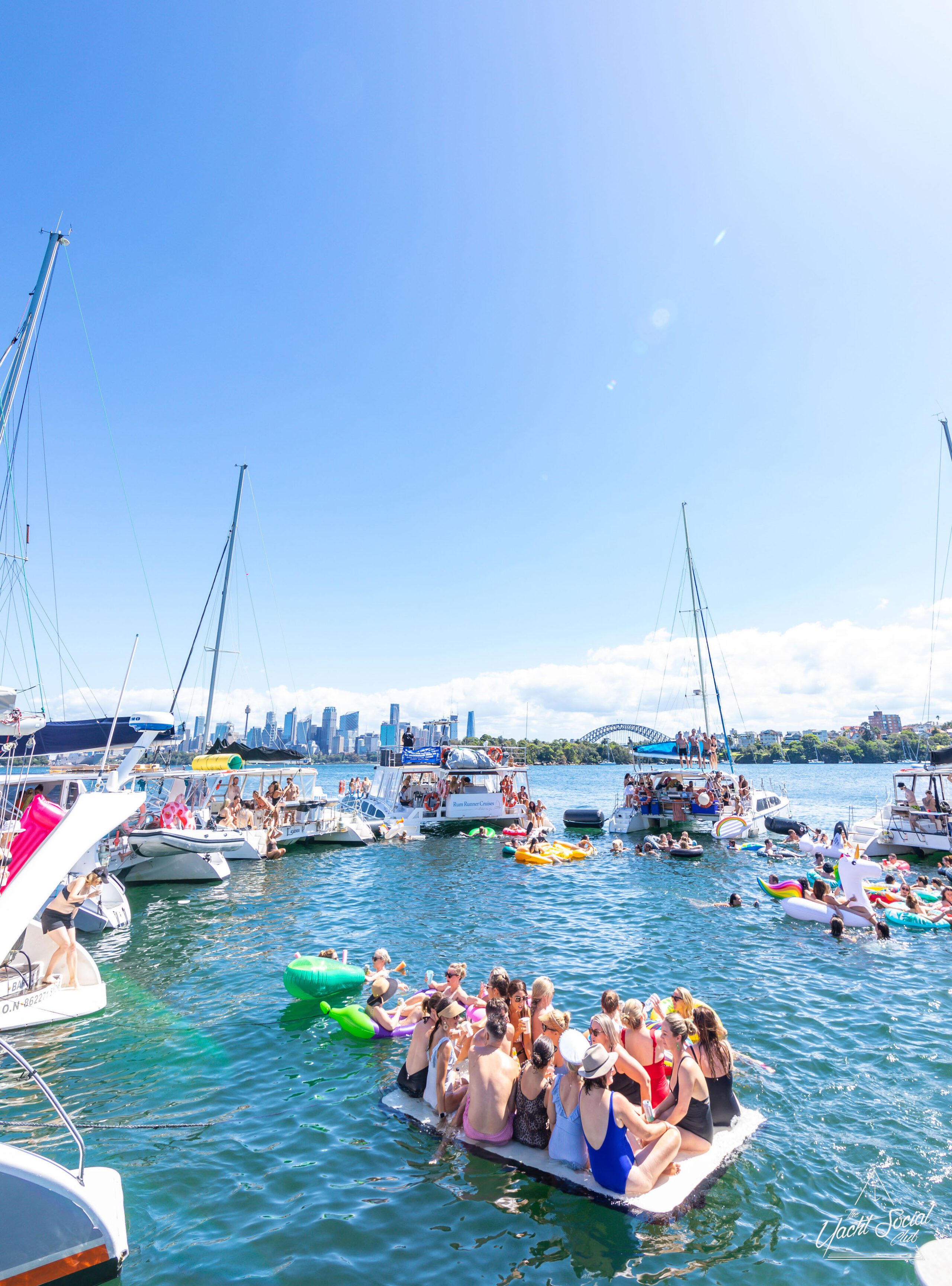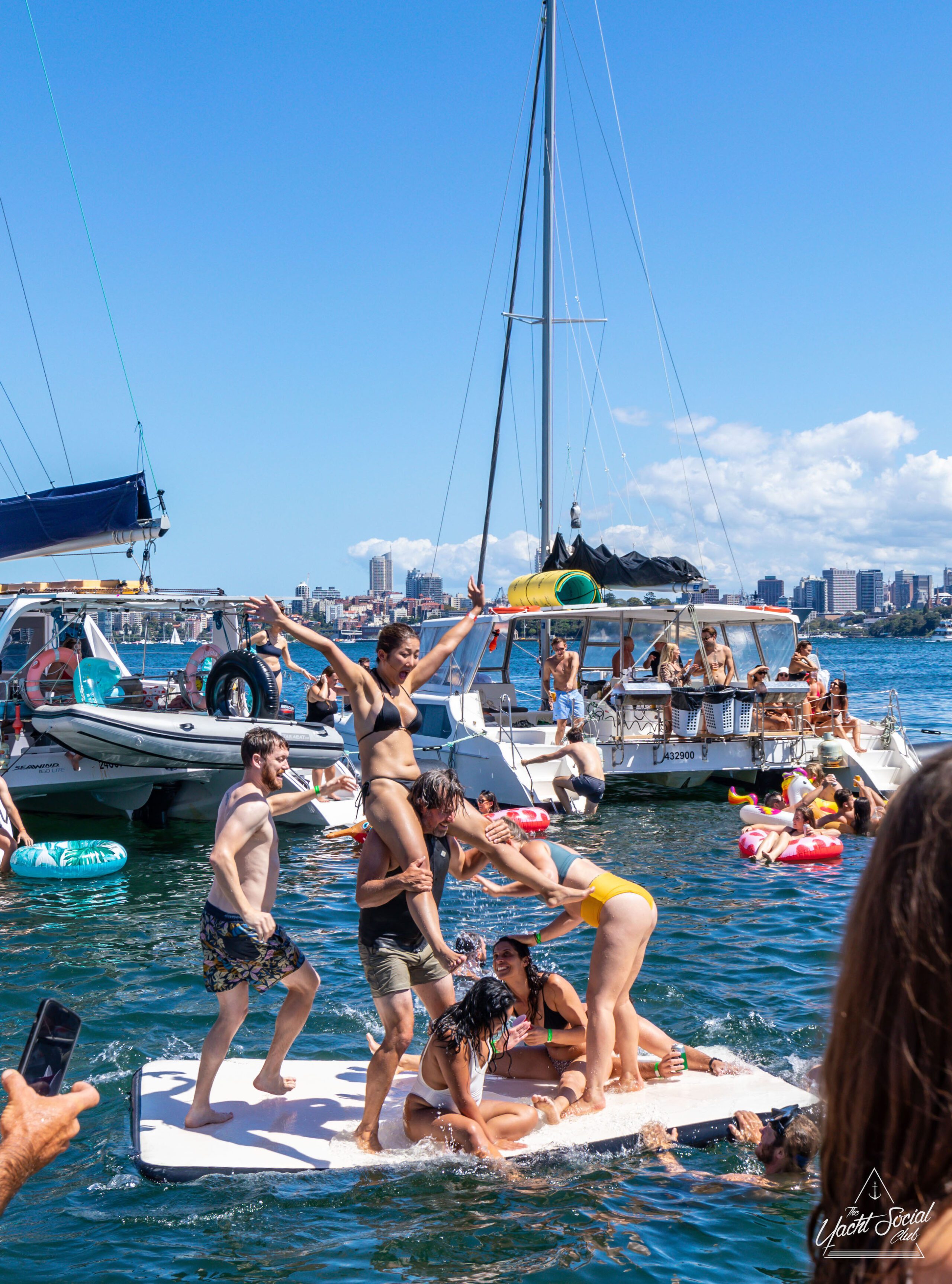 Large group of people in swimwear enjoying a lively Sydney boat party hire on a yacht-filled water, with many on inflatables, against a backdrop of city skyscrapers and a clear blue sky.