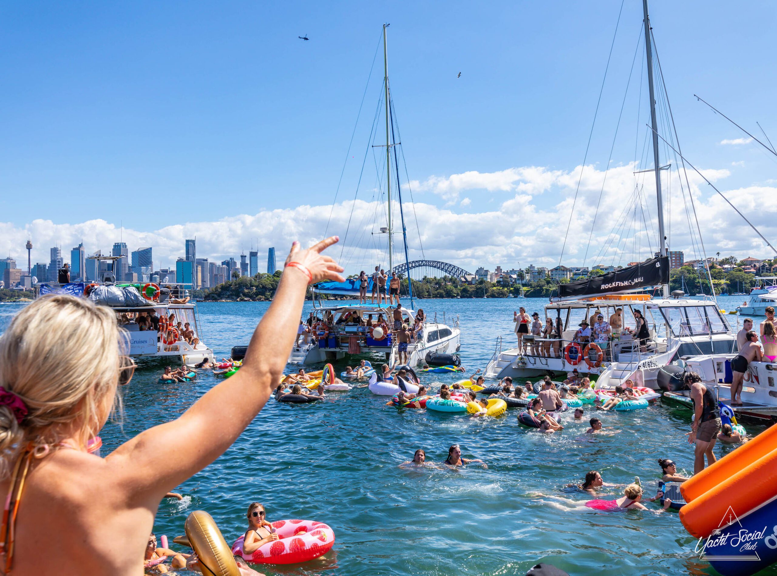 A crowd enjoys a sunny day on the water with various inflatable floats and boats. Sydney skyline, including the Harbour Bridge, is visible in the background. In the foreground, a woman waves from a luxury yacht hire in Sydney.